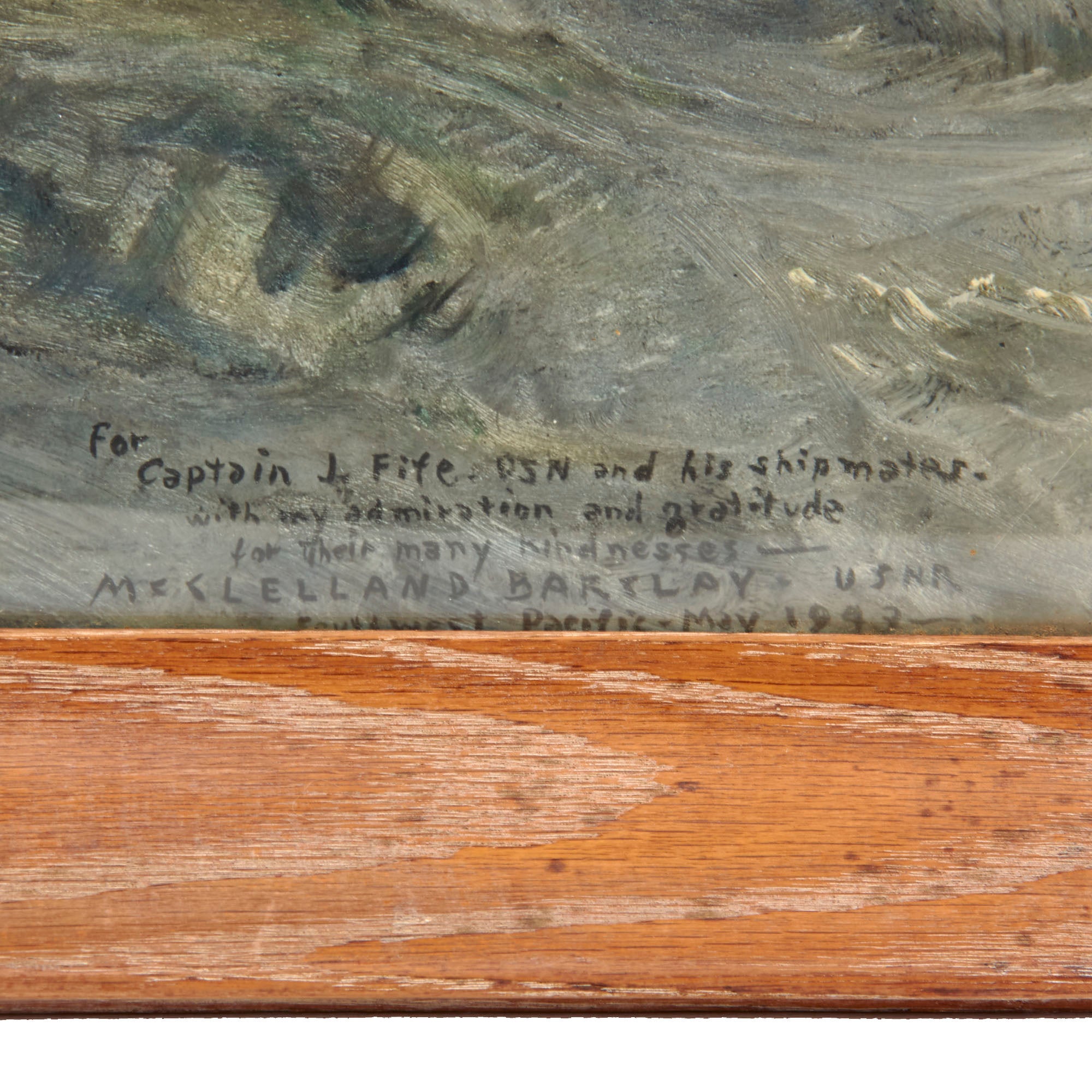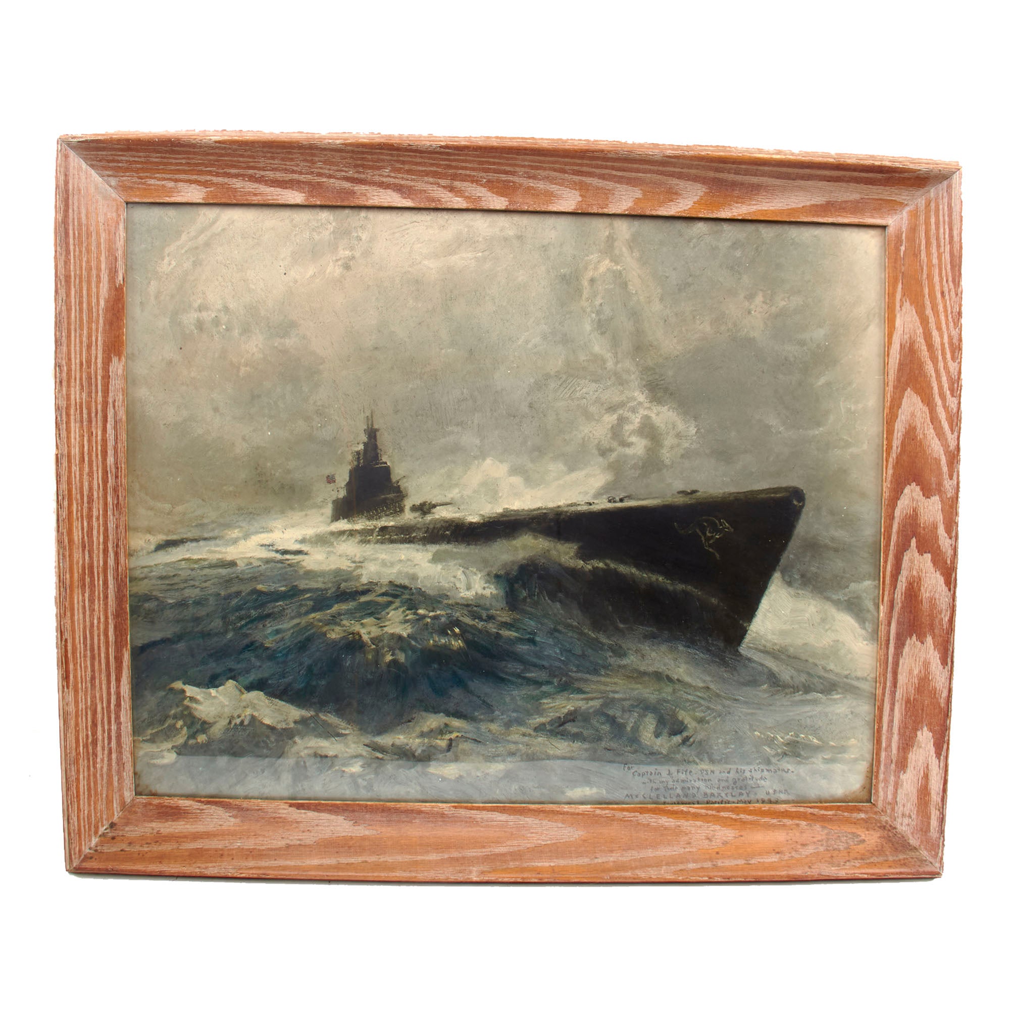 - Roughly 22 x 27” framed copy of painting of a Submarine, presented to Captain J. Fife and his shipmates, this is likely a copy furnished to McGibbon. Presented by McLelland Bartley USNR in May 1943.