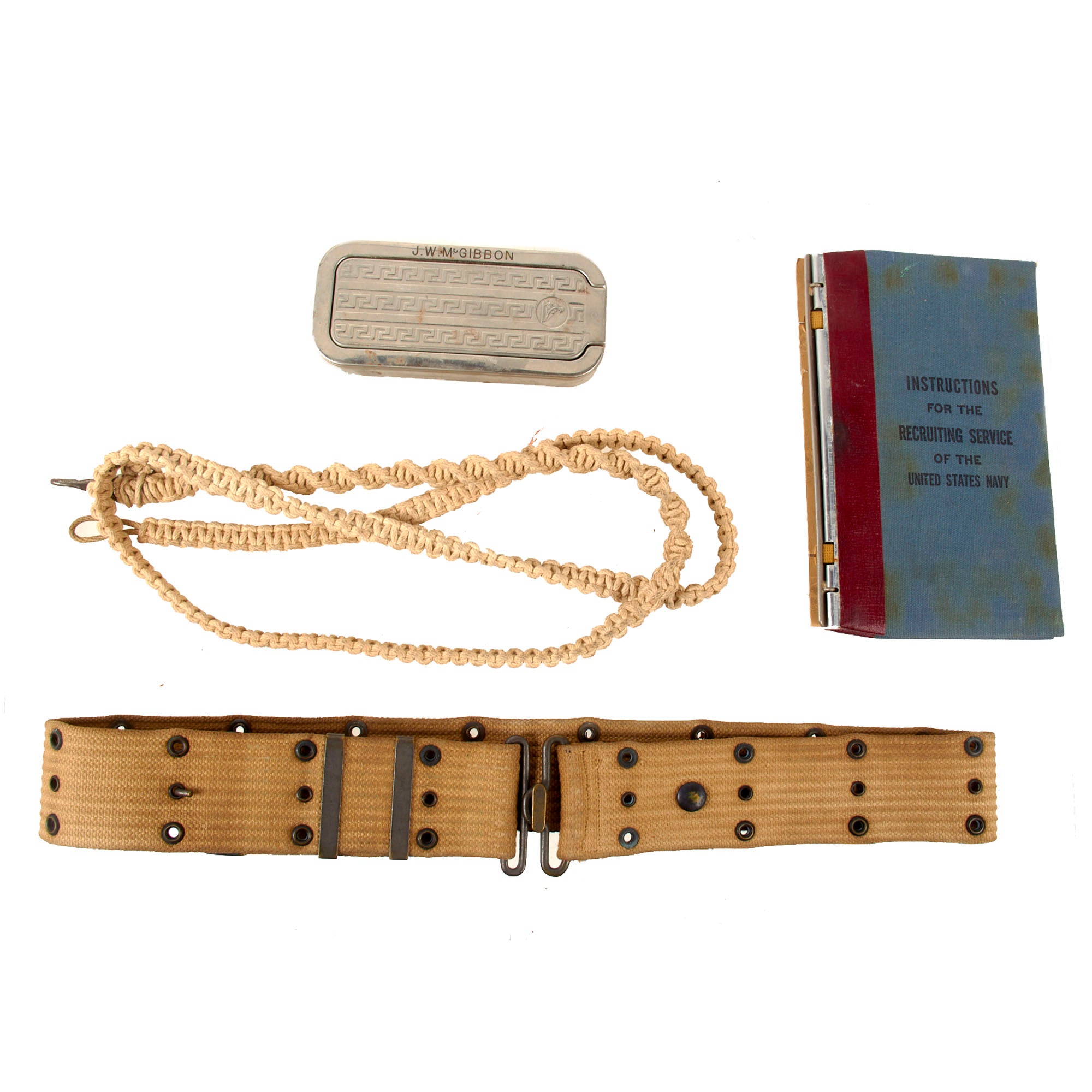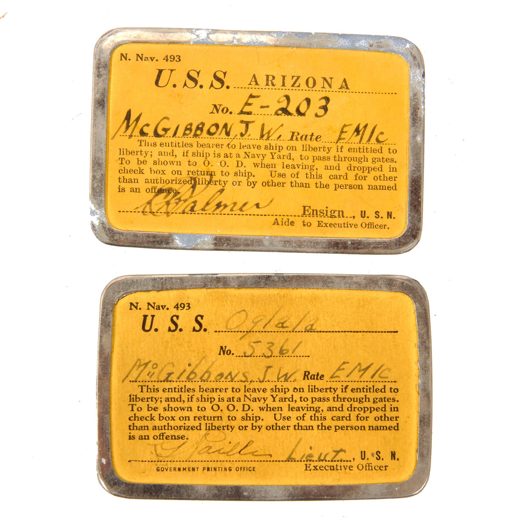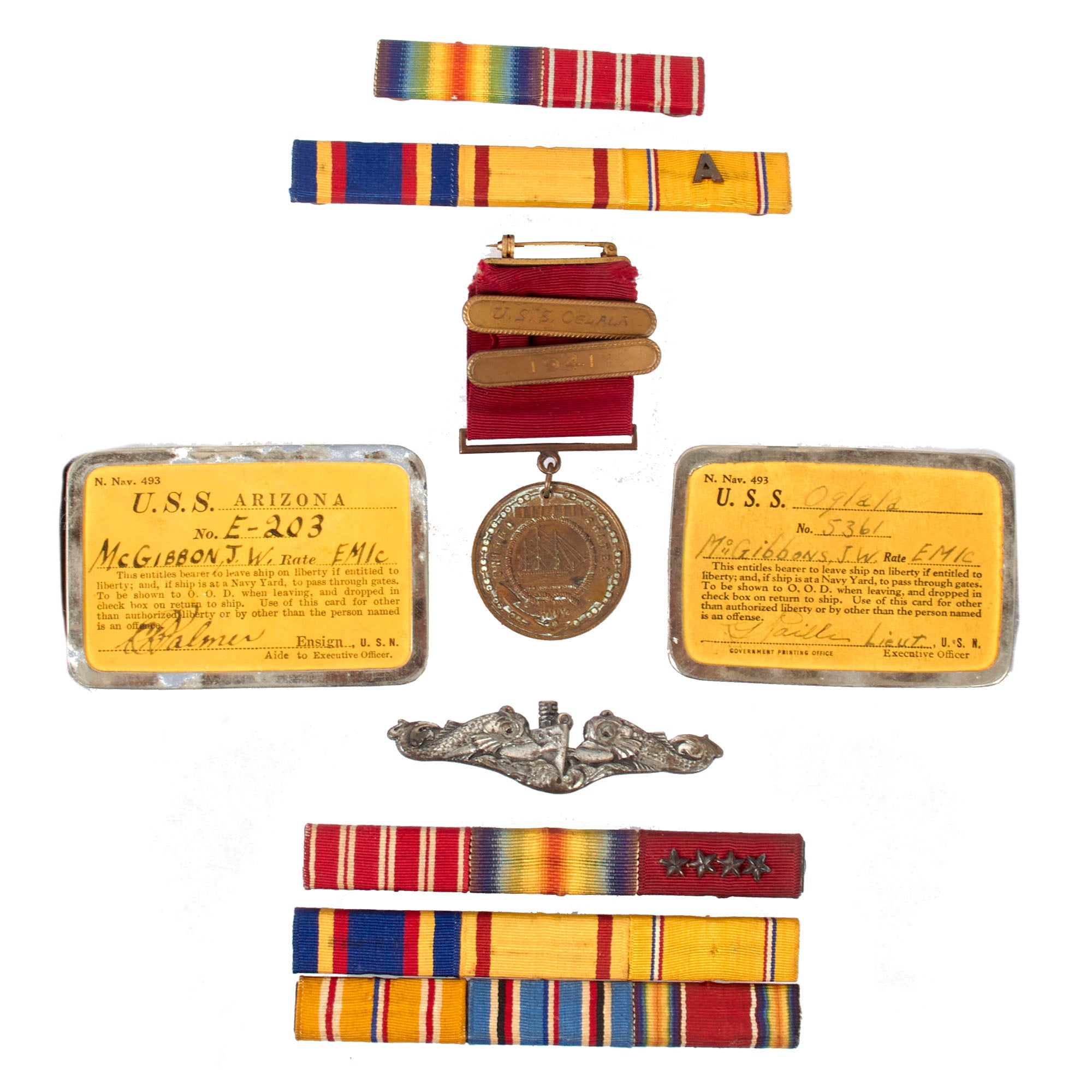 Original Items. One-of-a-Kind Group. This is the outstanding and extensive grouping of John William McGibbon of the U.S. Navy, who served with the Atlantic Fleet during WWI, in China during the 1930s, and aboard the USS Oglala during Pearl Harbor. On the morning of 7 December 1941 USS Oglala, flagship of the Pacific Fleet Mine Force, was tied up outboard of the light cruiser Helena. They were alongside Pier 1010 at the Pearl Harbor Navy Yard, with an eight-foot camel between them. Japanese torpedo planes of the first attack wave hit the cruiser with a single torpedo, which ran under Oglala to hit Helena's starboard side. The torpedo's explosion broke through the minelayer's port bilge amidships, and she rapidly took on water. A bomb that burst nearby caused further damage. With the marginal watertight integrity typical of older ships, Oglala's flooding could not be contained.