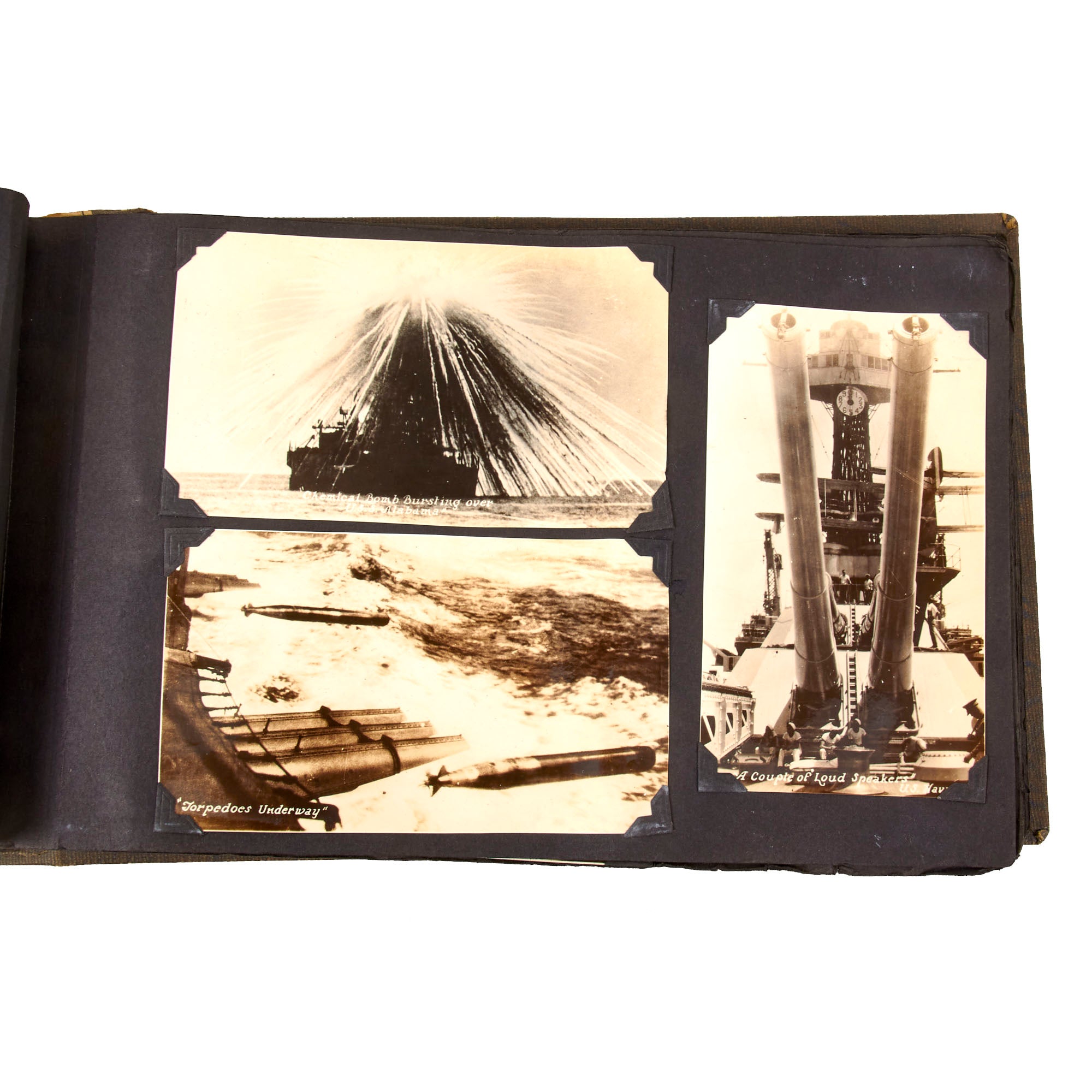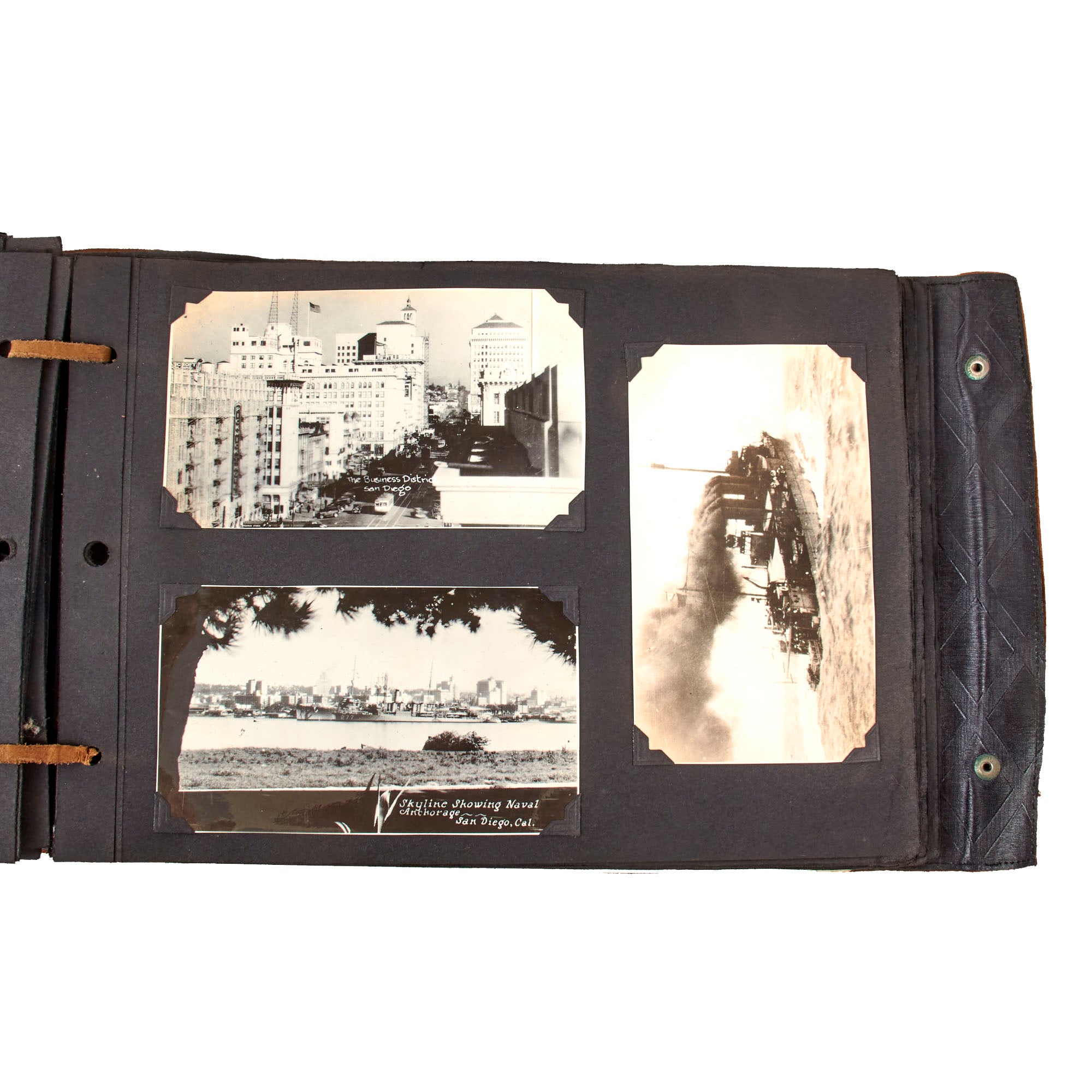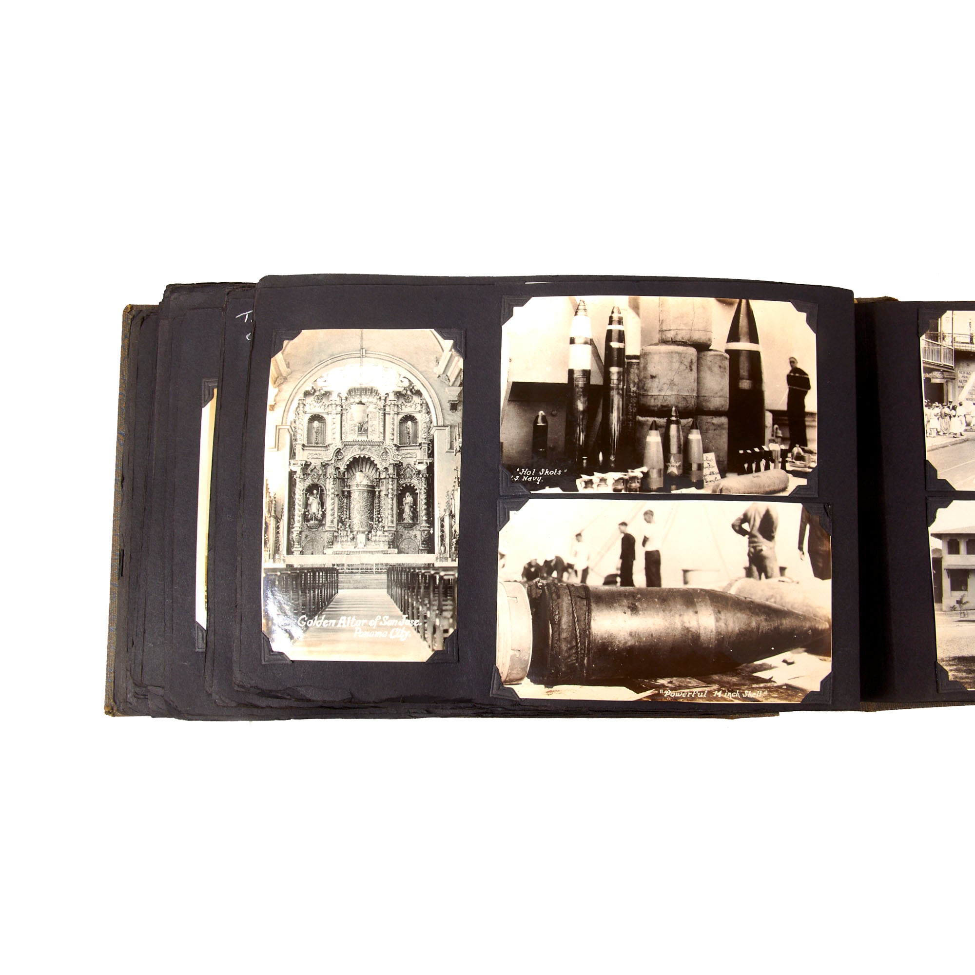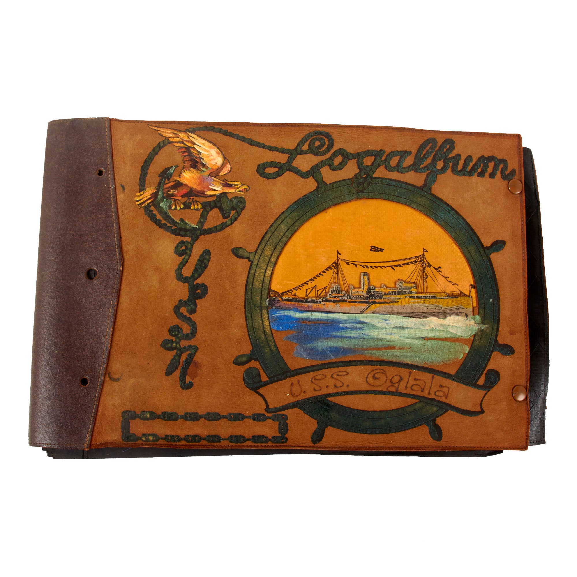 - 8 x 12” scrapbook for USS Oglala, almost all pages are disconnected from the cover and are likely in the wrong order. There are some great shots in this album including two shots of gun crews of the Oglala. There are many photos from the places they traveled, elephant photos, native photos, and in the back were two large scale photos of German submarines during WWI, the first showing a German submarine in Spain in 1918, and the other showing U-56 with an interesting camouflage pattern before entering Santander. There are a lot of tourist photos in here too but they are likely around 25-30 great original shots.