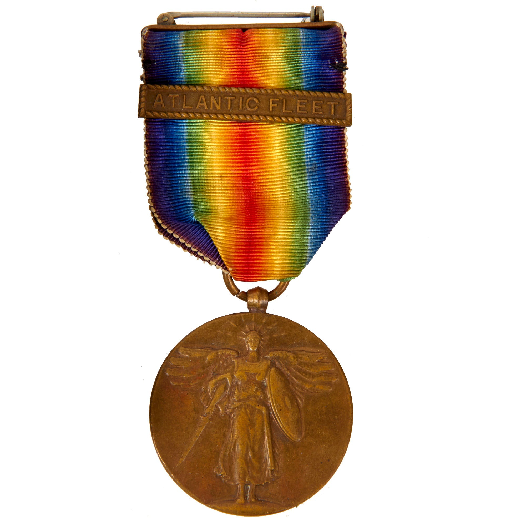 - McGibbon’s WWI Victory Medal with Atlantic Fleet clasp, very rare in likely original box from private jeweler.