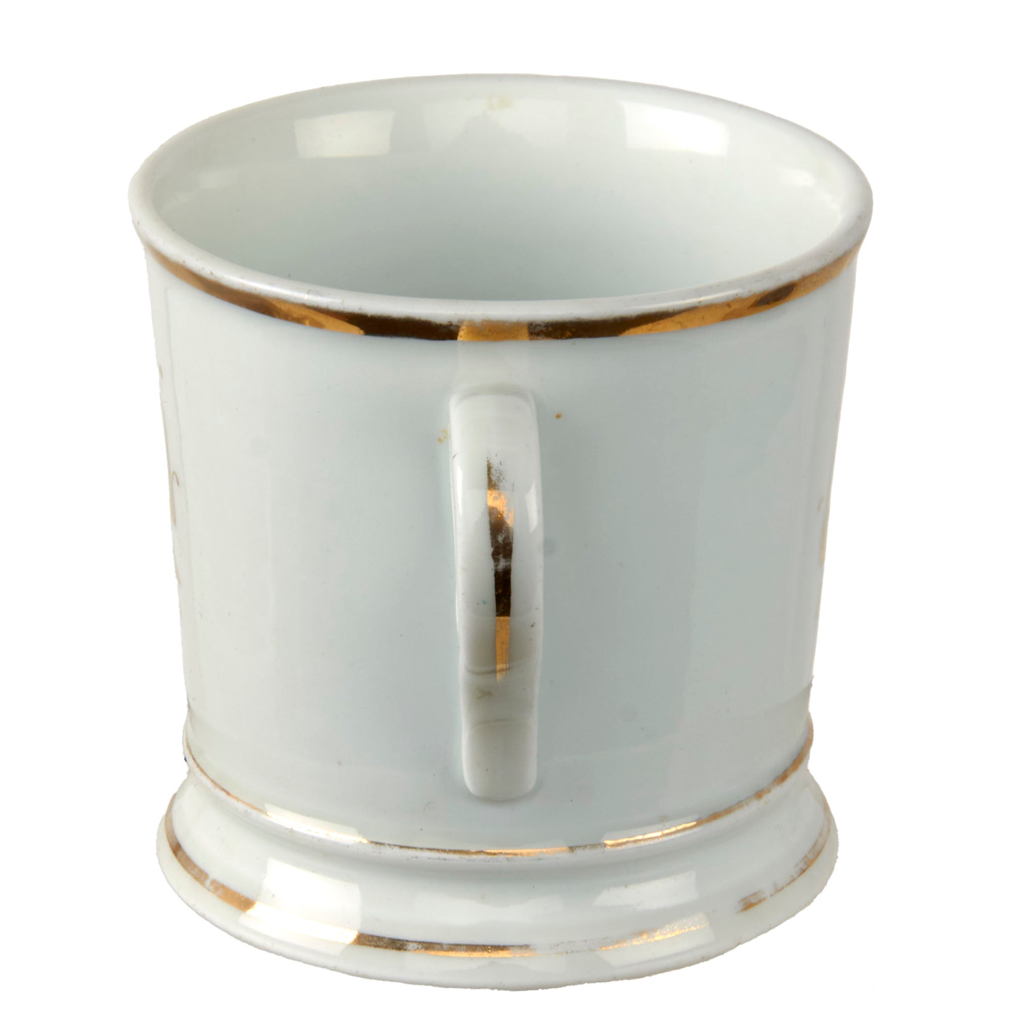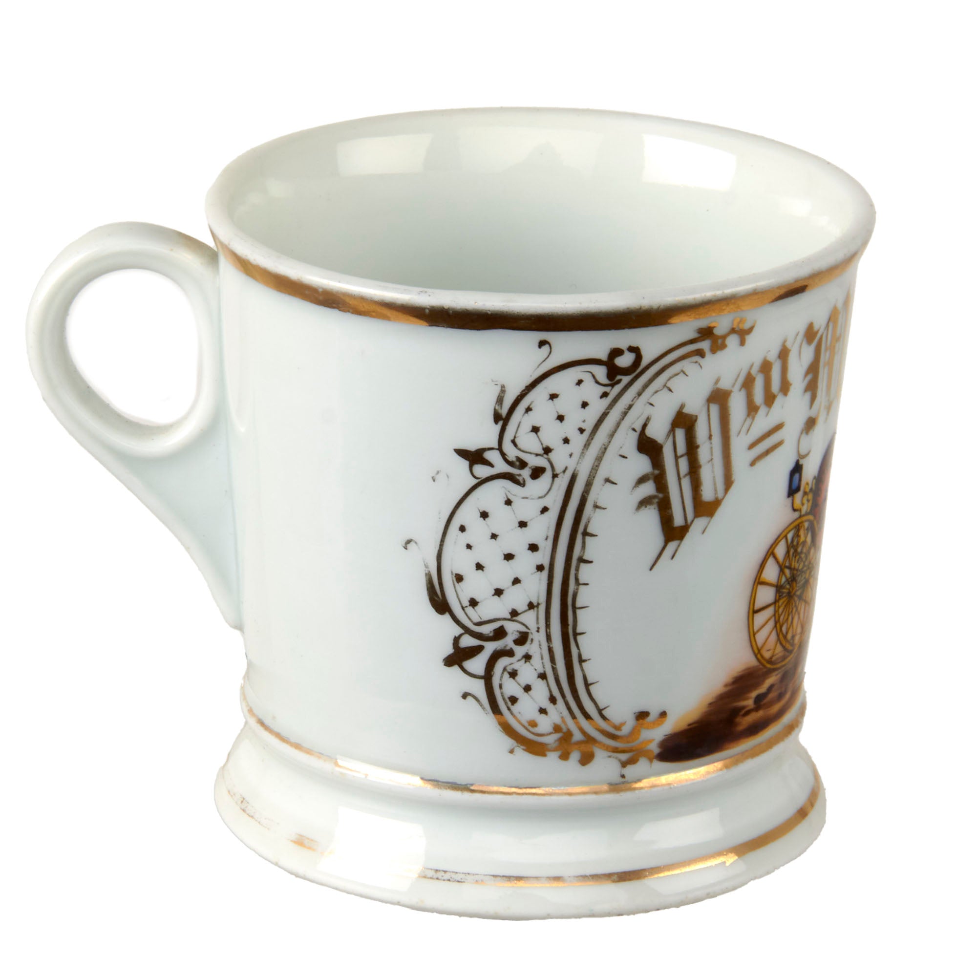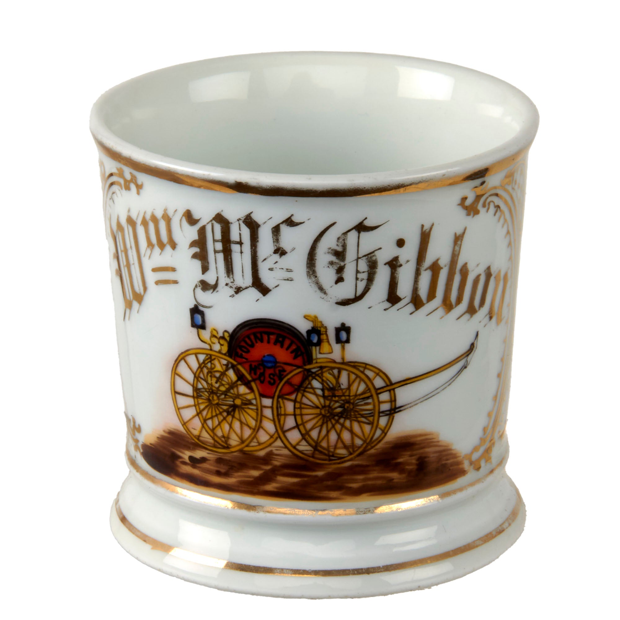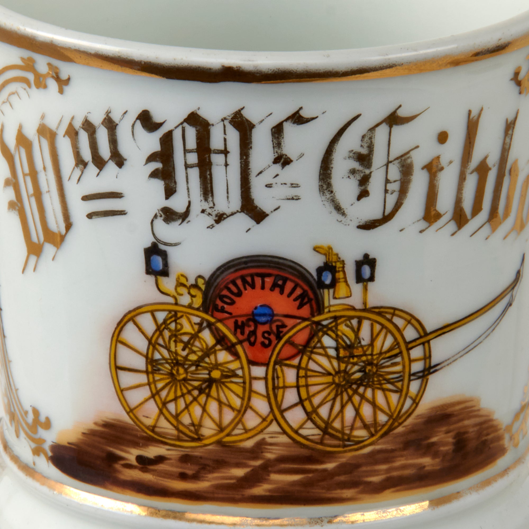- Porcelain cup with gold-finish name in gothic text with old style fire truck, likely presented to him.