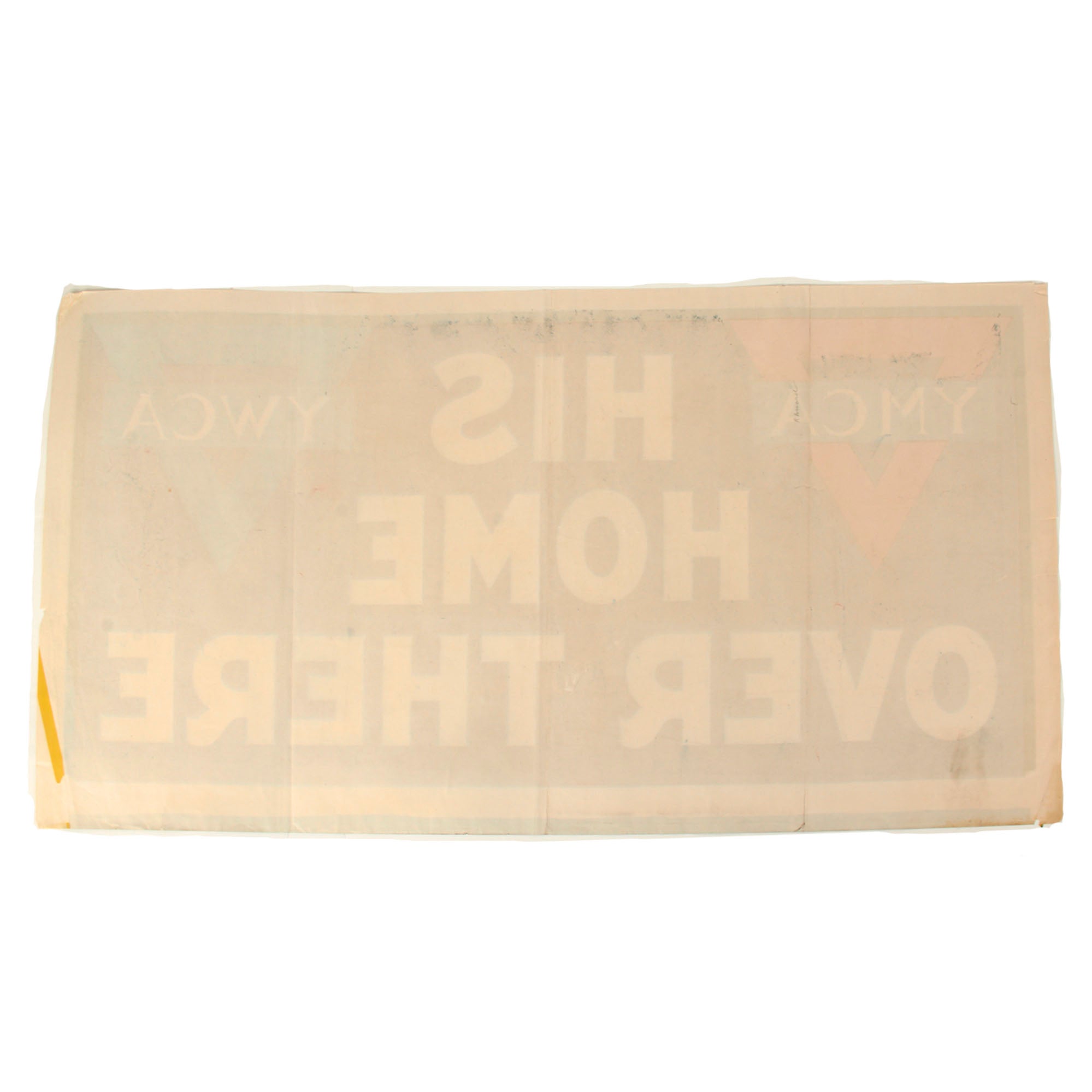 This is a fantastic poster likely hung up at a YMCA Donation drive or in a YMCA/YWCA hall, measuring a large 21⅝ x 41” with the logos of the YMCA and YWCA over HIS HOME OVER THERE. The poster has some tearing and appears to have been cut incorrectly when made with a long stretch of blue at the bottom, but this could be cut. A great candidate for framing!