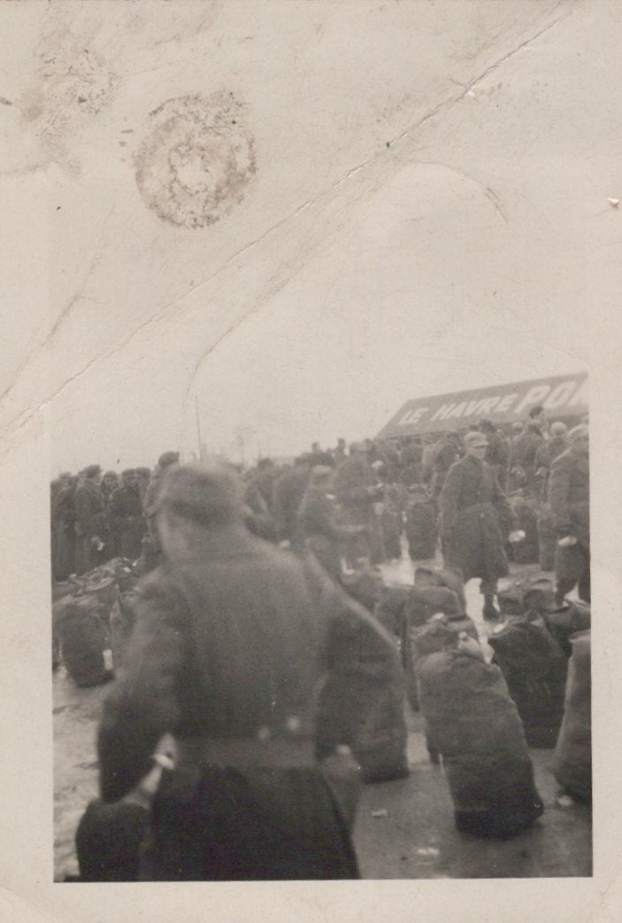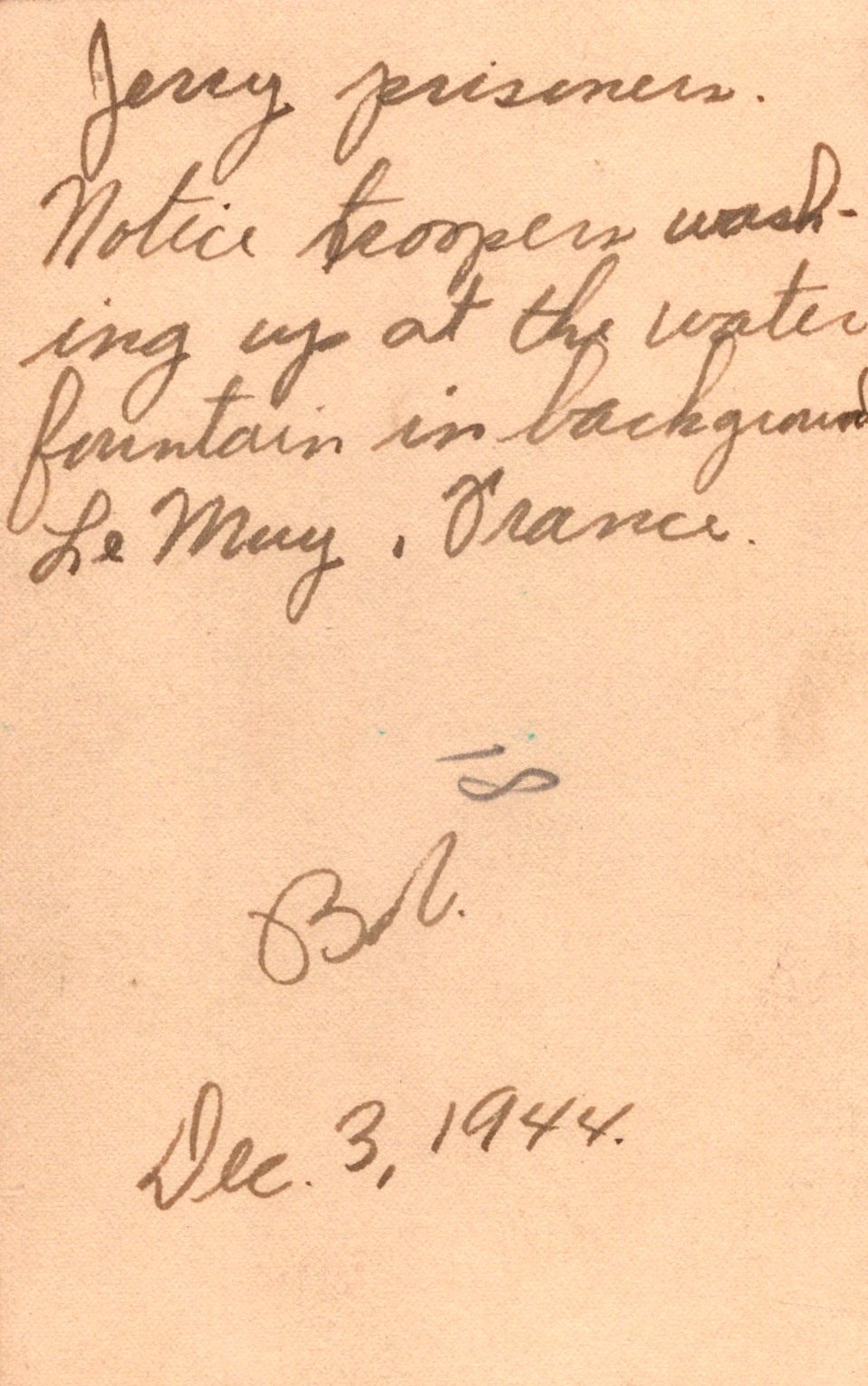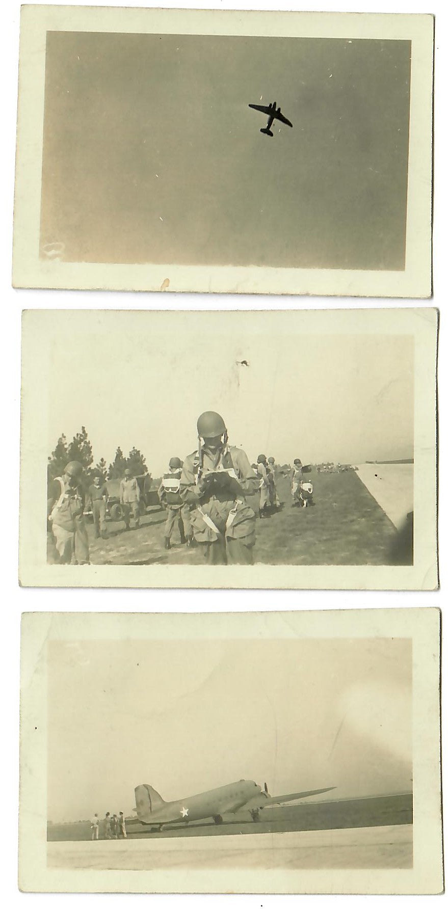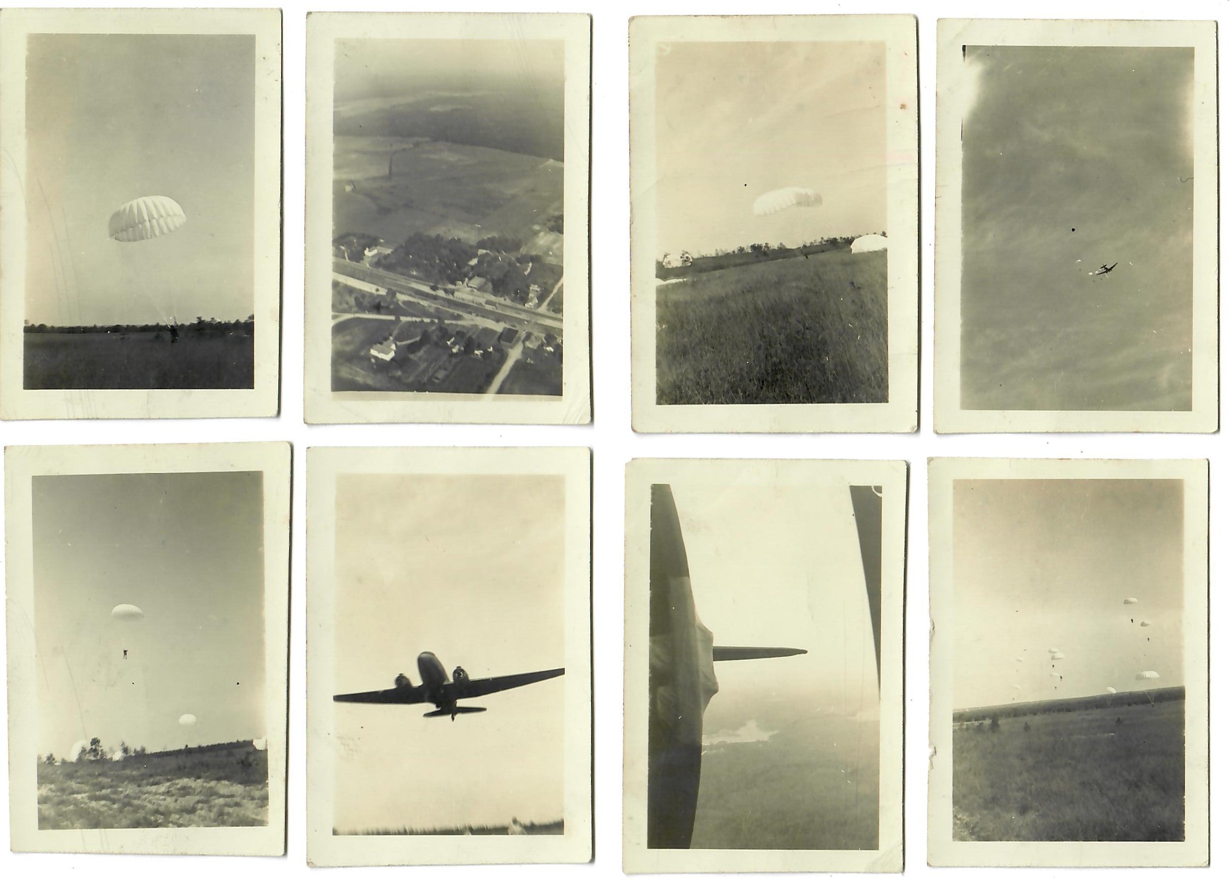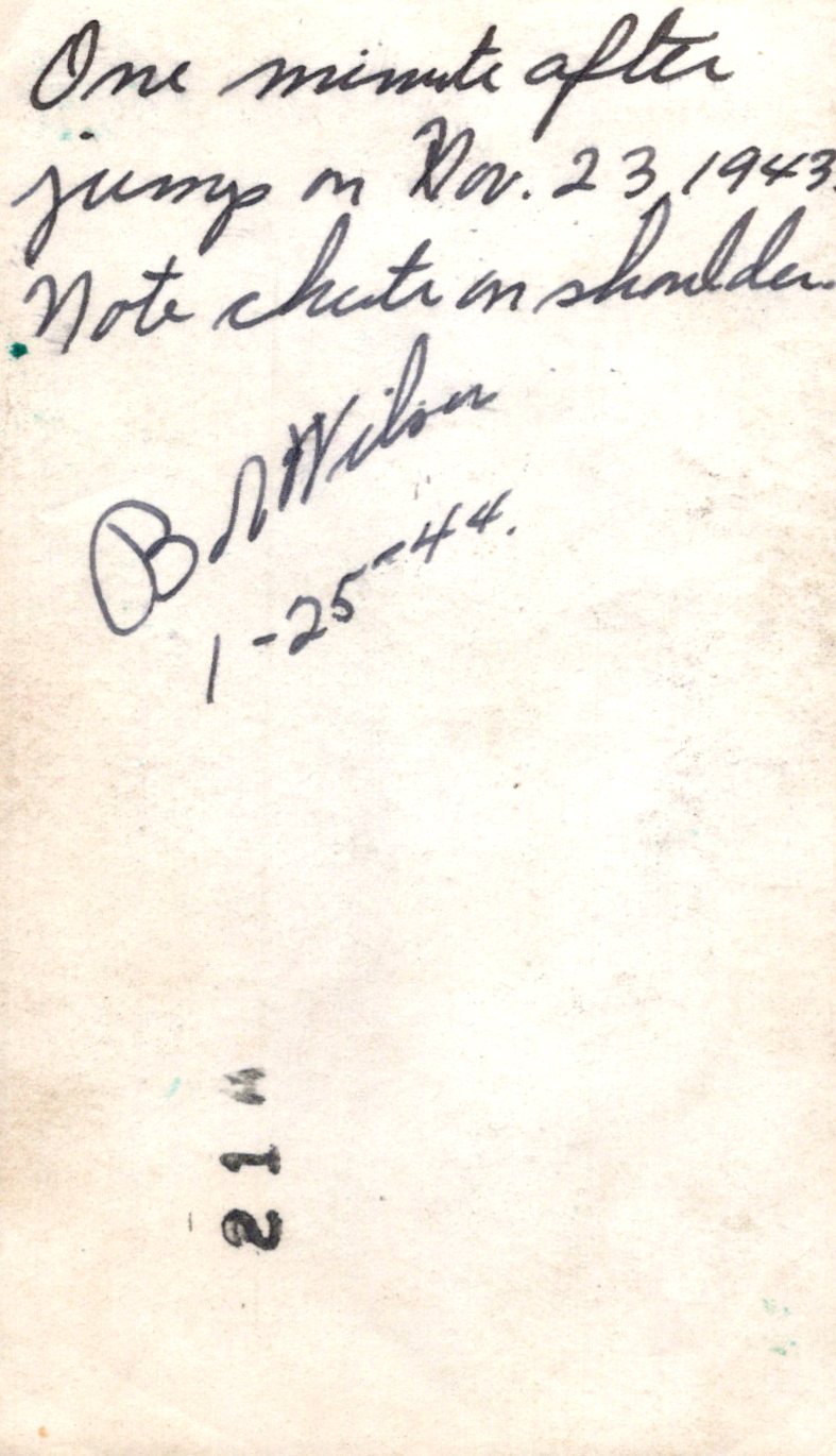 - 22 Original unpublished photographs, most with inscriptions and dates on the back, most from training. There are 12 small photos taken of men parachuting, the plane they jumped from, the view outside of the plane, and a photo of his C.O. recording which men jumped for credit. Some of the inscriptions are truly amazing. There’s a photo of gliders, two of tanks with one overturned, a photo of wrecked gliders in a field. There’s a great photo of him after landing posed with his rifle, dated November 23rd, 1943. The best two photographs are one of captured German prisoners dated December 3rd, 1944, and one of two Paratroopers with their flag armbands, named Larivey and Jones D-Day on the back. This is a fantastic original unpublished photograph taken on D-Day.