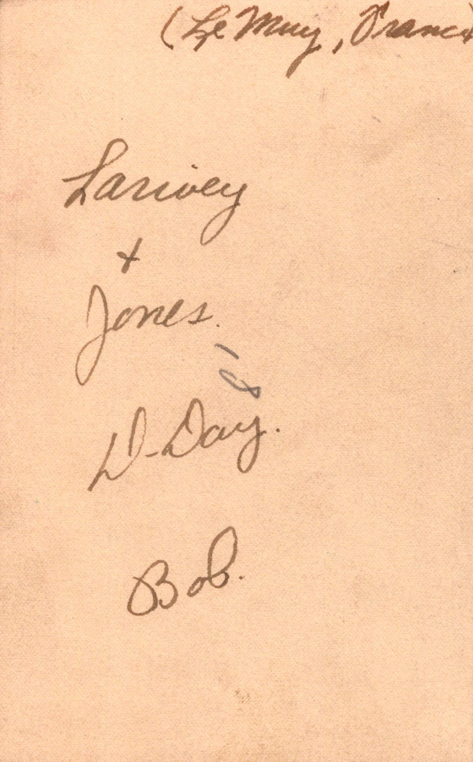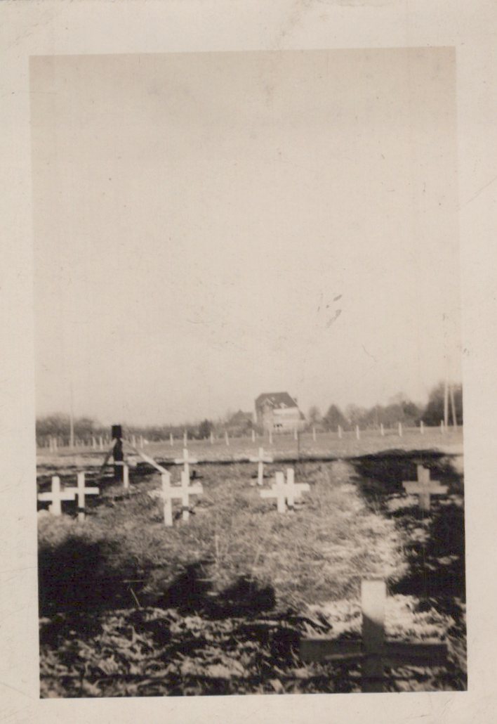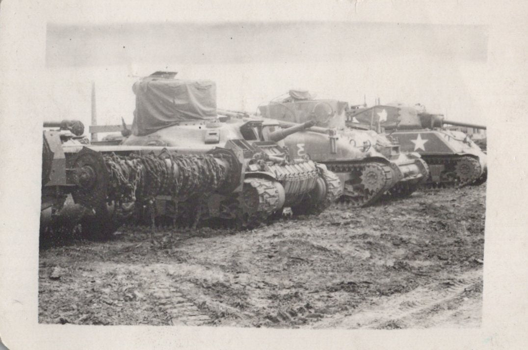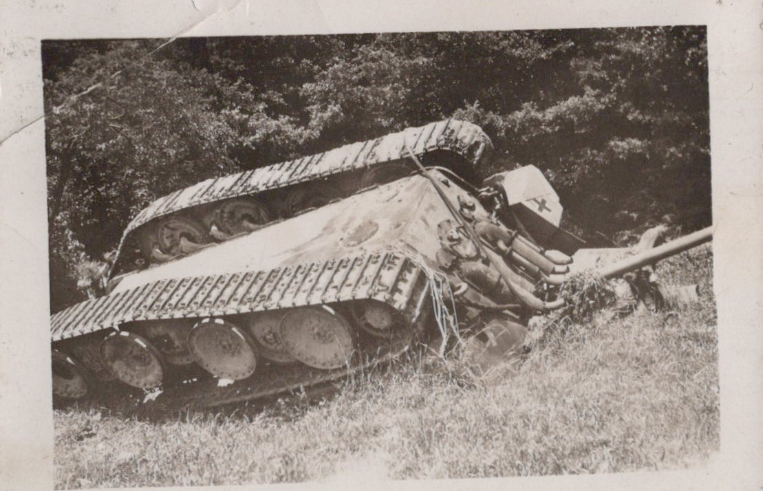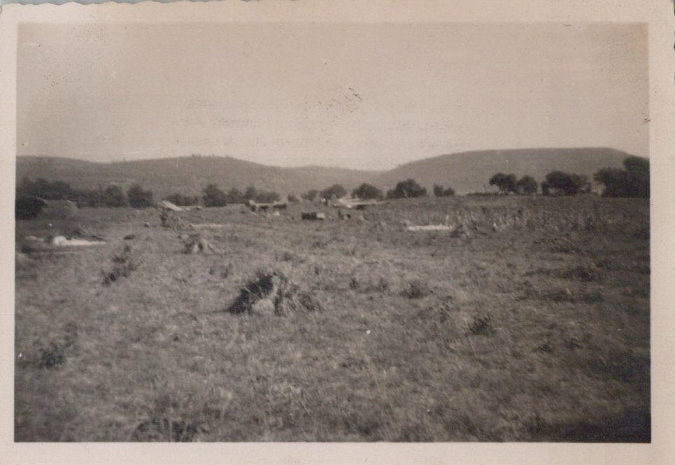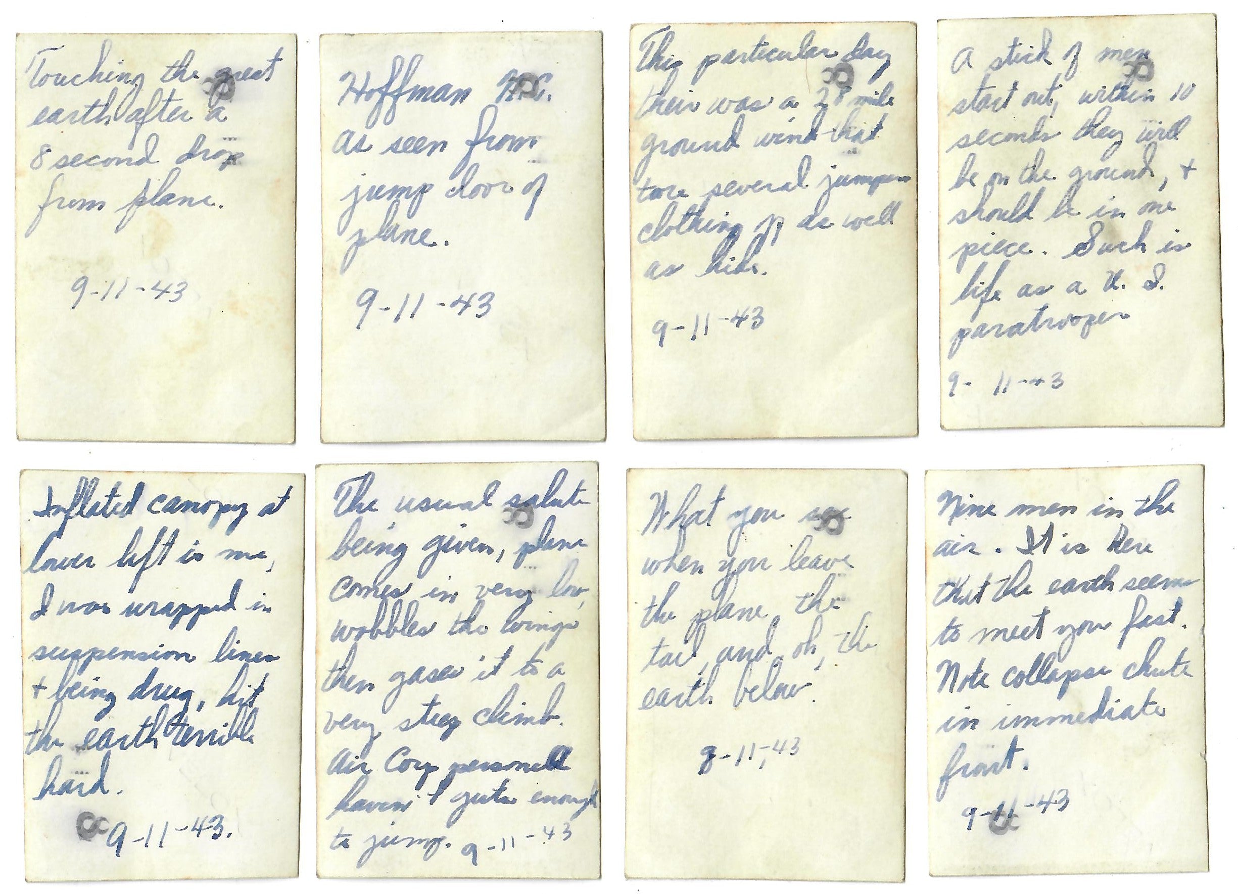- 22 Original unpublished photographs, most with inscriptions and dates on the back, most from training. There are 12 small photos taken of men parachuting, the plane they jumped from, the view outside of the plane, and a photo of his C.O. recording which men jumped for credit. Some of the inscriptions are truly amazing. There’s a photo of gliders, two of tanks with one overturned, a photo of wrecked gliders in a field. There’s a great photo of him after landing posed with his rifle, dated November 23rd, 1943. The best two photographs are one of captured German prisoners dated December 3rd, 1944, and one of two Paratroopers with their flag armbands, named Larivey and Jones D-Day on the back. This is a fantastic original unpublished photograph taken on D-Day.