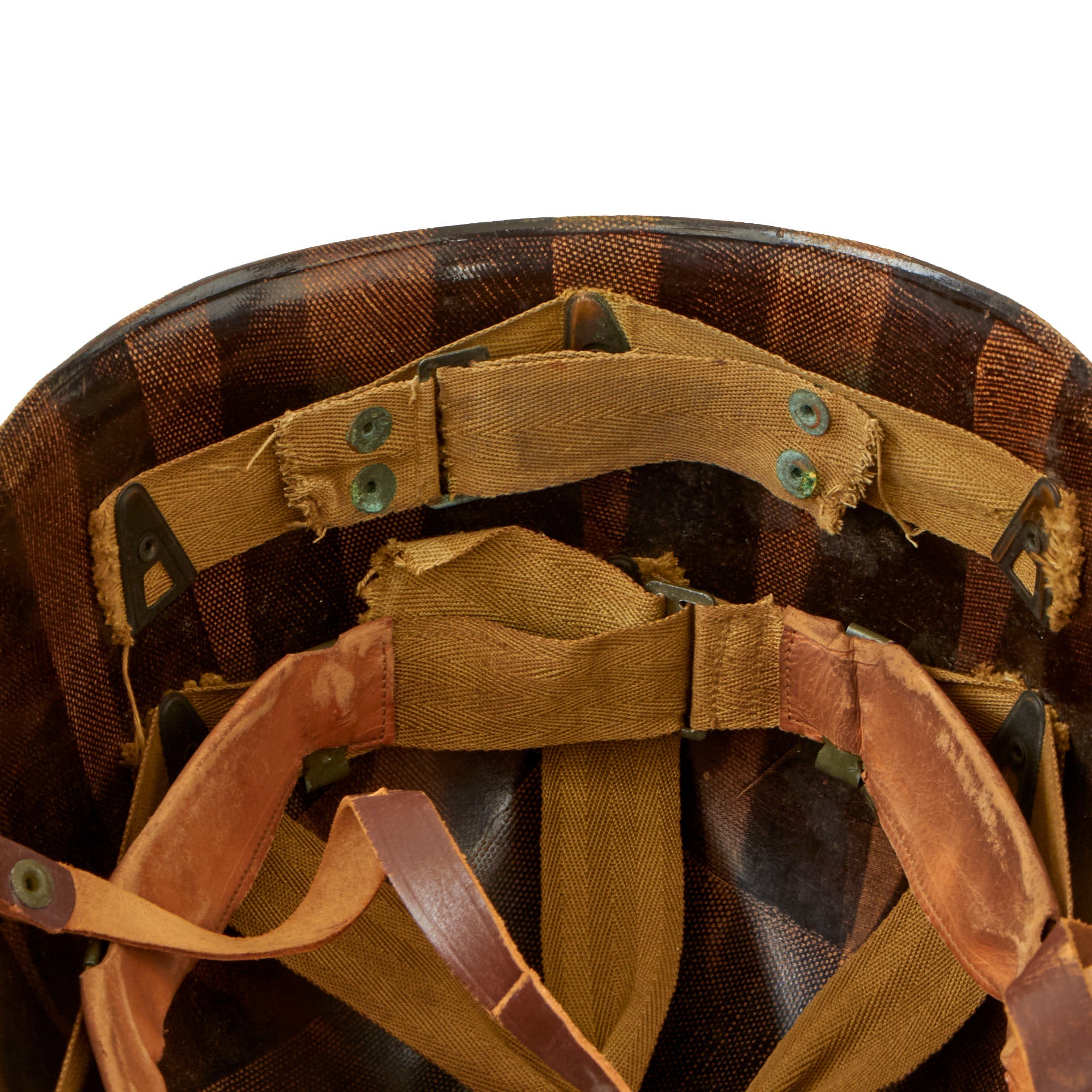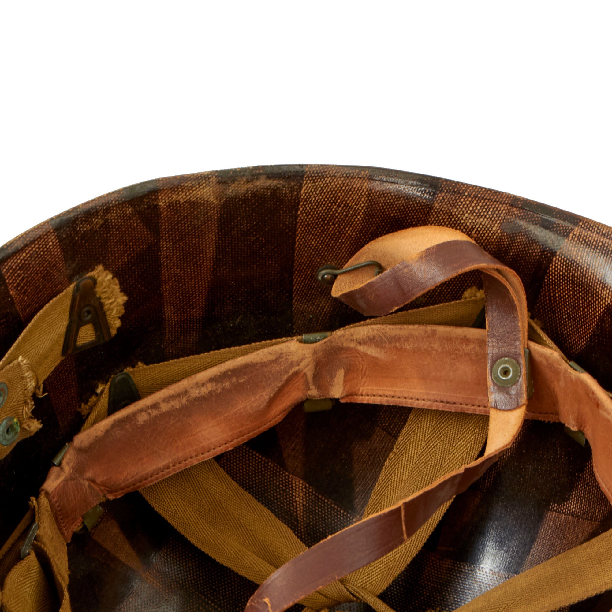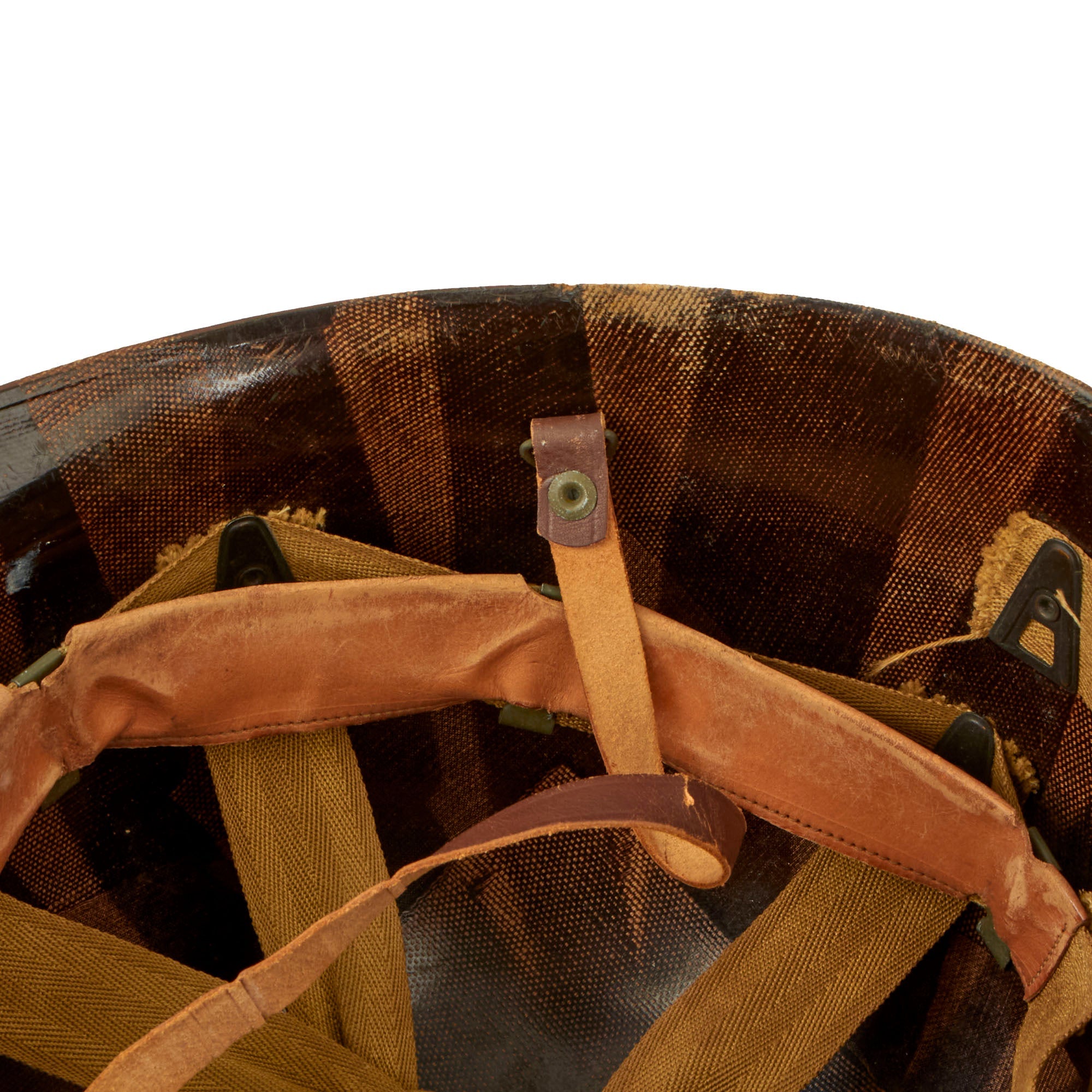 This true US WWII M-1 helmet liner can be identified through the frontal eyelet hole. Other correct WW2 features include cotton herringbone twill (HBT) cloth suspension. This HBT suspension is held tightly within the M-1 helmet liner by rivets and a series of triangular "A" washers. The three upper suspension bands are joined together with a shoestring. This way the wearer could adjust the fit. The sweatband is present and still in solid condition with areas of wear. The liner chinstrap is present with blackened hardware and is presented in solid condition.