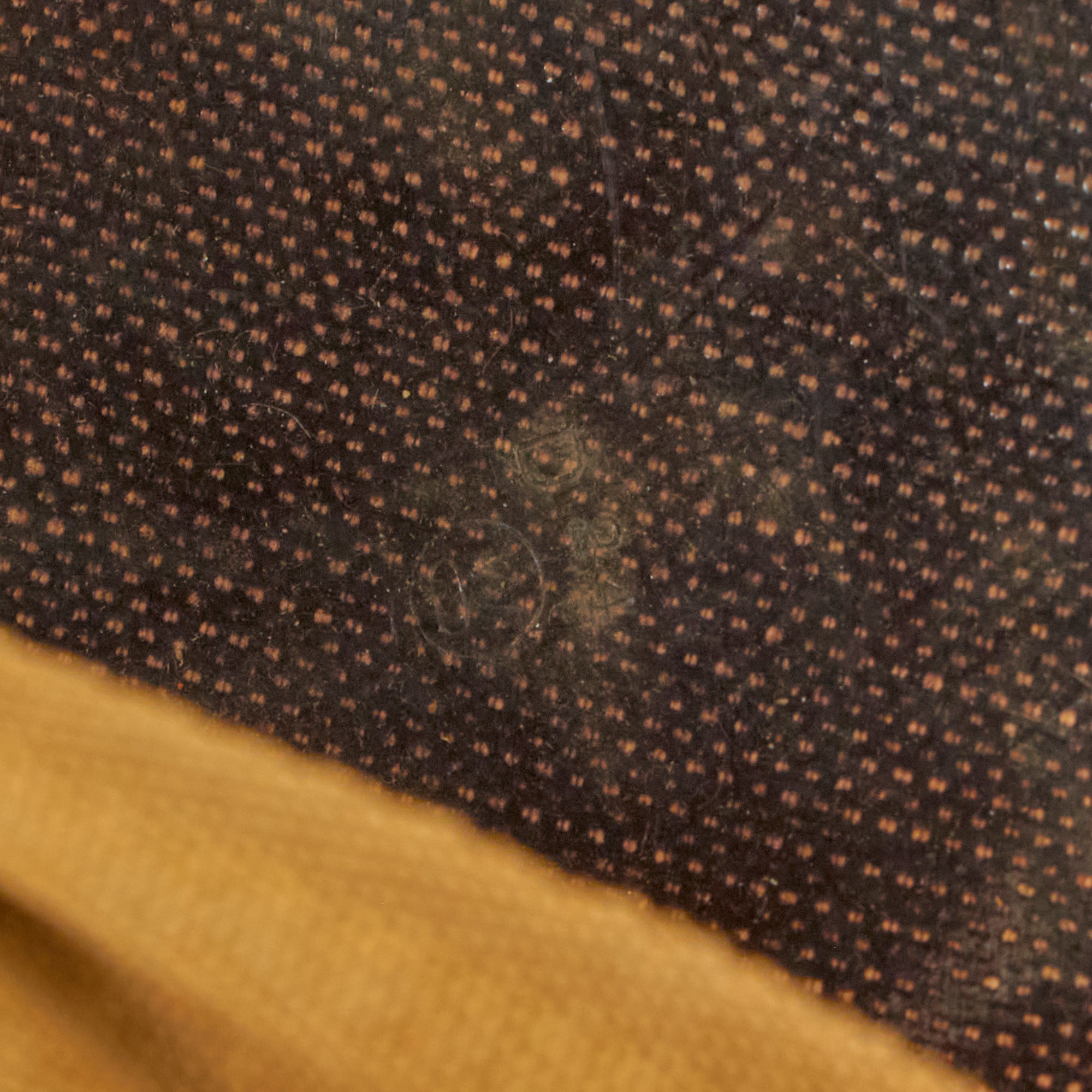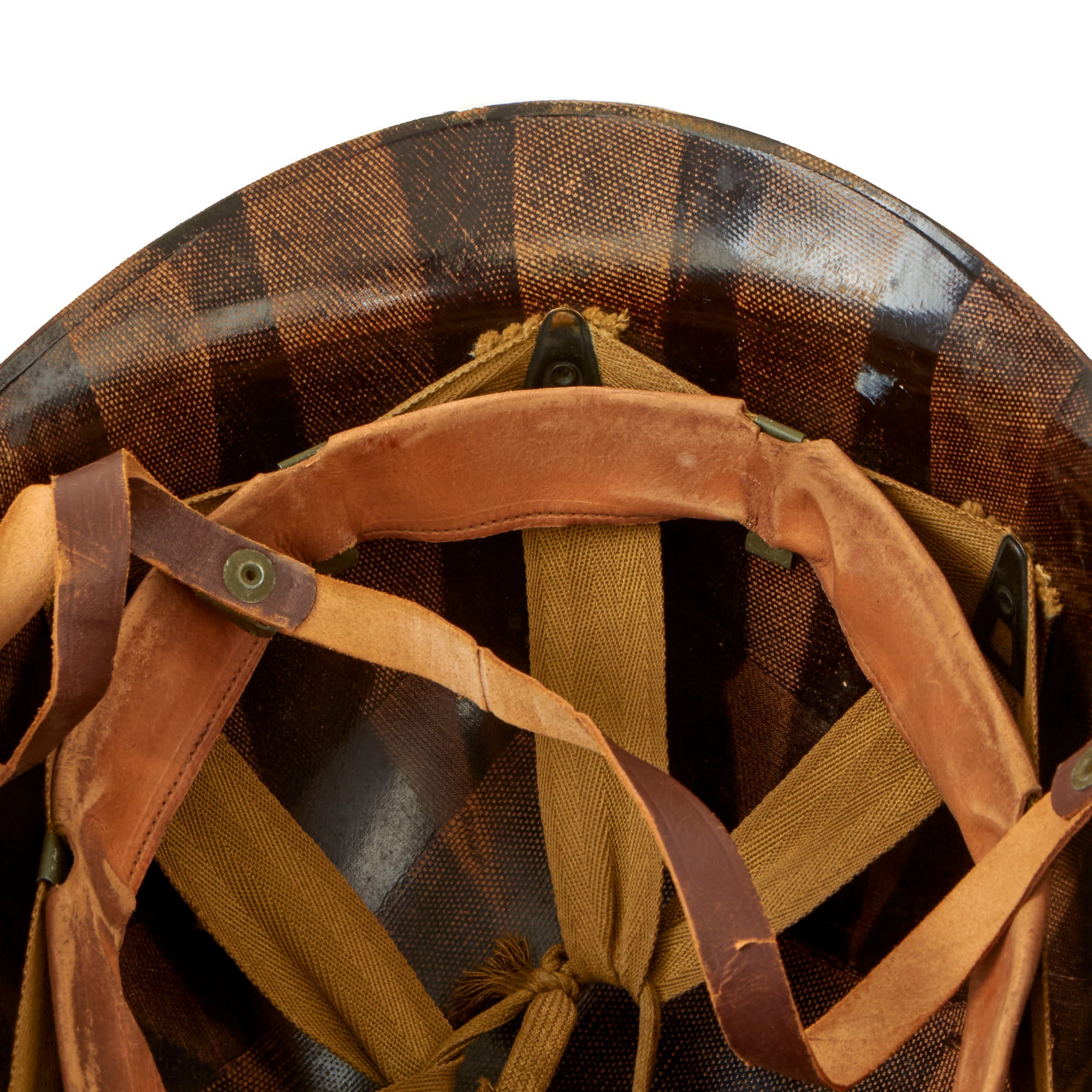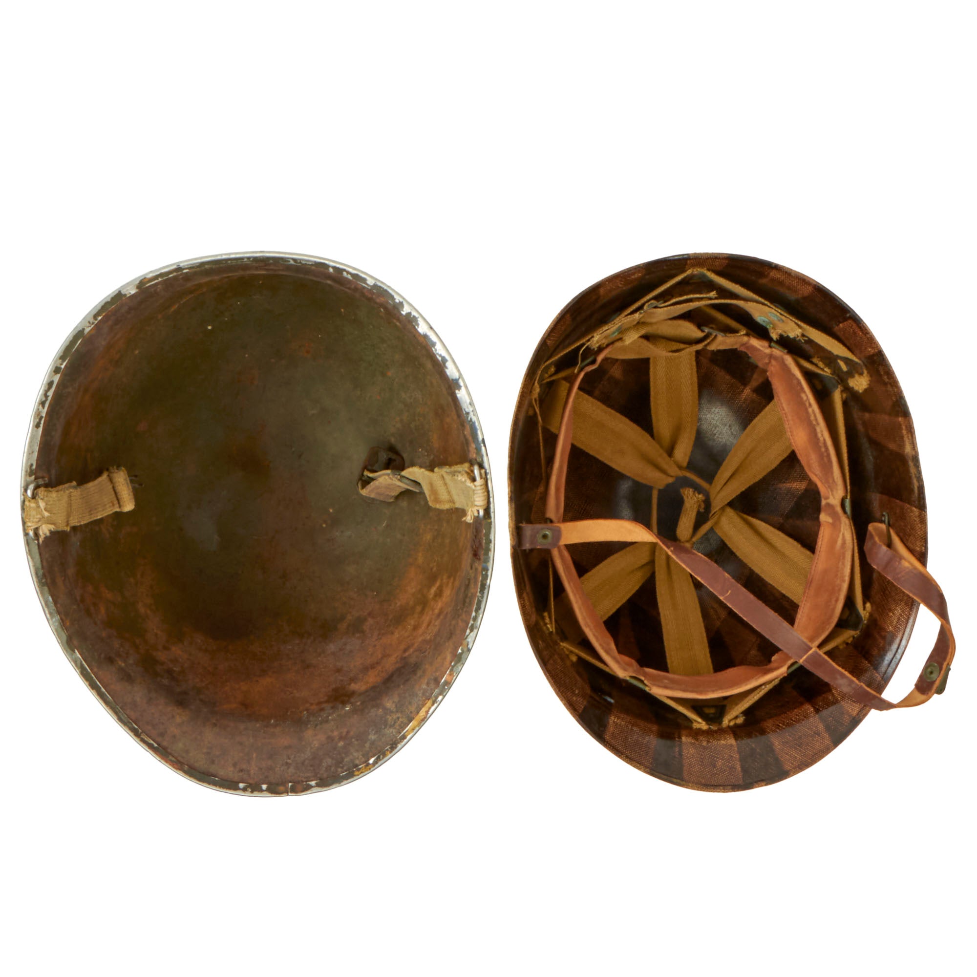 This true US WWII M-1 helmet liner can be identified through the frontal eyelet hole. Other correct WW2 features include cotton herringbone twill (HBT) cloth suspension. This HBT suspension is held tightly within the M-1 helmet liner by rivets and a series of triangular "A" washers. The three upper suspension bands are joined together with a shoestring. This way the wearer could adjust the fit. The sweatband is present and still in solid condition with areas of wear. The liner chinstrap is present with blackened hardware and is presented in solid condition.