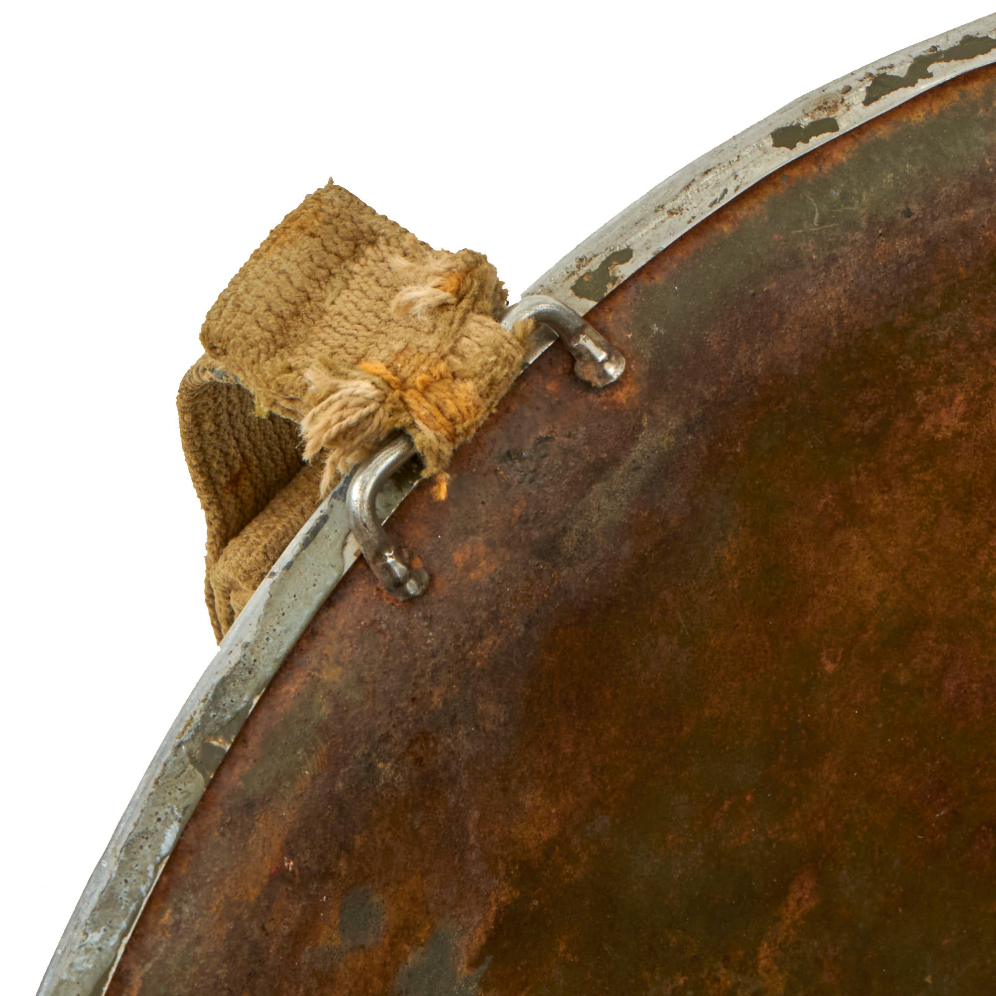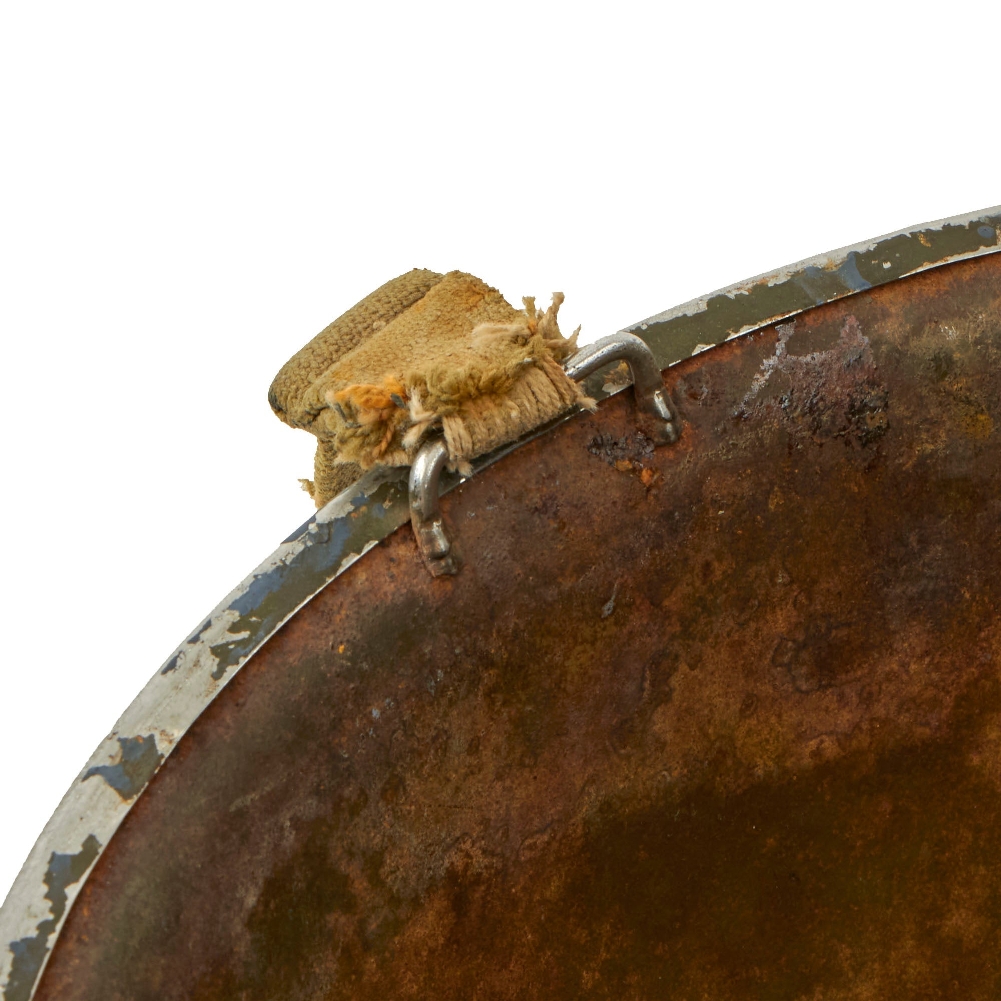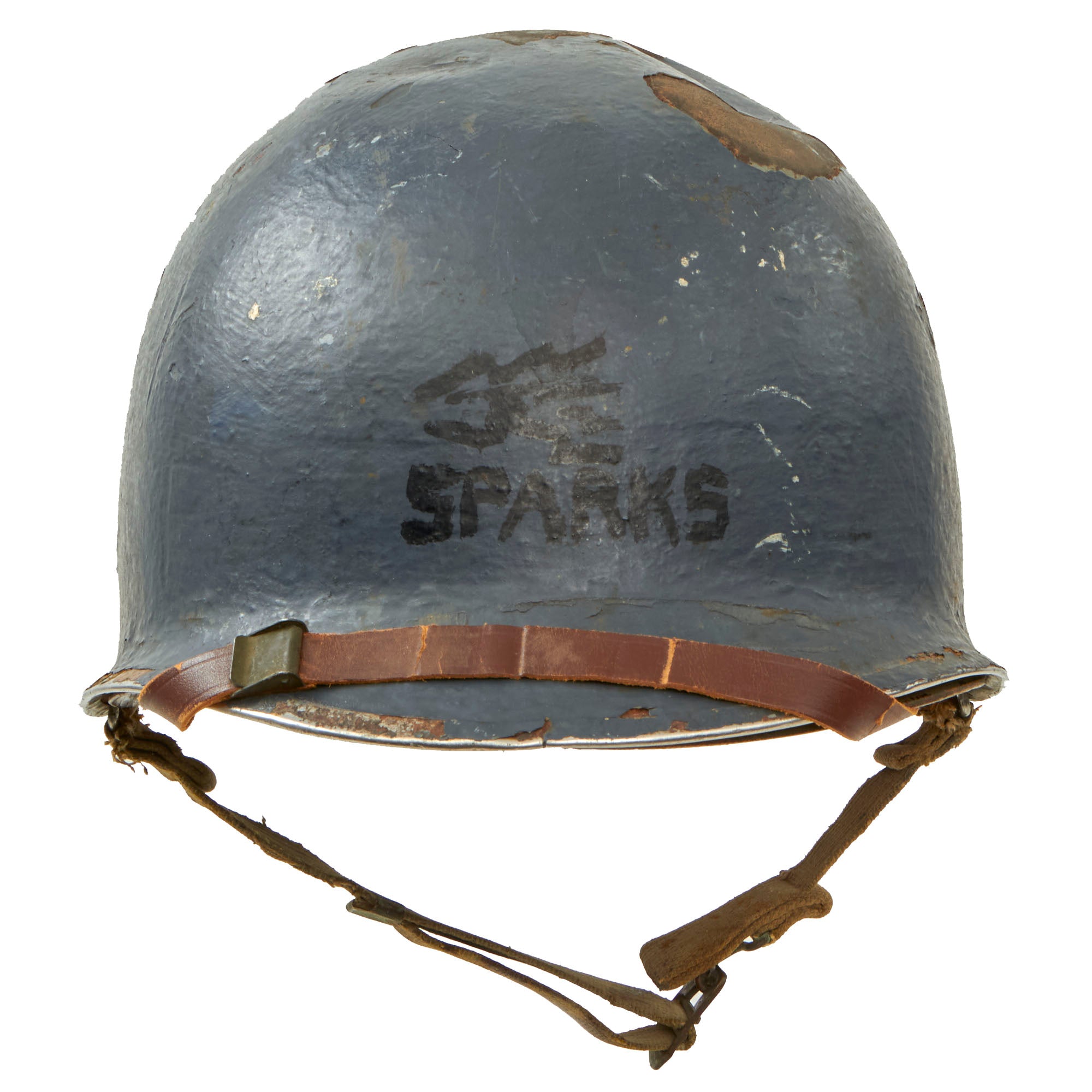 The early M-1 helmet shells had a set of fixed chinstrap loops called "bales" and a stainless steel rim. These rims were both rust resistant and had "non-magnetic qualities" that reduced the chance of error readings when placed around certain sensitive equipment (such as a compass). This helmet is a fine example and still retains many of its original WW2 parts and the shell has all original "corked" grain paint. It does look to have seen a good amount of wear but no intentional abuse. The chinstrap is still present with the correct early war brass hardware.