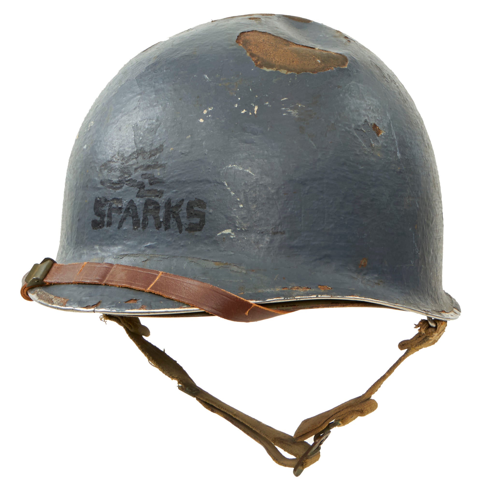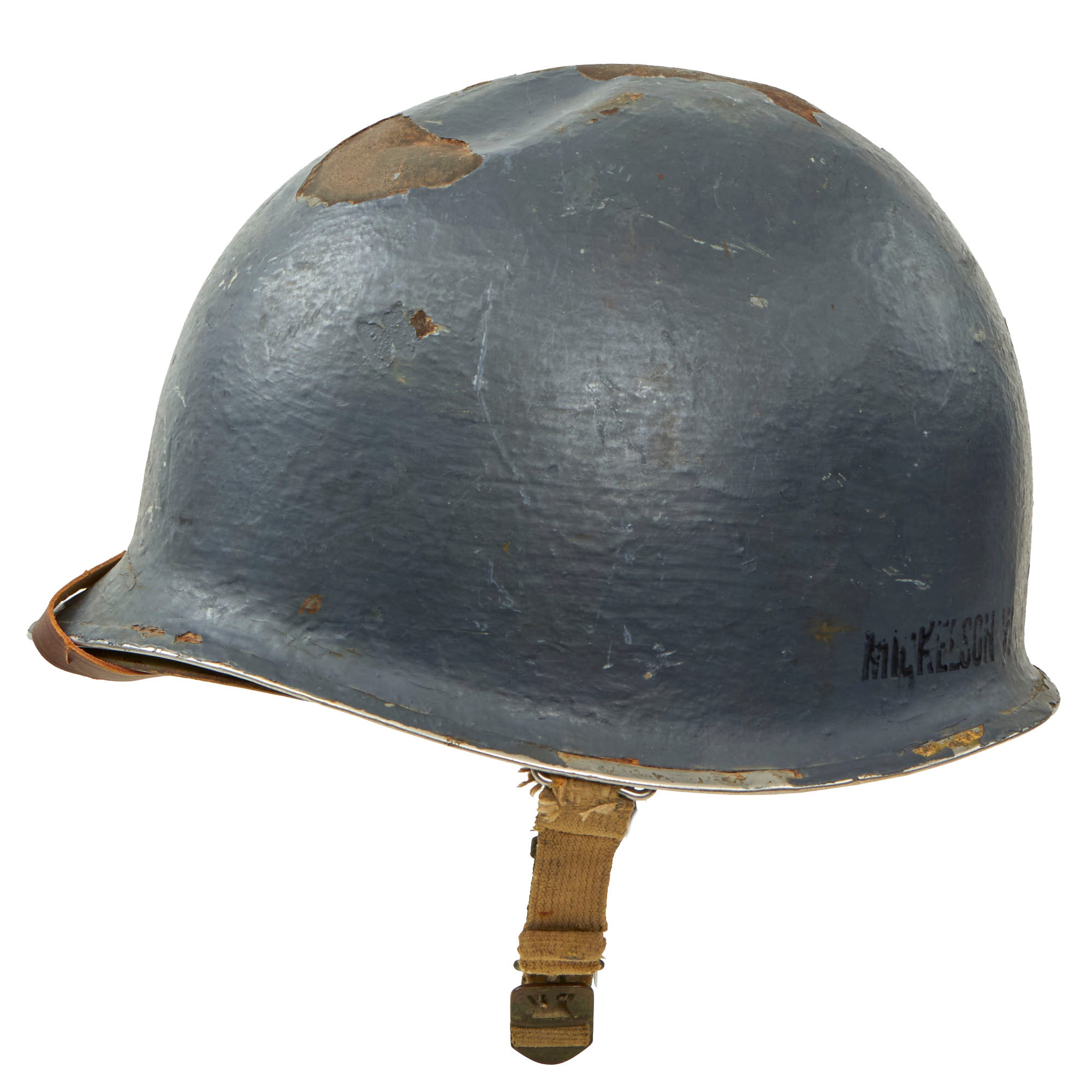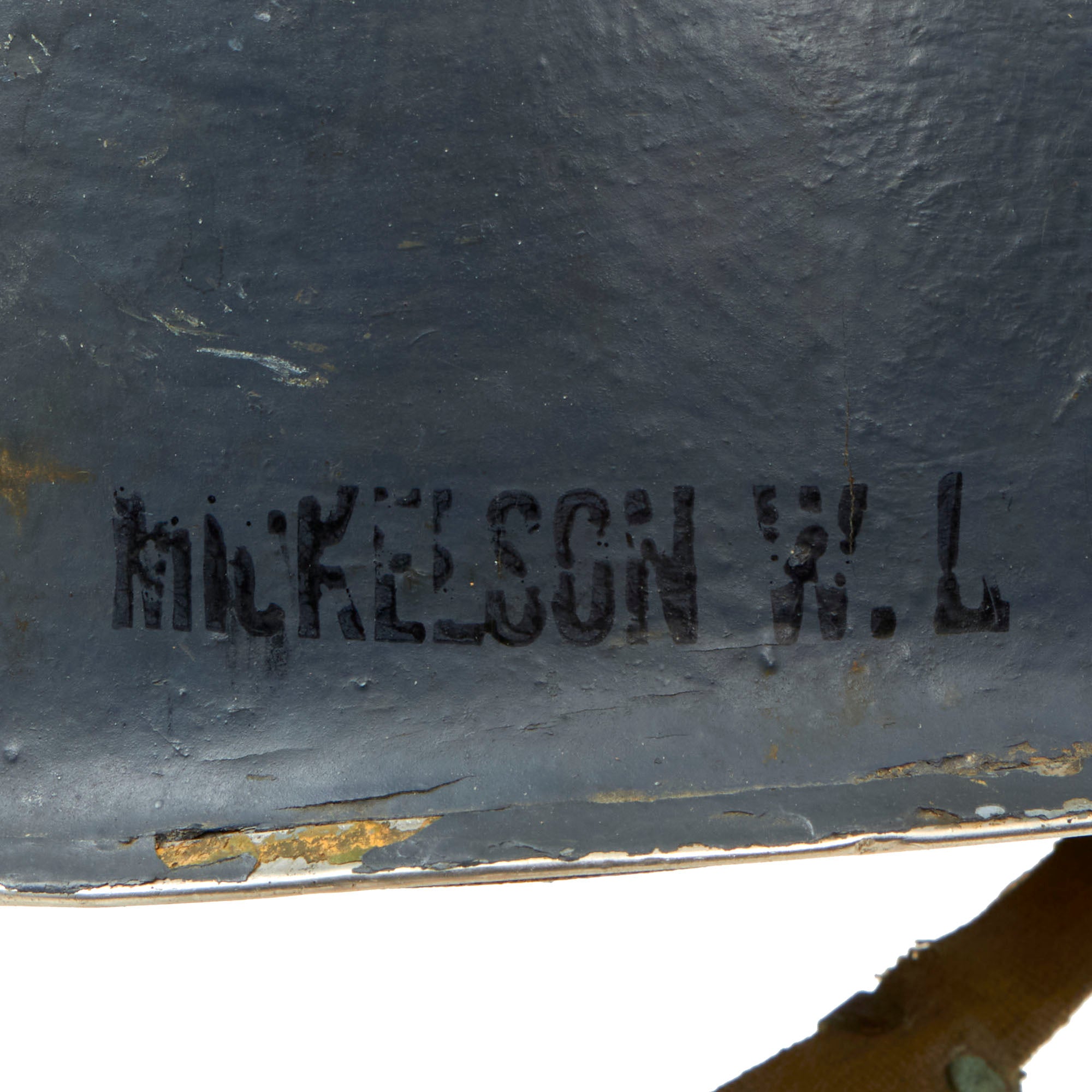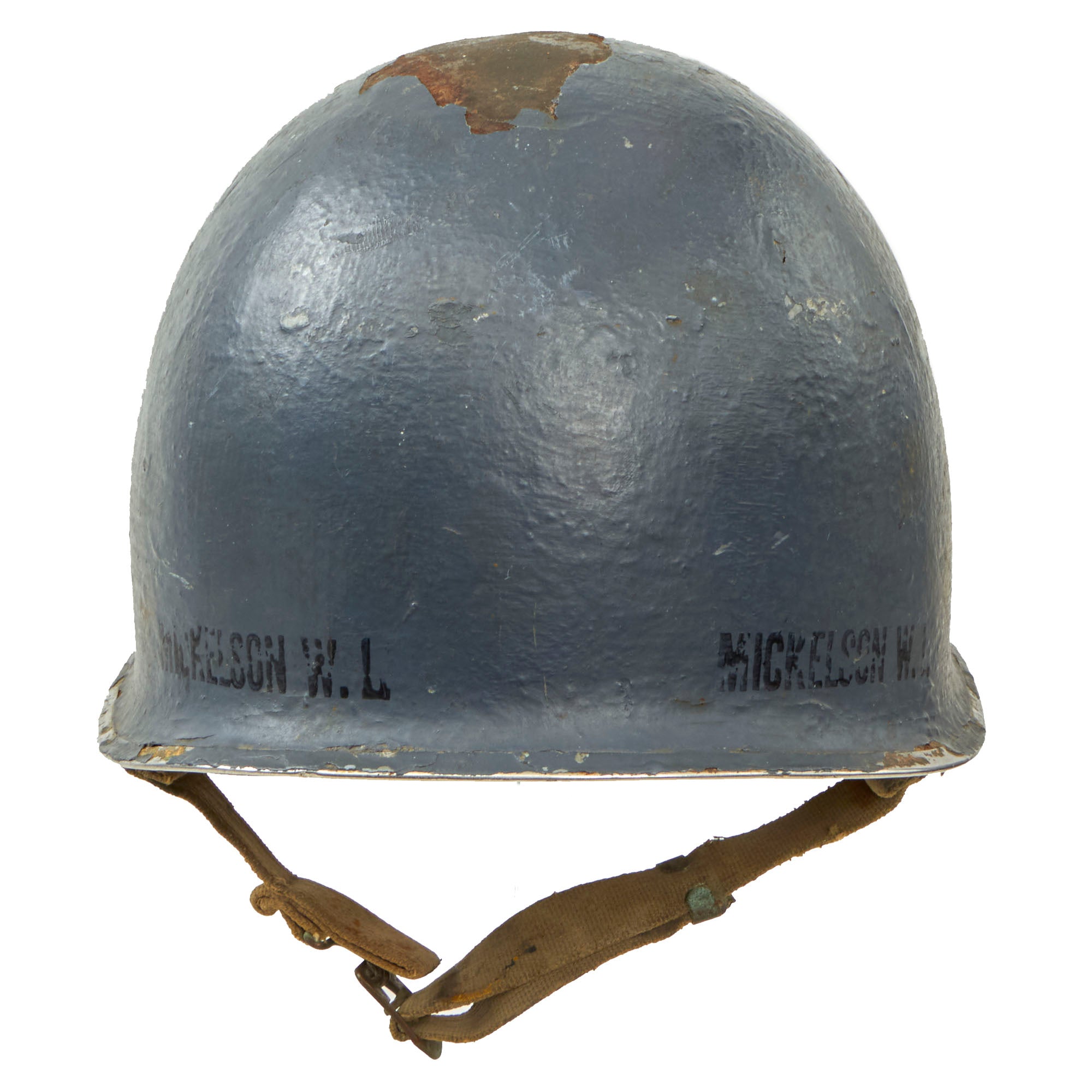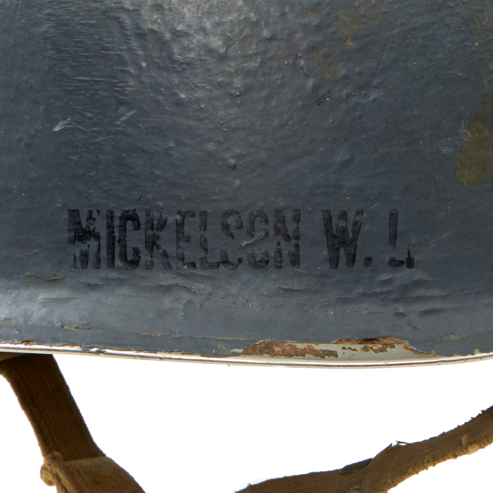 The helmet is a striking Navy Haze Gray color and is in a remarkably good condition. On the exterior, there are several name stamps that read "MICKELSON W. L." Unfortunately, despite spending a considerable amount of time researching the name, we couldn't find any concrete information regarding his service in the US Navy during WWII. The helmet is adorned with multiple chips in various areas, indicating its usage, and has a noticeable dent on the top. Despite these signs of wear, the overall appearance of the helmet is quite impressive, and it's clear that it was well taken care of.