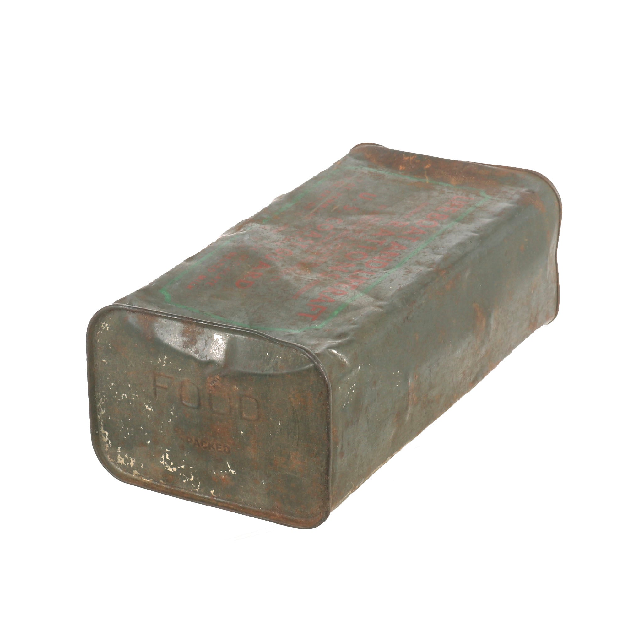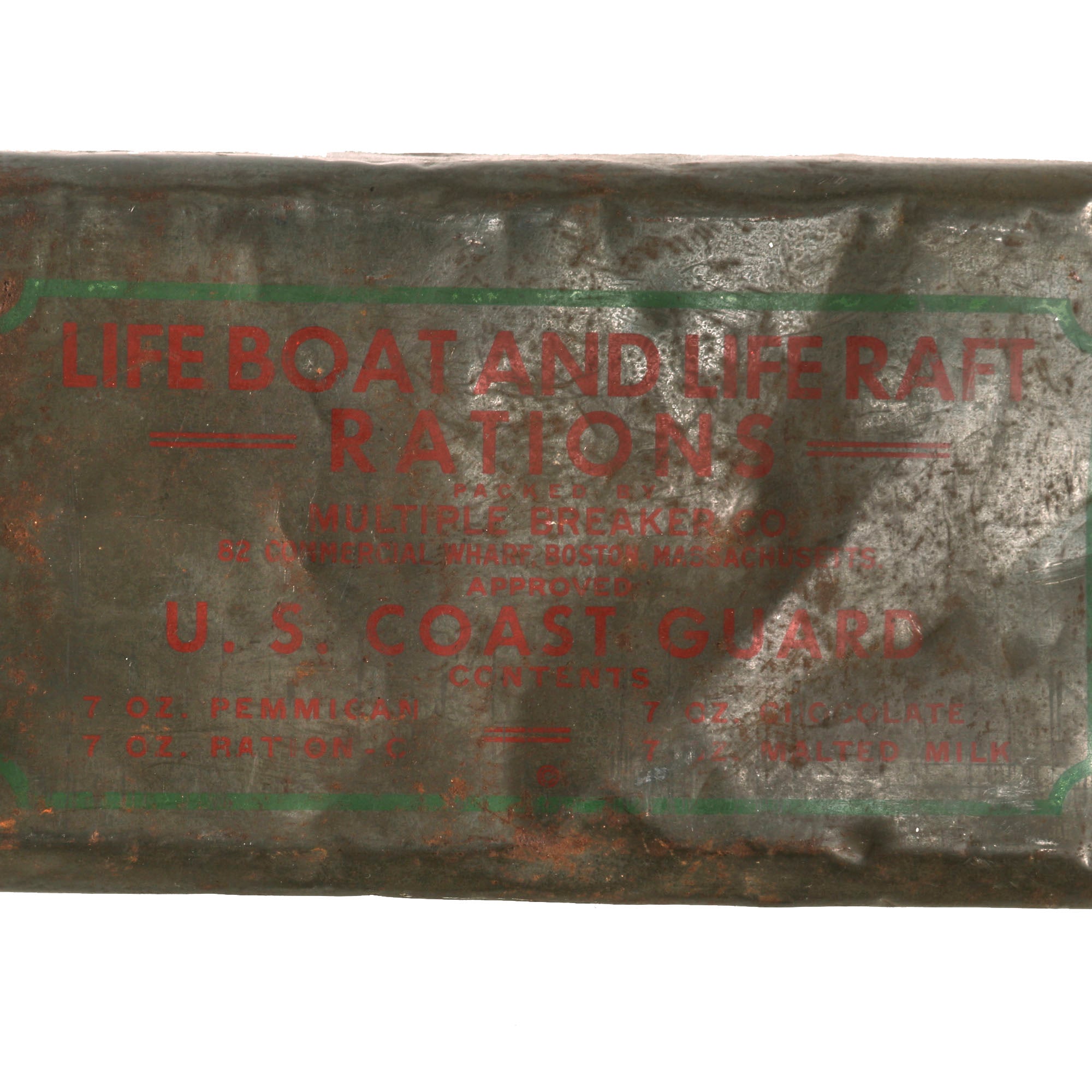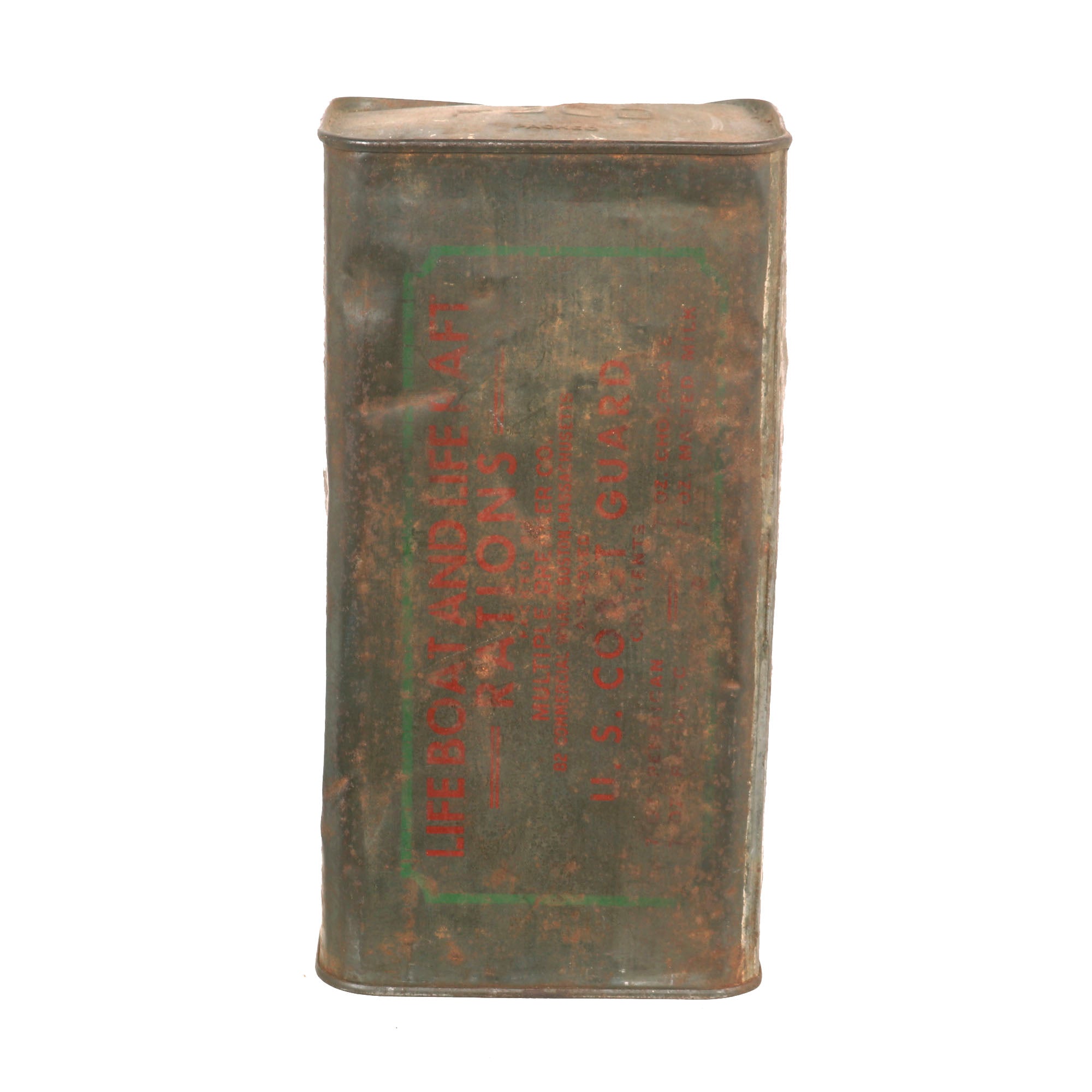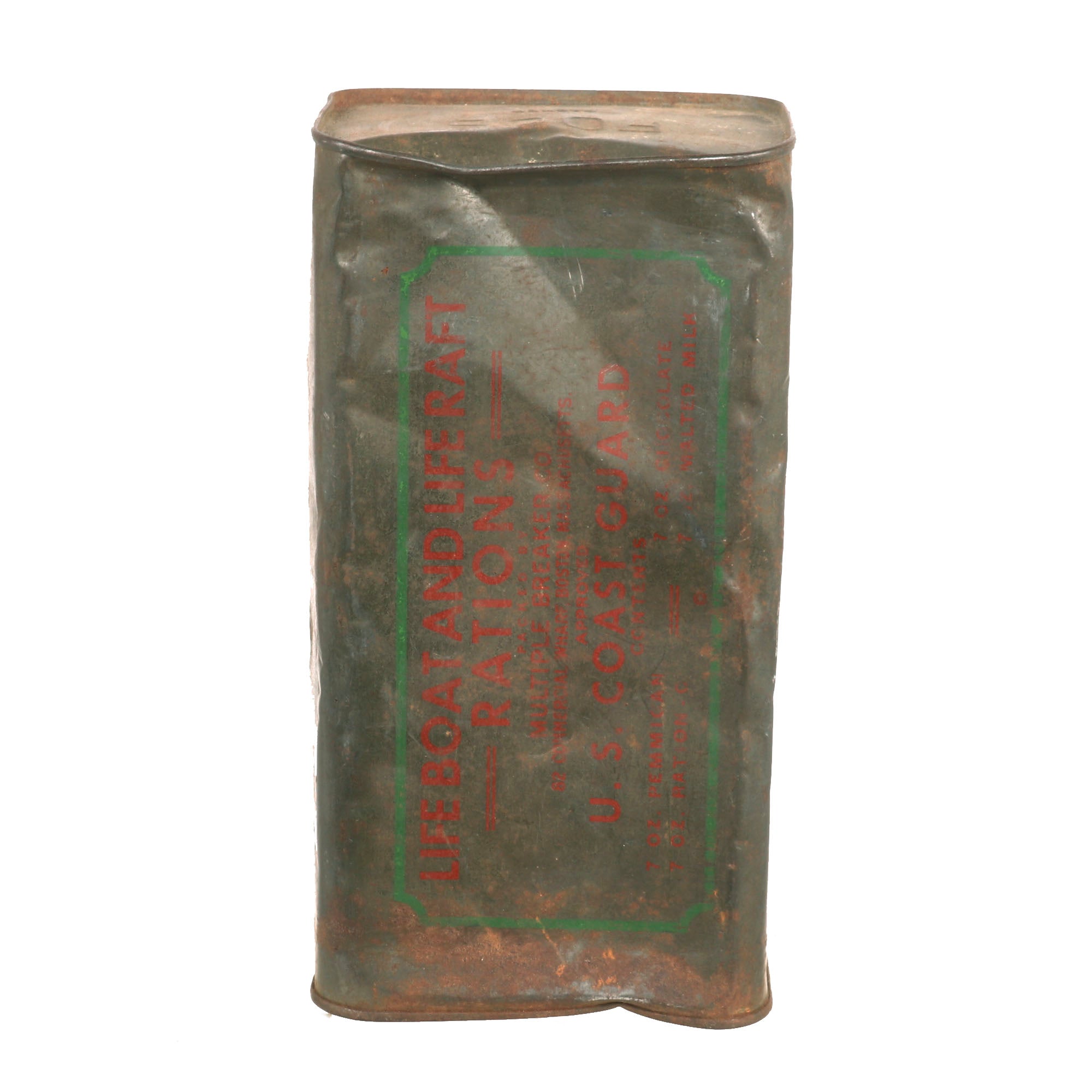 Original Item: Only One Available. Genuine WWII US Coast Guard life boat and life raft rations which contains 7 Oz. pemmican, malted milk, biscuit and chocolate. Top of can is dated 1945. Can is unopened and still full with all contents. Can measures 8.5" H x 4" W x 3" D. There are some dents in the can.