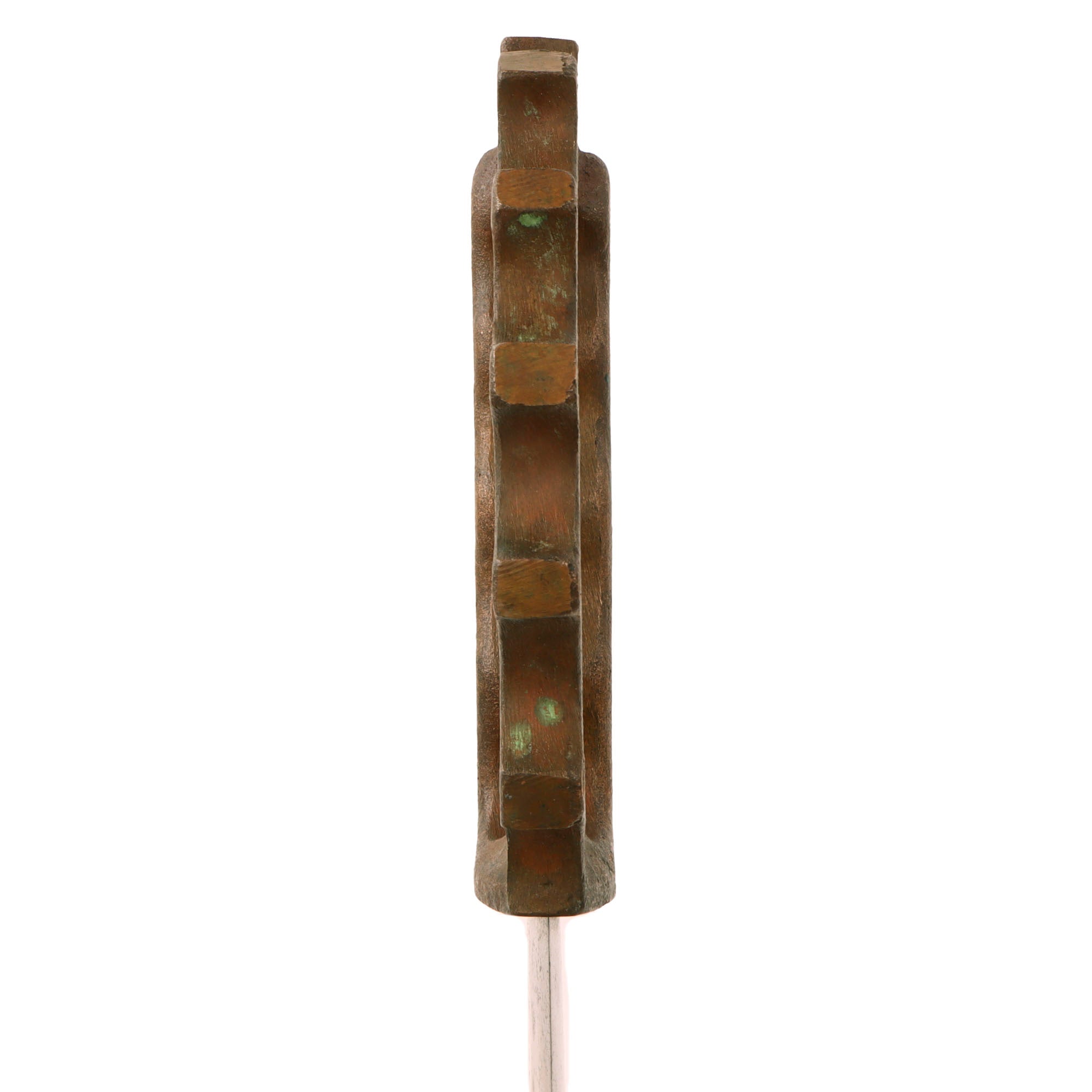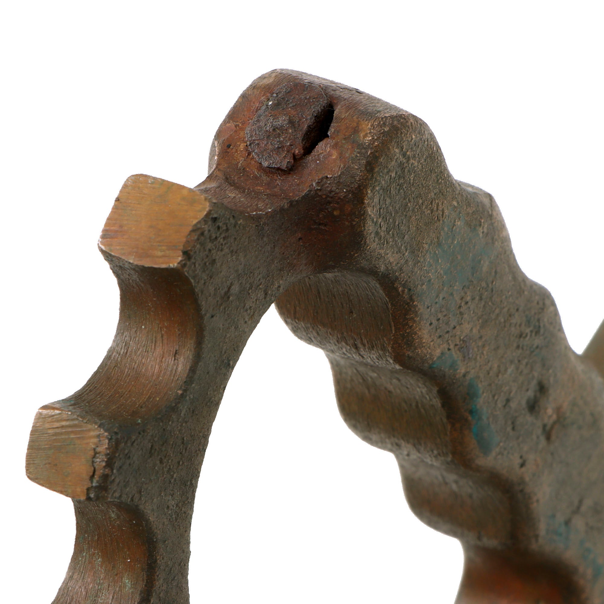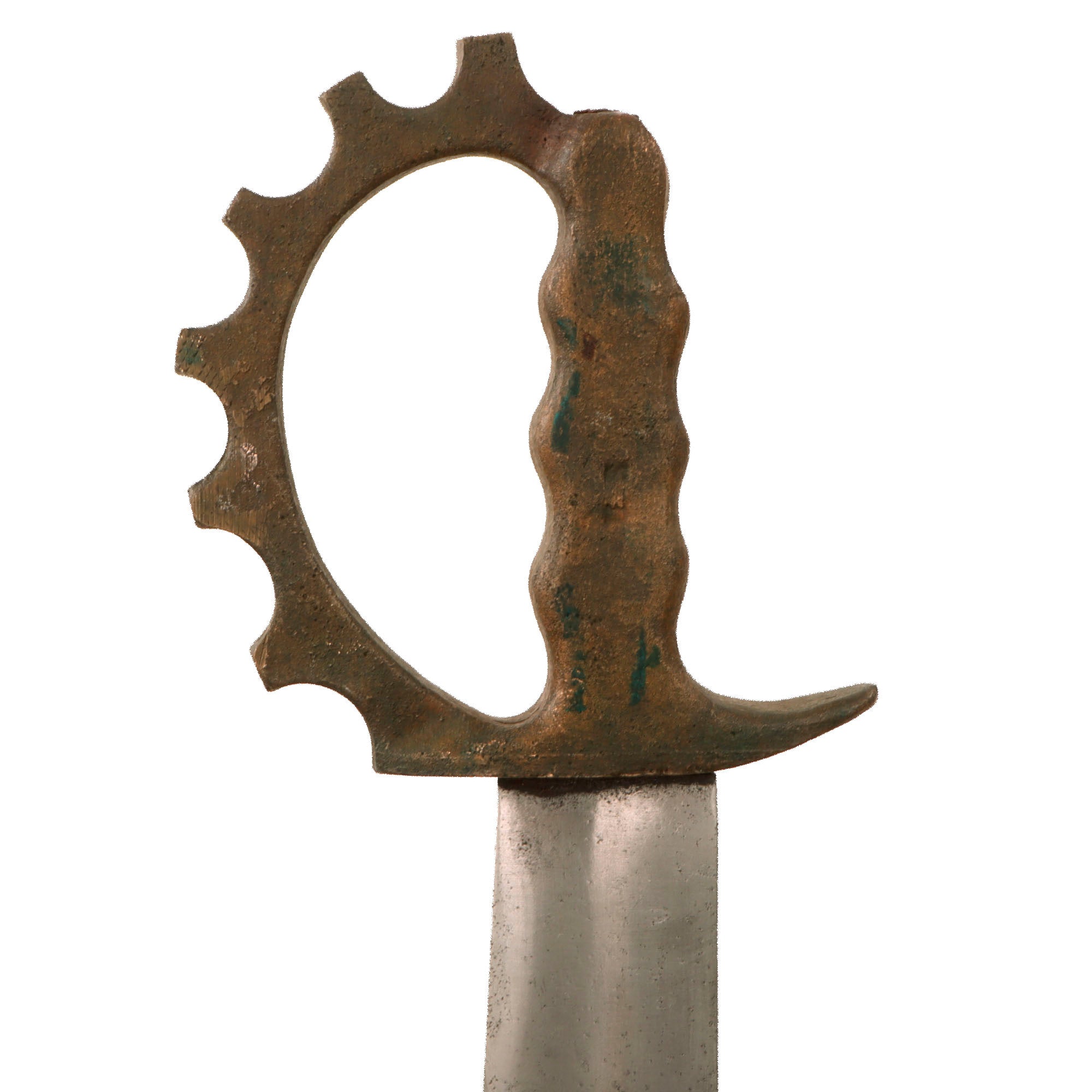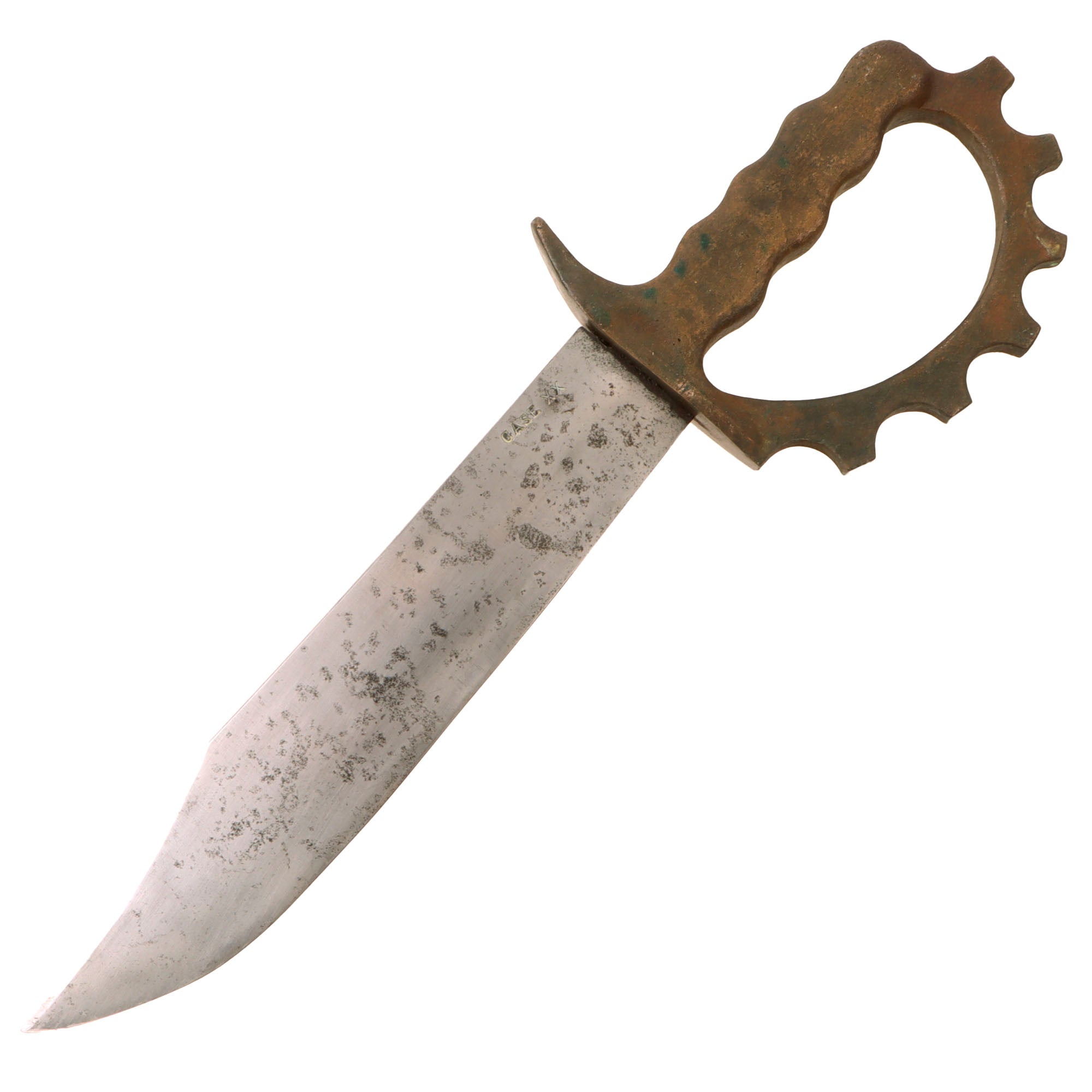 Condition: Very good overall. Blade has a medium pewter patina with some scattered oxidation and surface discoloration. The cast brass hilt has an uncleaned, deep bronze patina with some verdigris. Obvious period correct hand-finishing file marks are present inside the cogs and the grip of the knife.