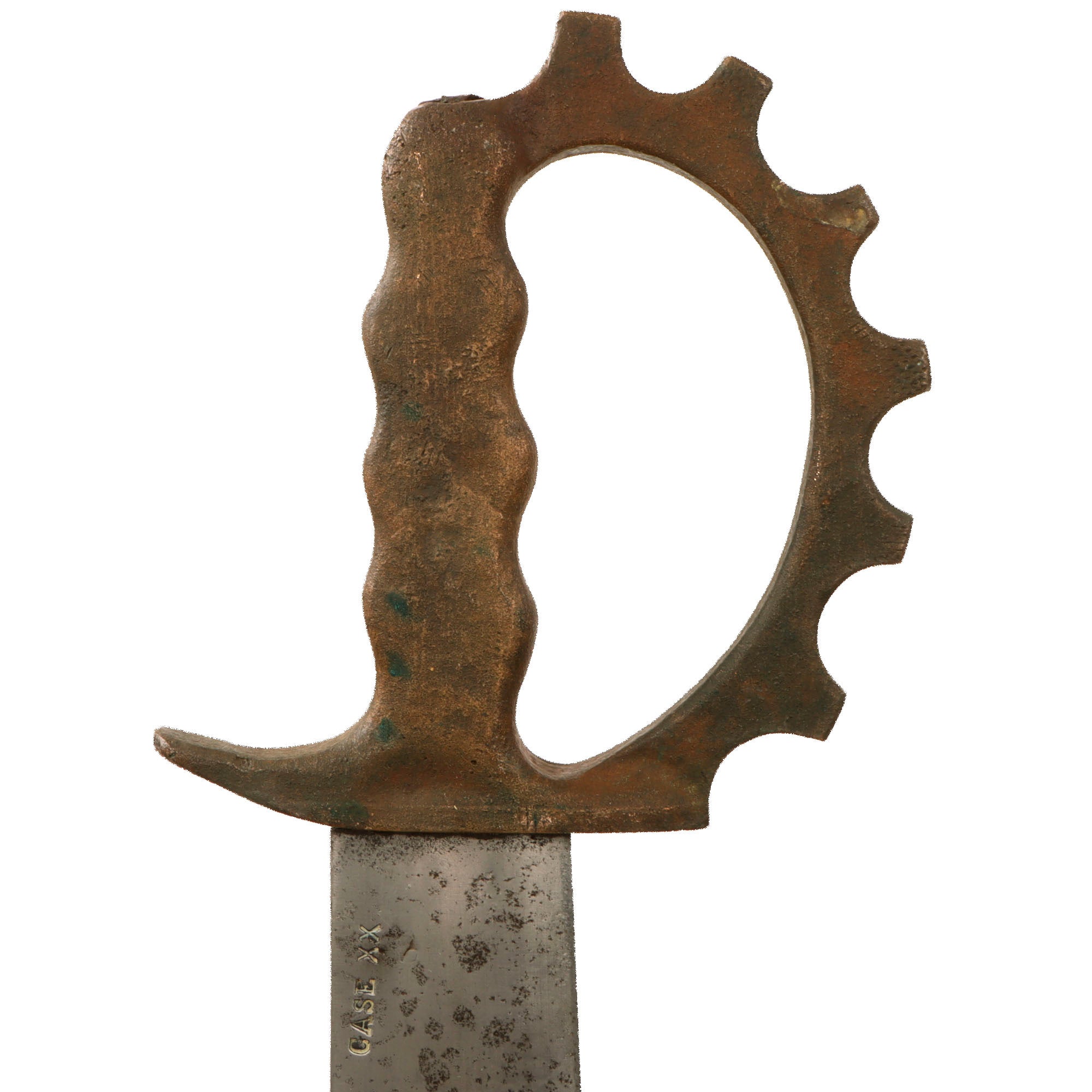 Original Item: Only One Available. This CASE XX converted V44 Bowie knife measures 14 inches long overall, with a 9 1/8 inch clip point blade. Blade is 1 3/4 inches wide at the widest point. It is offered in very good condition without leather sheath with cast brass knuckle knife hilt, and teeth or cogs cast into the guard.
