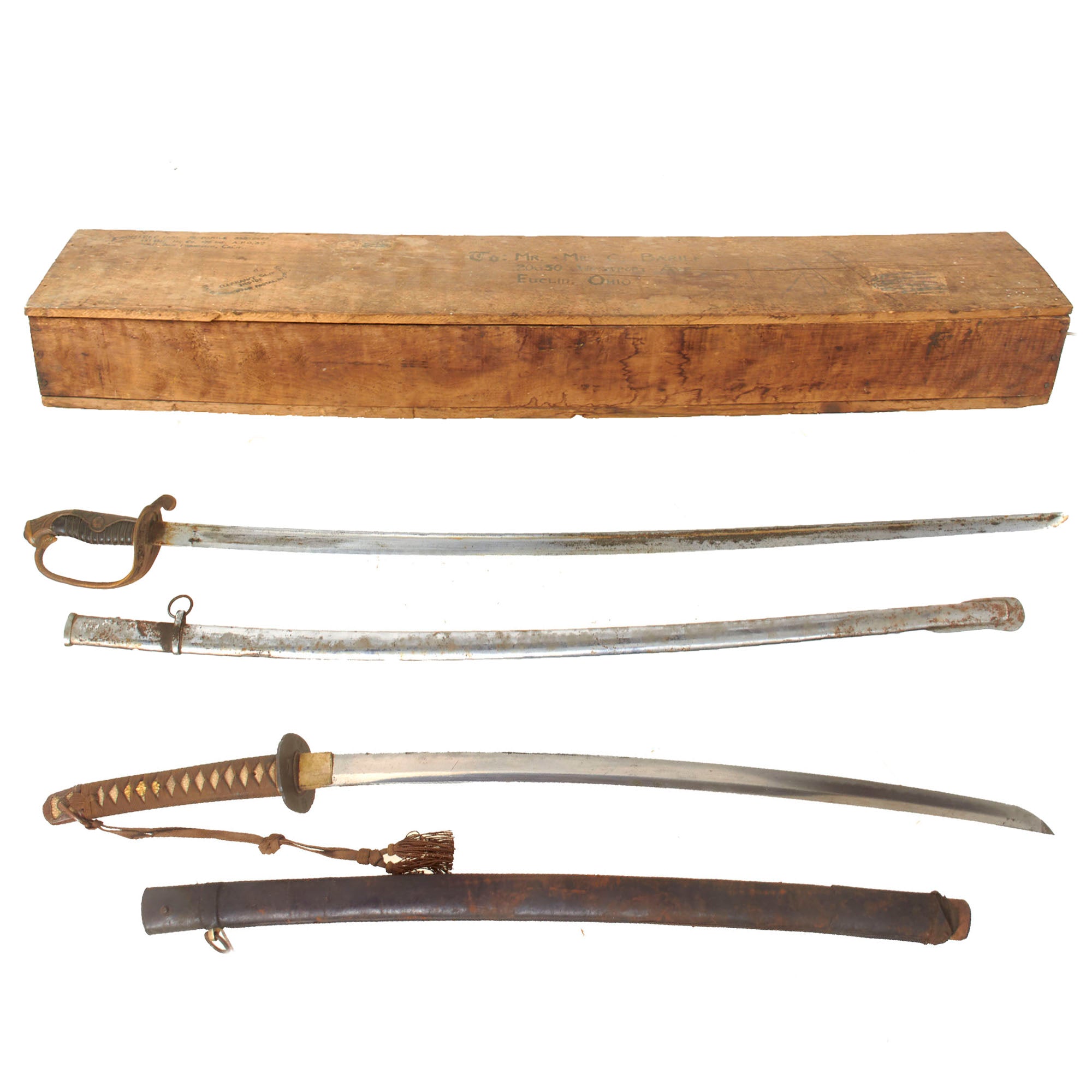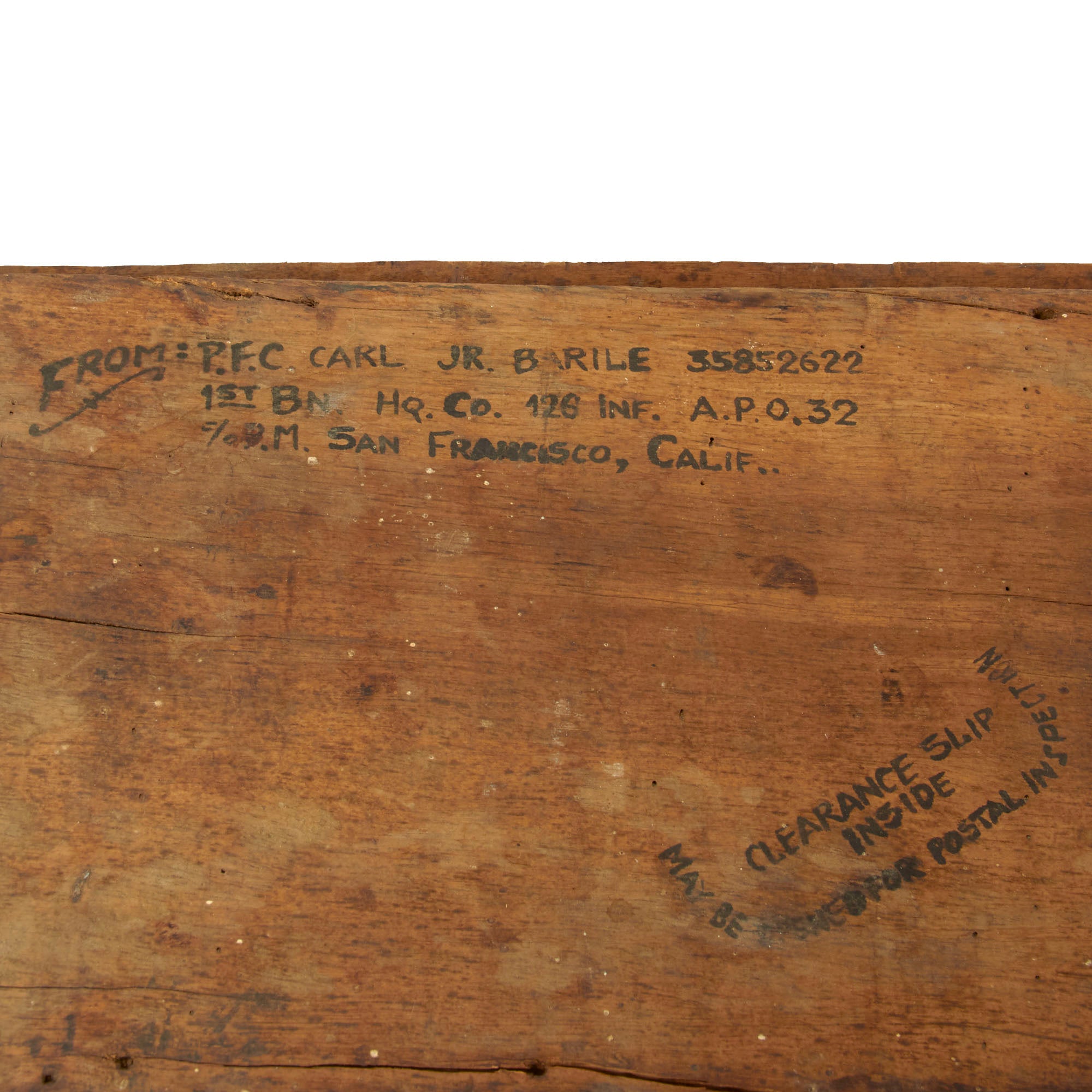 This is an unprecedented pair of such swords, possibly the most outstanding “Ship-Home” box we’ve ever offered. These swords were captured by Private First Class Carl Barile Jr., 1st Battalion Headquarters Company, 126th Infantry Regiment, 32nd Infantry Division and sent home to his parents in Euclid, Ohio. During World War II, the 32nd Infantry Division was credited with many "firsts". It was the first United States division to deploy as an entire unit overseas and among the first of seven U.S. Army and U.S. Marine units to engage in offensive ground combat operations during 1942. The division was among the first divisions to engage the enemy and were still fighting holdouts after the official Japanese surrender. The 32nd logged a total of 654 days of combat during World War II, more than any other United States Army division.