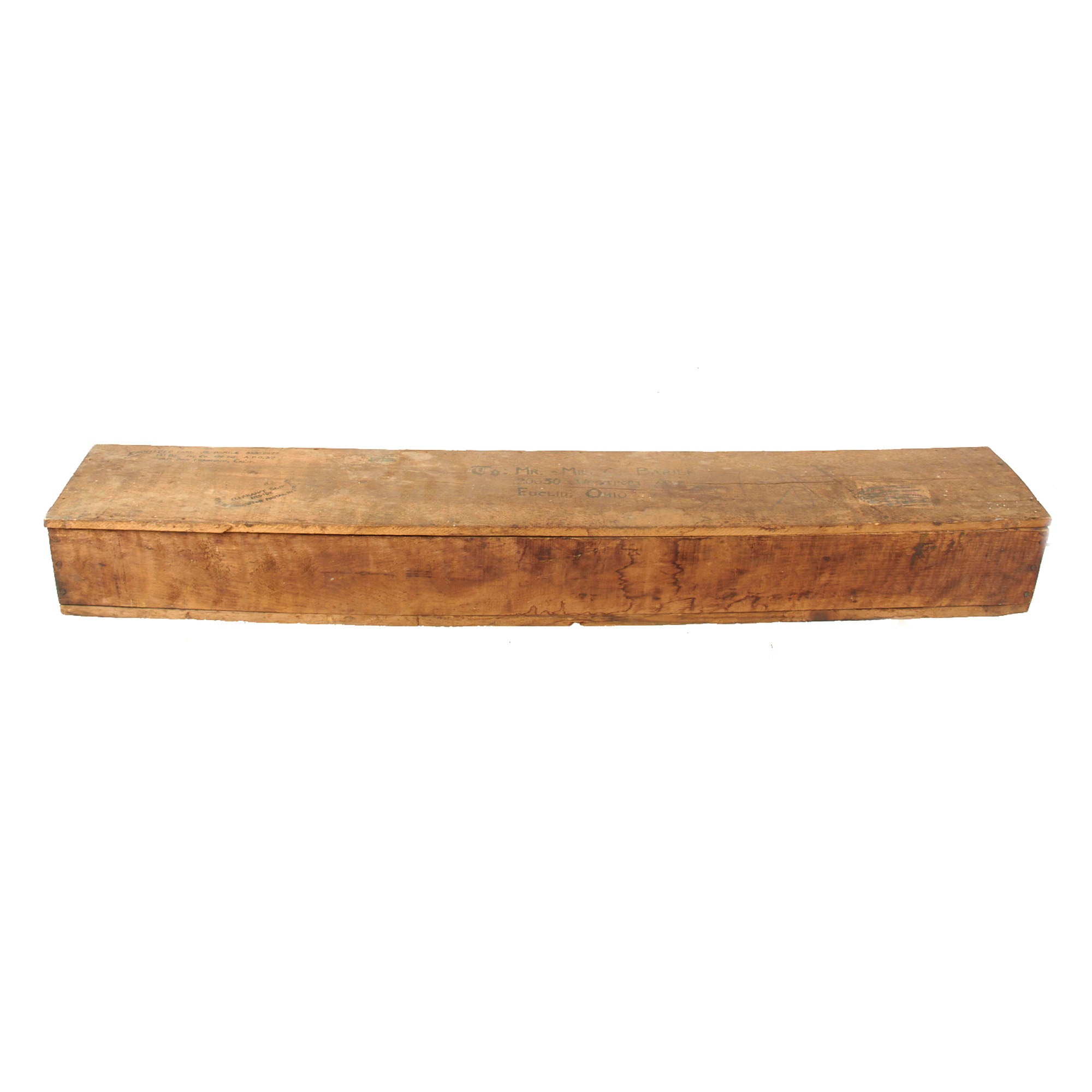 The ship-home box measures 43 x 7½ x 5” including the lid. The lid shows heavy warping and cracking so it doesn’t perfectly fit over the crate, but it sits great for display. The box is still filled with wood shavings/dried grass which was used as padding for the swords during transit. The lid of the crate is inscribed: