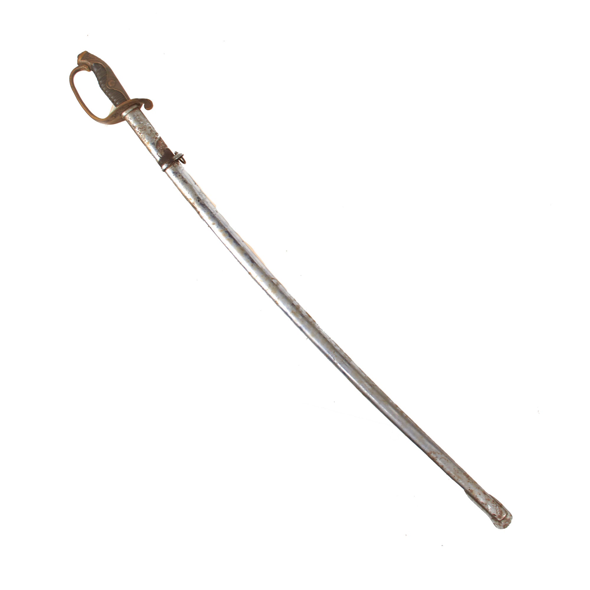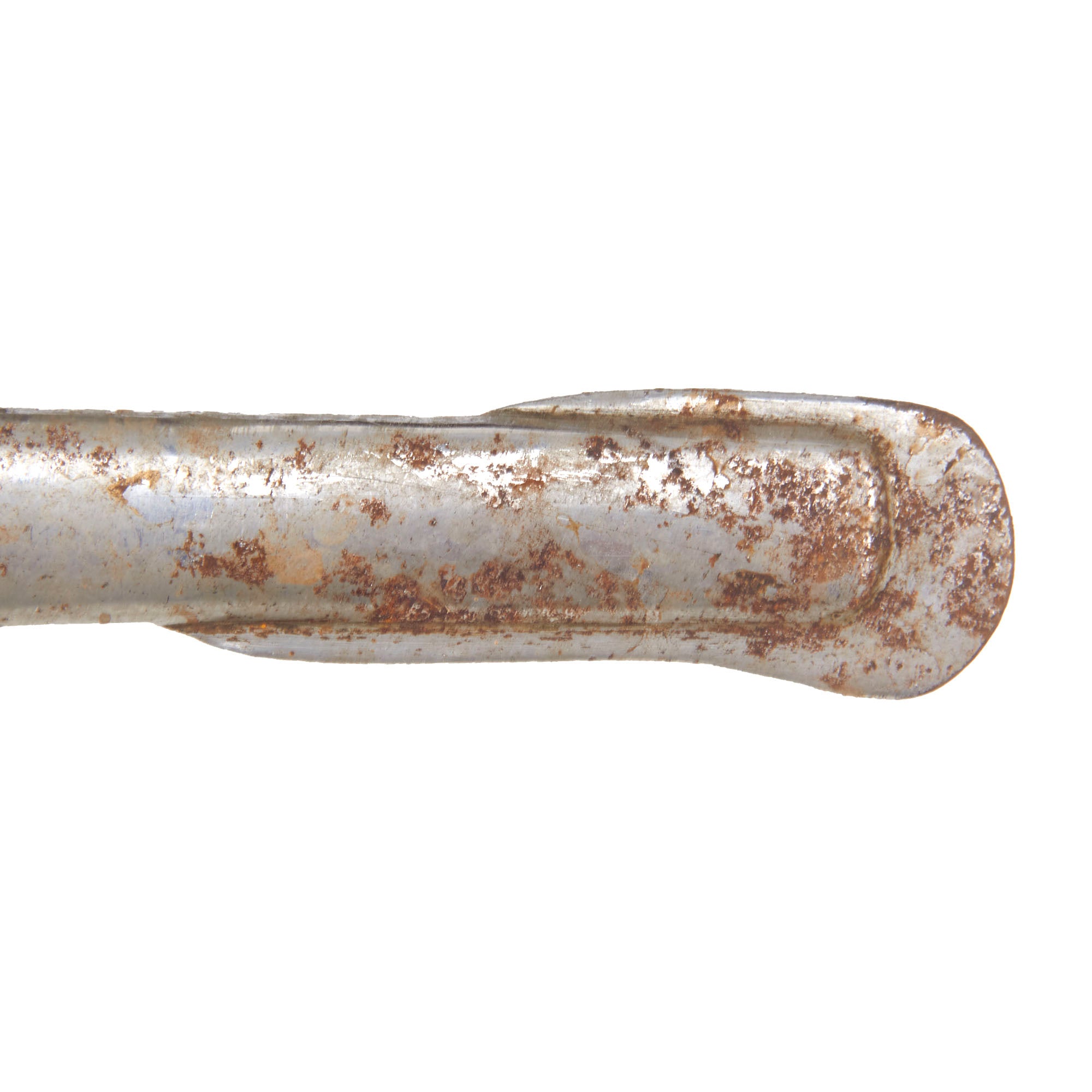 The scabbard also shows patination overall, with some dents about 5 inches above the bottom, and the plating is missing in areas. It looks to be chrome plated, which is more of a blue color than nickel plating.