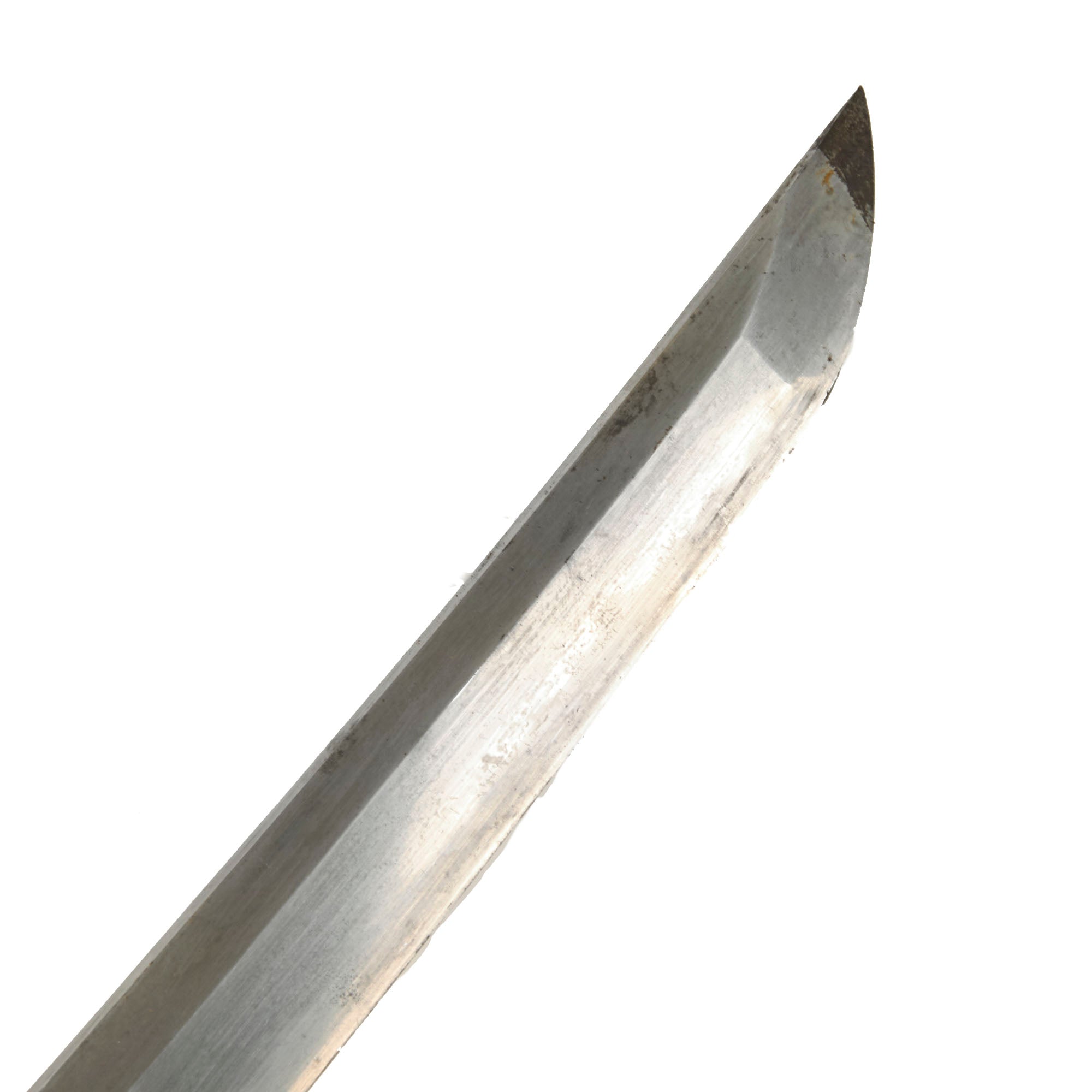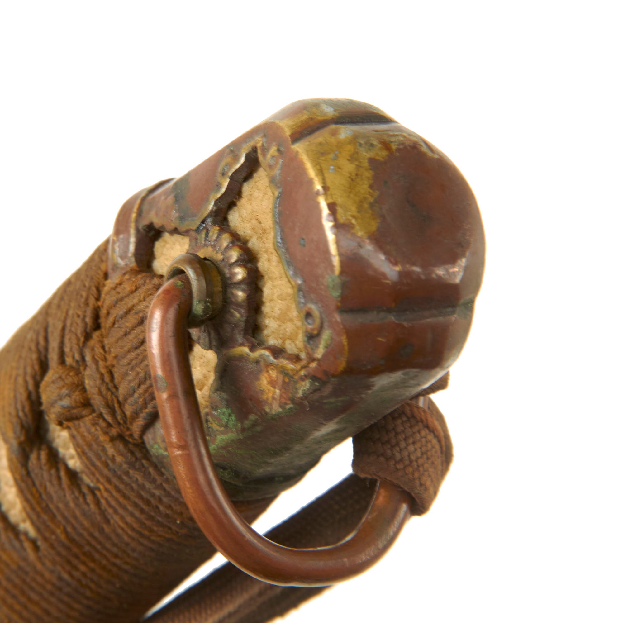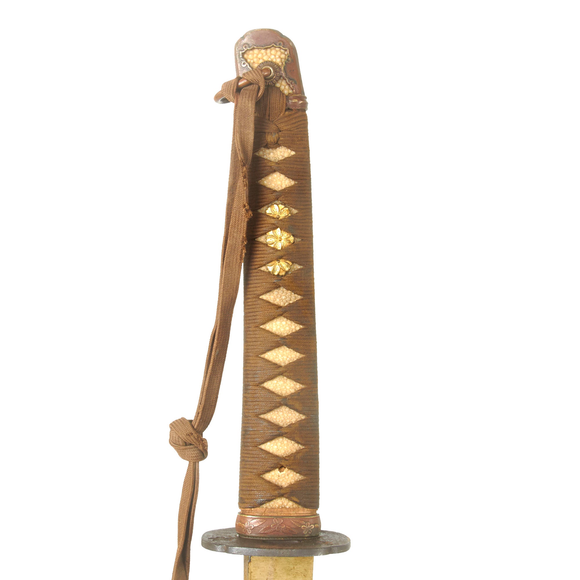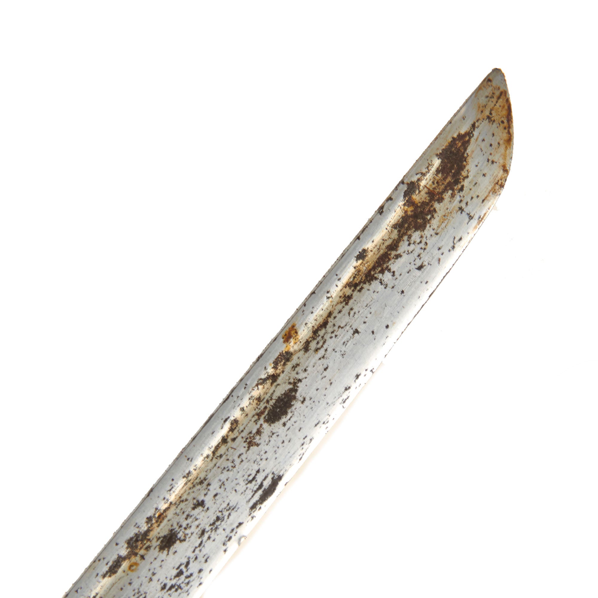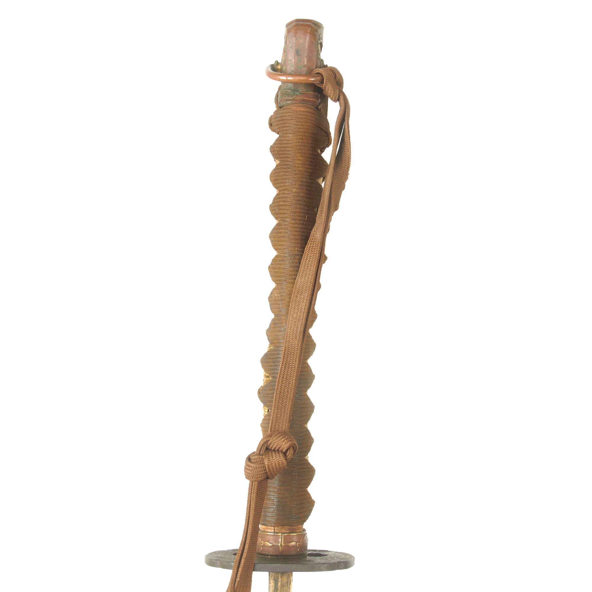 The other sword in the offering is a well-worn Imperial Japanese Army Type 19 Kyu-Gunto Officer’s Parade Sword with Scabbard, which looks to have seen actual service during the war. The sword blade was originally fully plated with a faux hamon, however it now shows a good amount of wear and oxidation. The brass hilt has a lovely patina, having lost the original gilding, and the wooden grip shows cracking with some chunks missing at the bottom.
