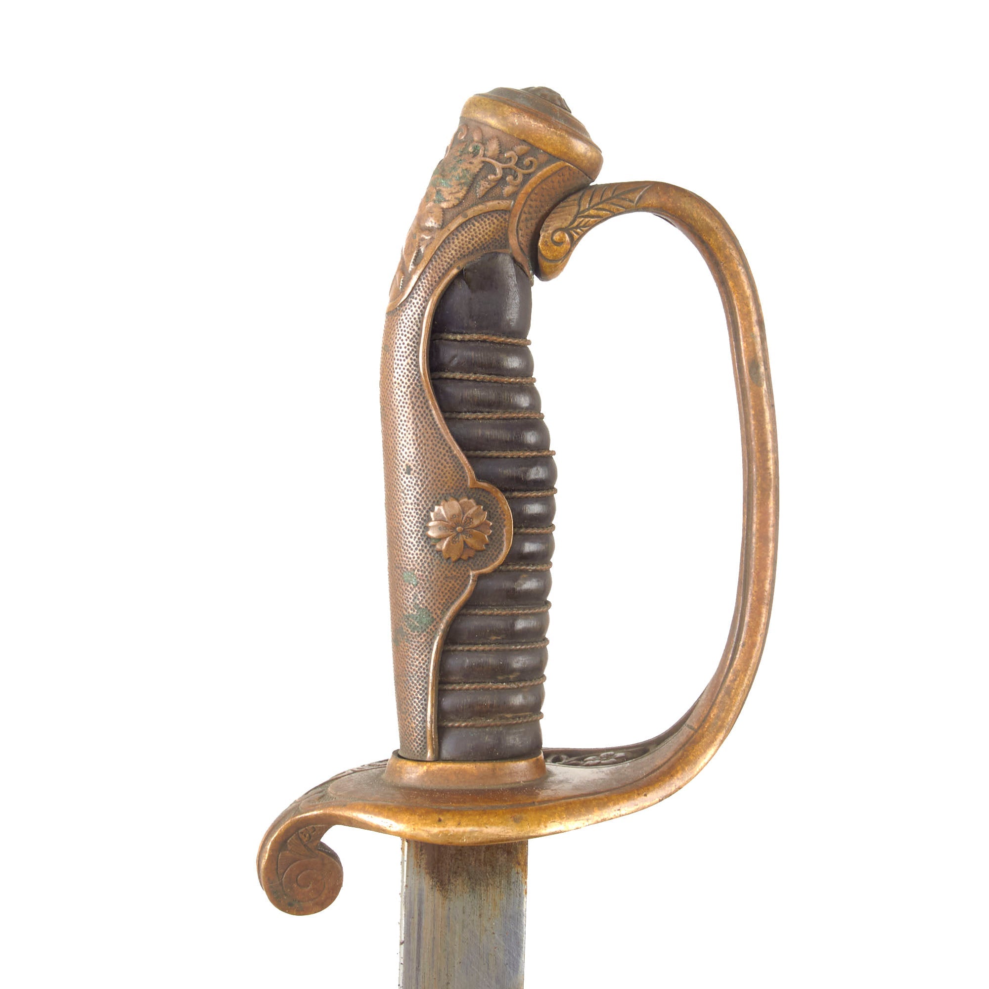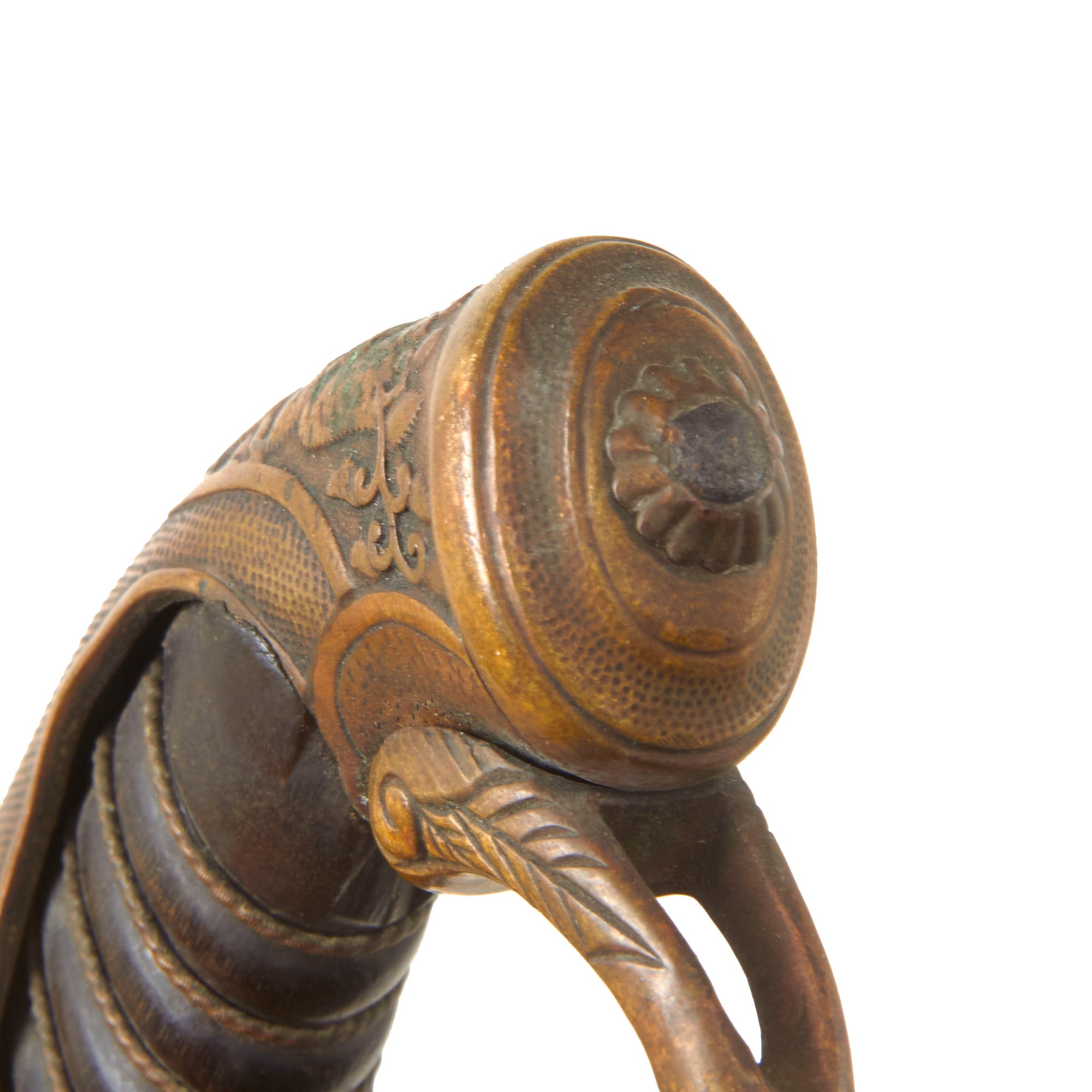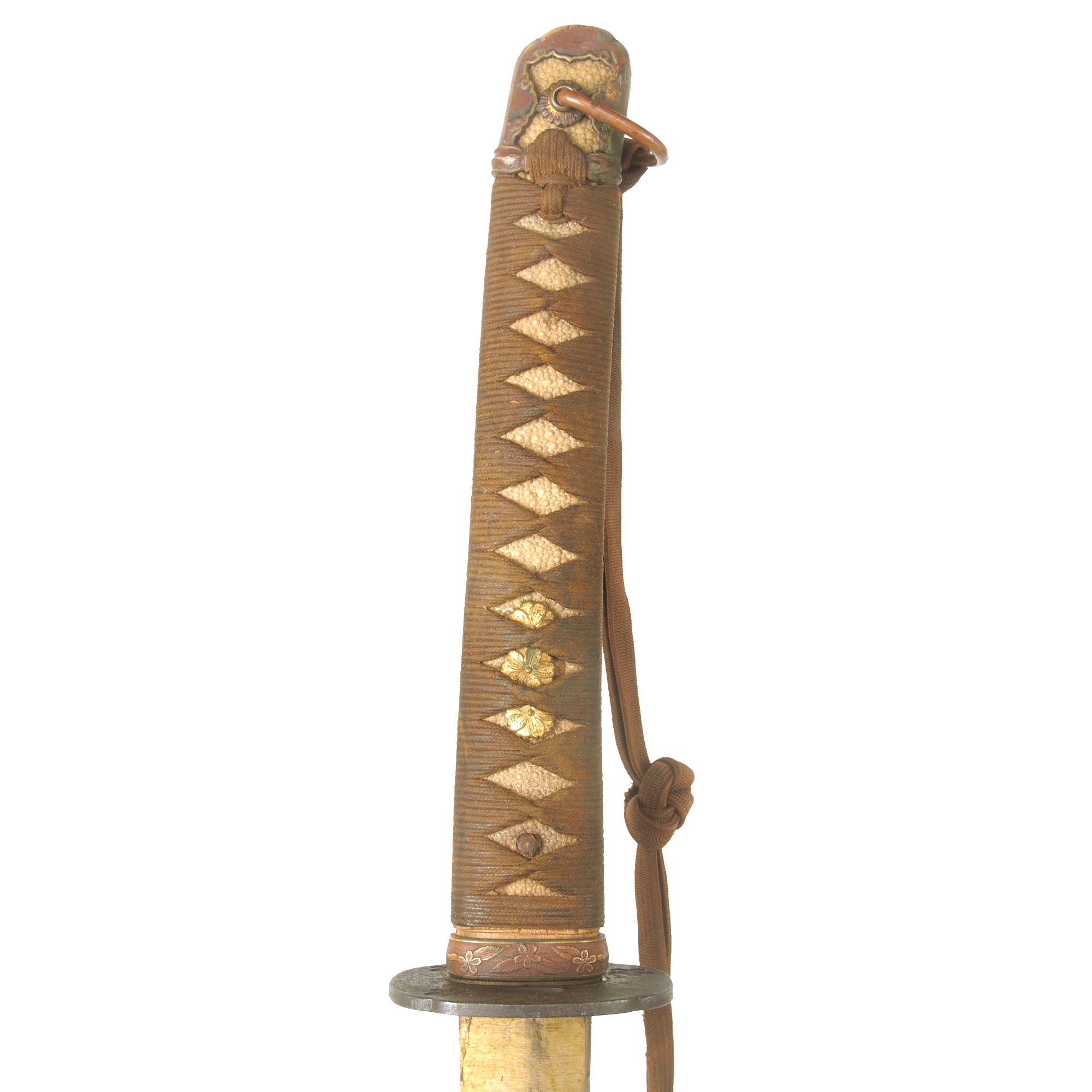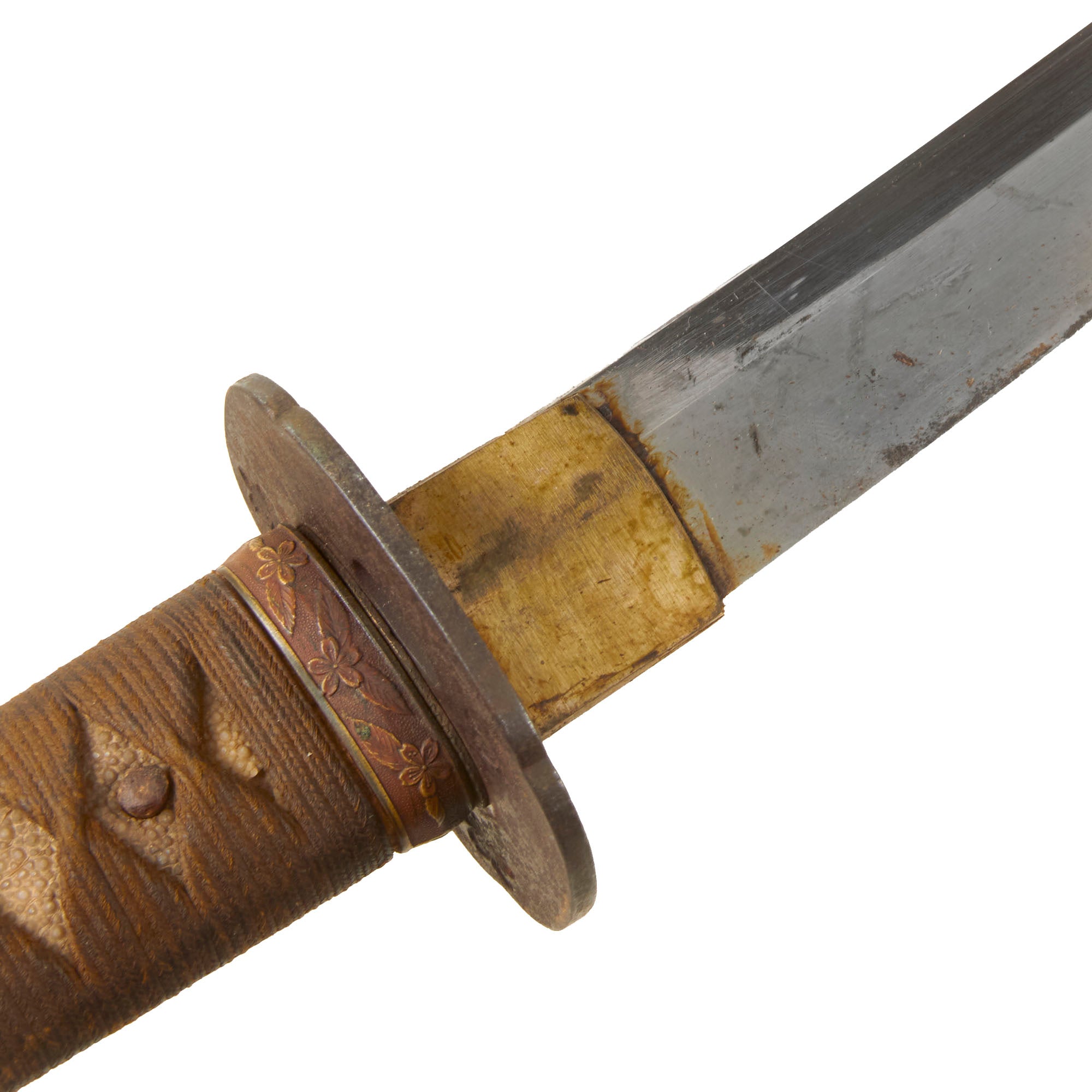 The other sword in the offering is a well-worn Imperial Japanese Army Type 19 Kyu-Gunto Officer’s Parade Sword with Scabbard, which looks to have seen actual service during the war. The sword blade was originally fully plated with a faux hamon, however it now shows a good amount of wear and oxidation. The brass hilt has a lovely patina, having lost the original gilding, and the wooden grip shows cracking with some chunks missing at the bottom.