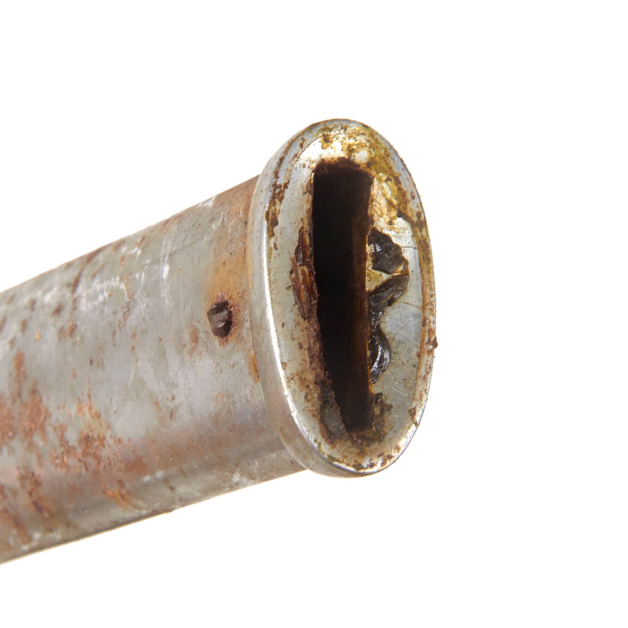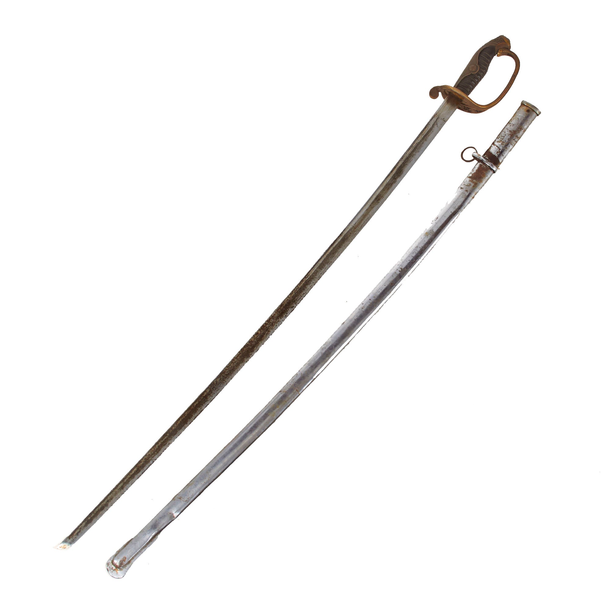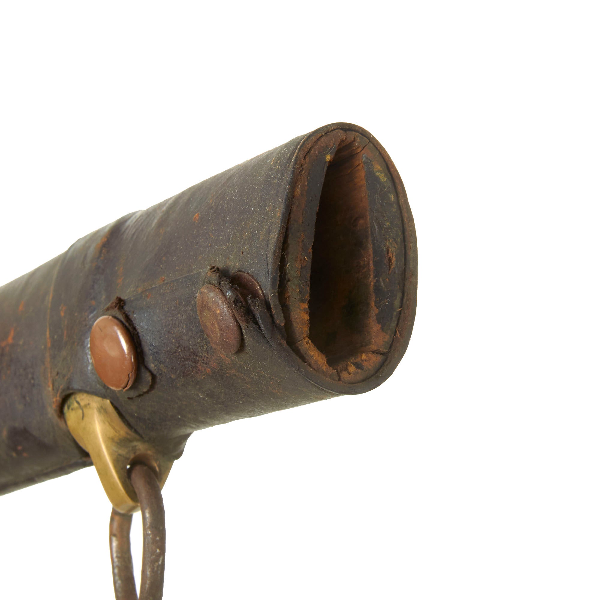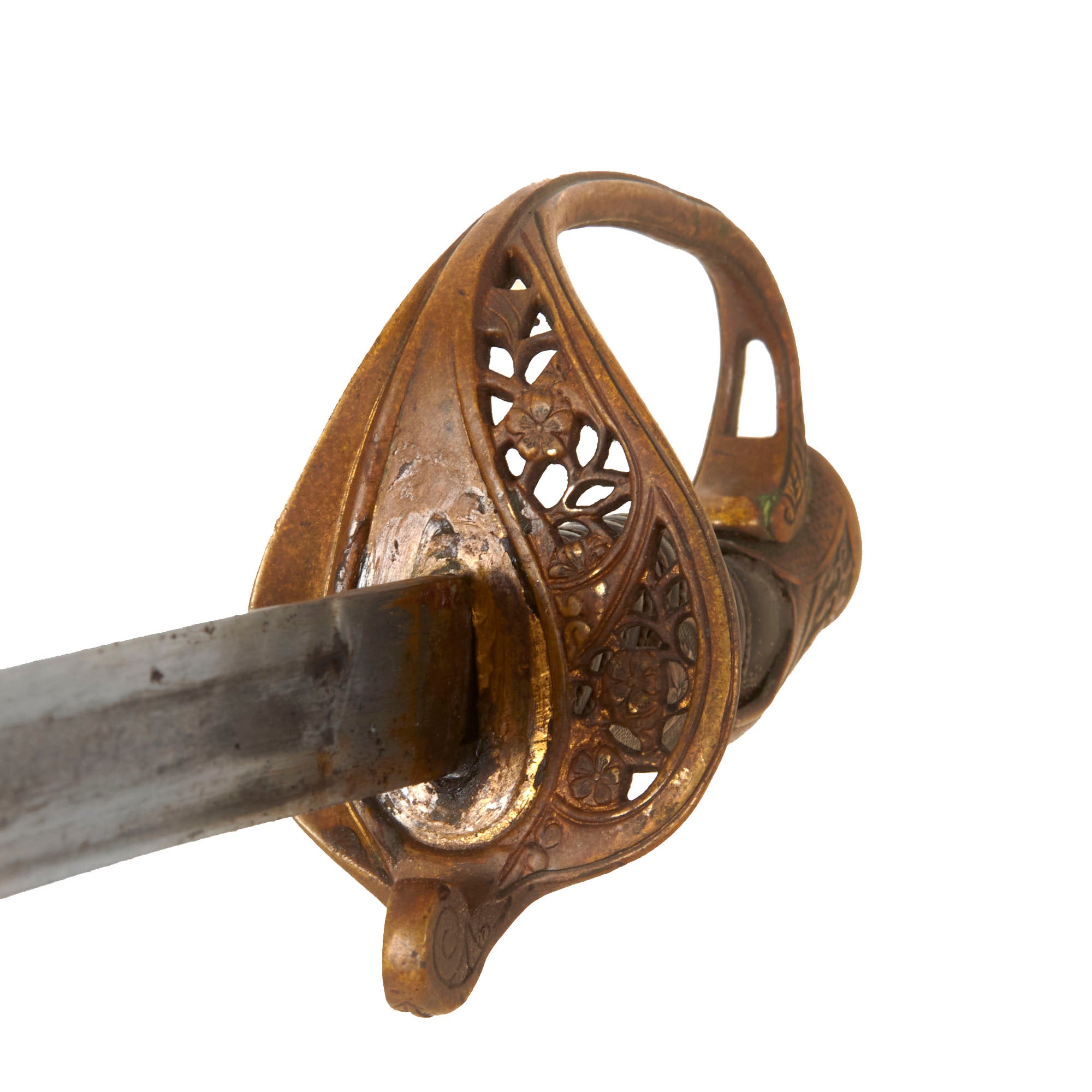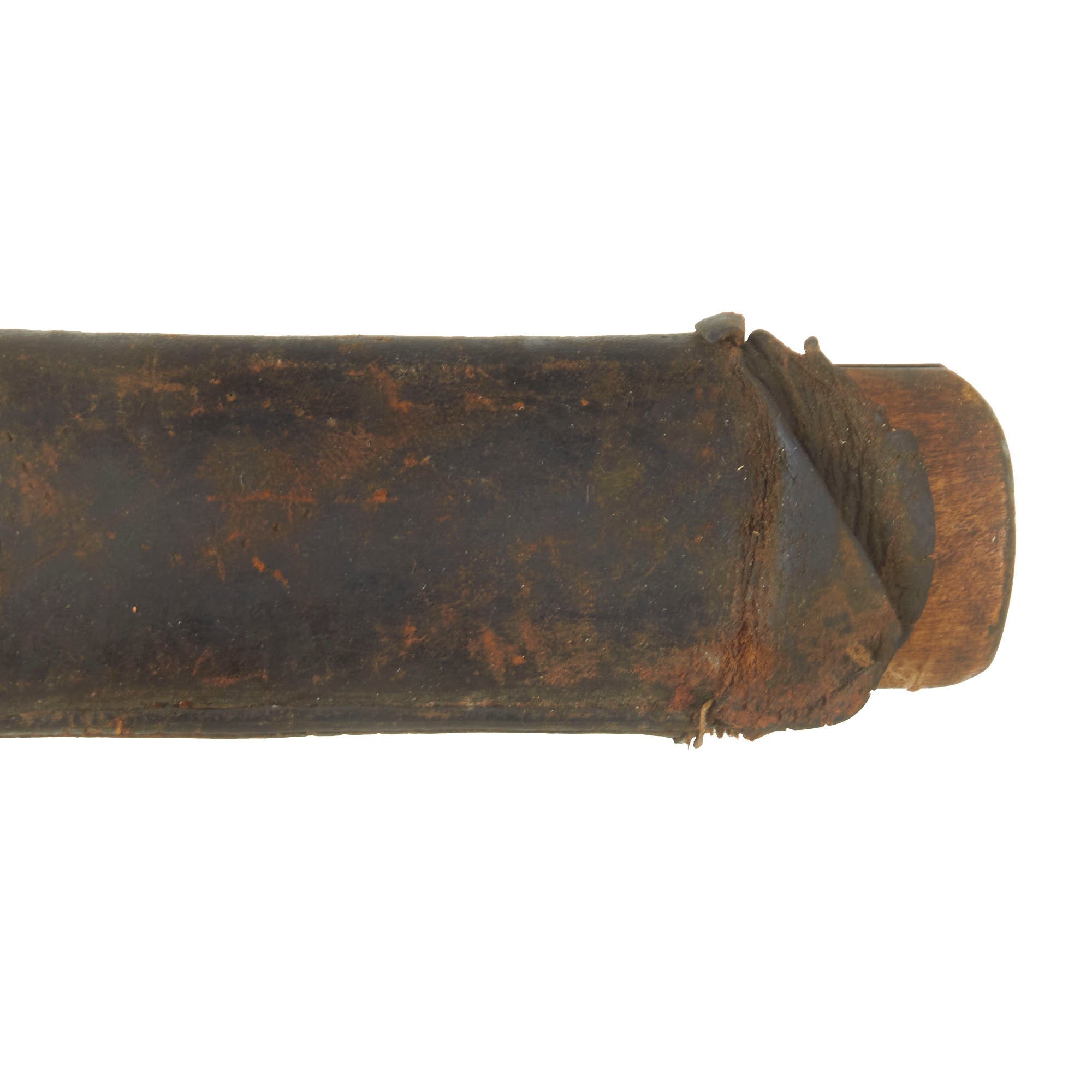 The other sword in the offering is a well-worn Imperial Japanese Army Type 19 Kyu-Gunto Officer’s Parade Sword with Scabbard, which looks to have seen actual service during the war. The sword blade was originally fully plated with a faux hamon, however it now shows a good amount of wear and oxidation. The brass hilt has a lovely patina, having lost the original gilding, and the wooden grip shows cracking with some chunks missing at the bottom.