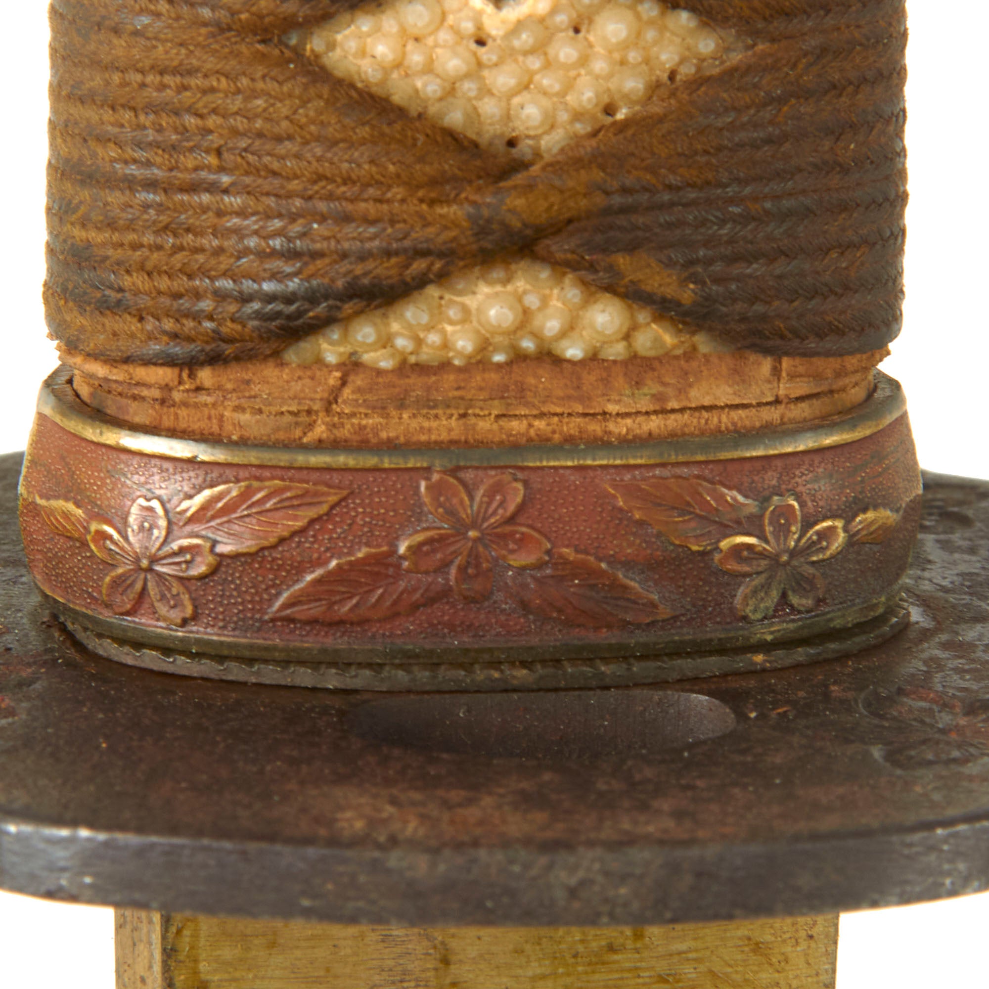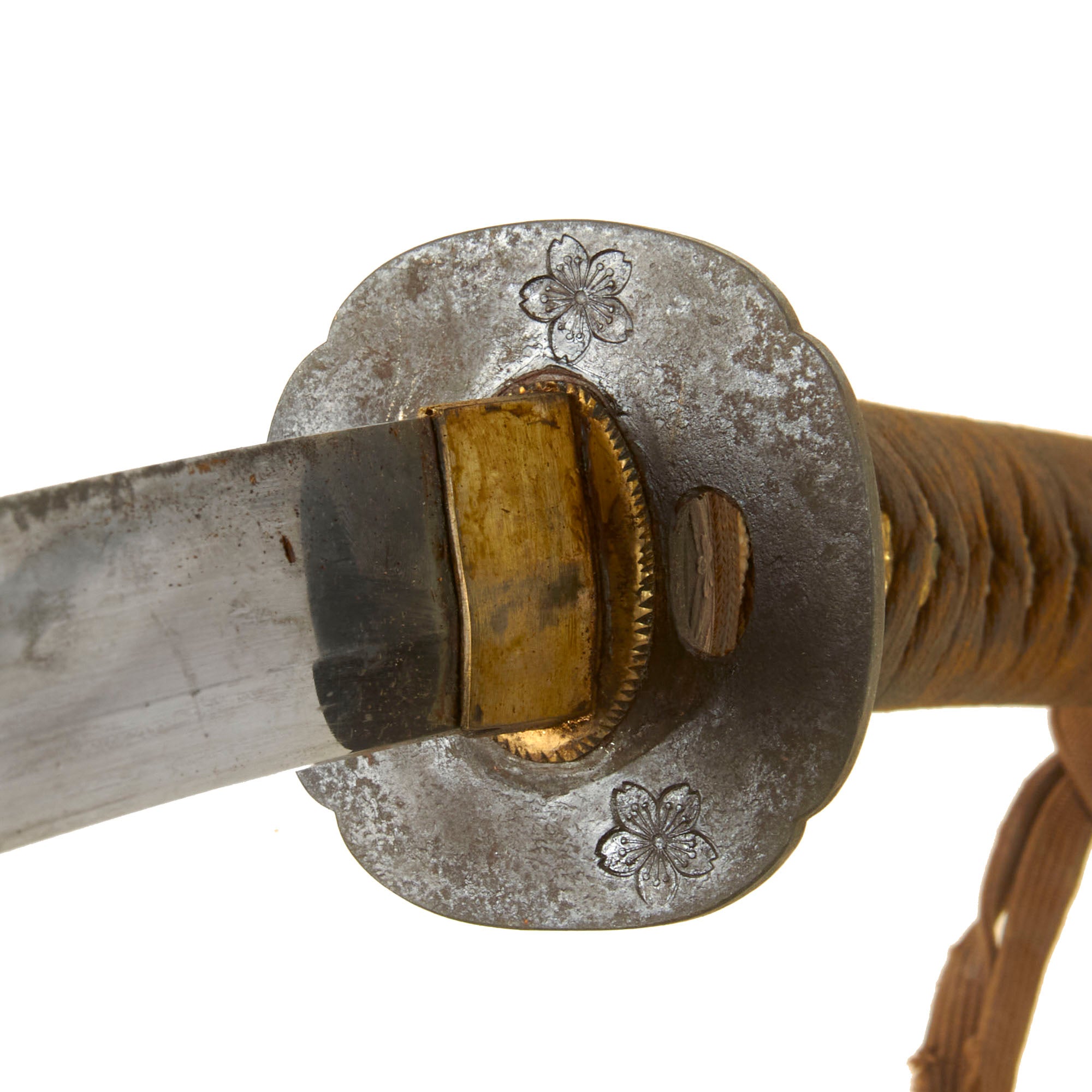 We pulled the handle, and the unsigned tang is somewhat crudely made. shows grinding and hammer marks, and also has three holes in it. This may indicate that it was possibly an NCO Sword blade that was repurposed, or it may have been a general purpose blade. The handle itself is relatively standard, with the correct brass fittings and cherry blossom motifs. The TSUBA cross guard however is an older style, in the MOKKO GATA (quince) shape, with two HITSU-ANA for accessories. It may have been repurposed for use during WWII, and it is stamped with the cherry blossom emblem of the Imperial Japanese Army. The handle is tight on the blade, however the cross guard is quite loose, as there look to be SEPPA spacers that are missing.
