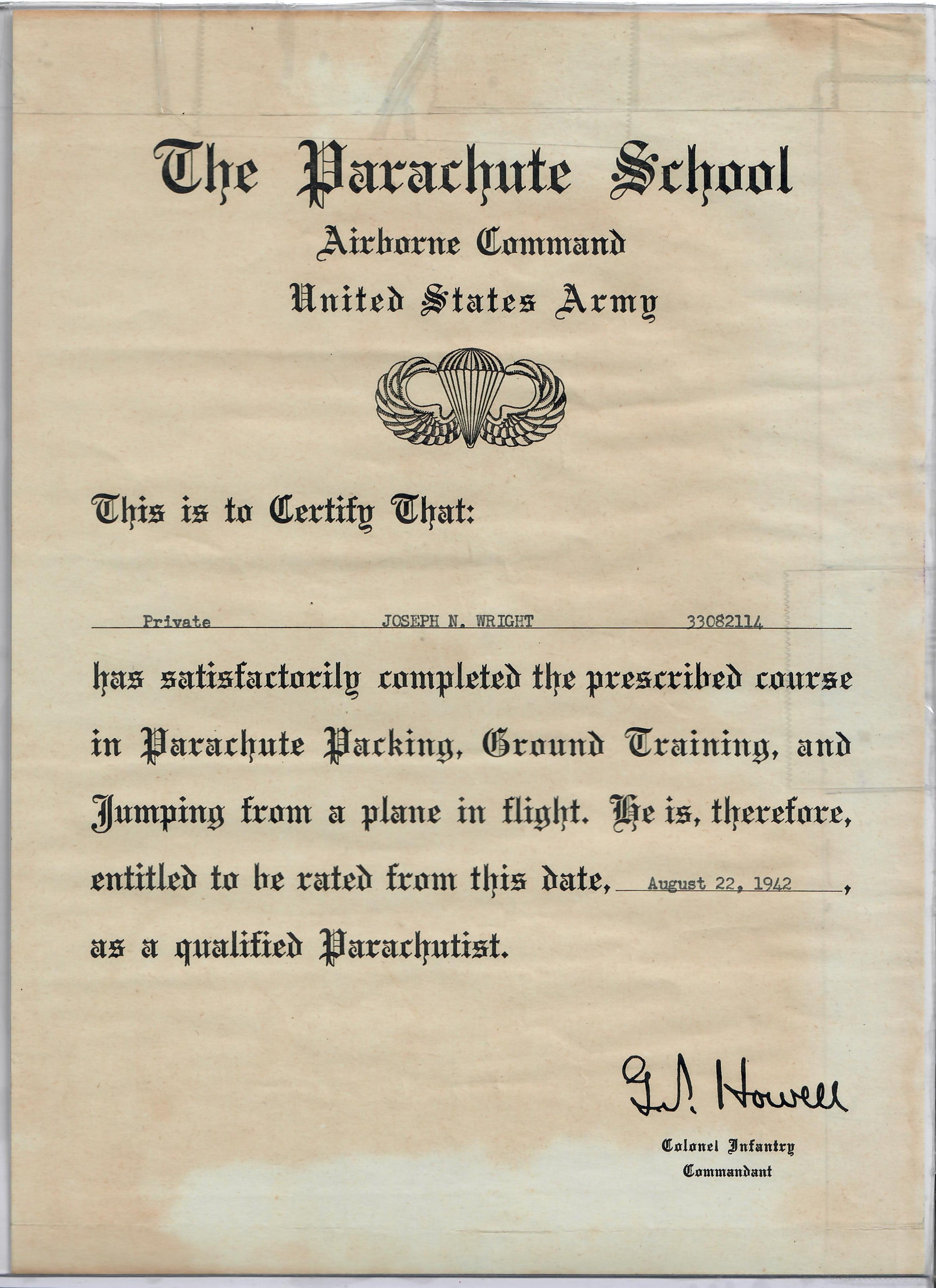 Original Items: One-of-a-kind set. This is a August 22nd, 1942 U.S. Army Parachute School qualified parachutist certificate named to Private Joseph N. Wright, ASN 33082114. Private Wright was assigned to the 82nd Airborne Division, 505th Parachute Infantry Regiment, Company H. He was born in 1919 in Philadelphia, Pennsylvania and was discharged in September 1945.