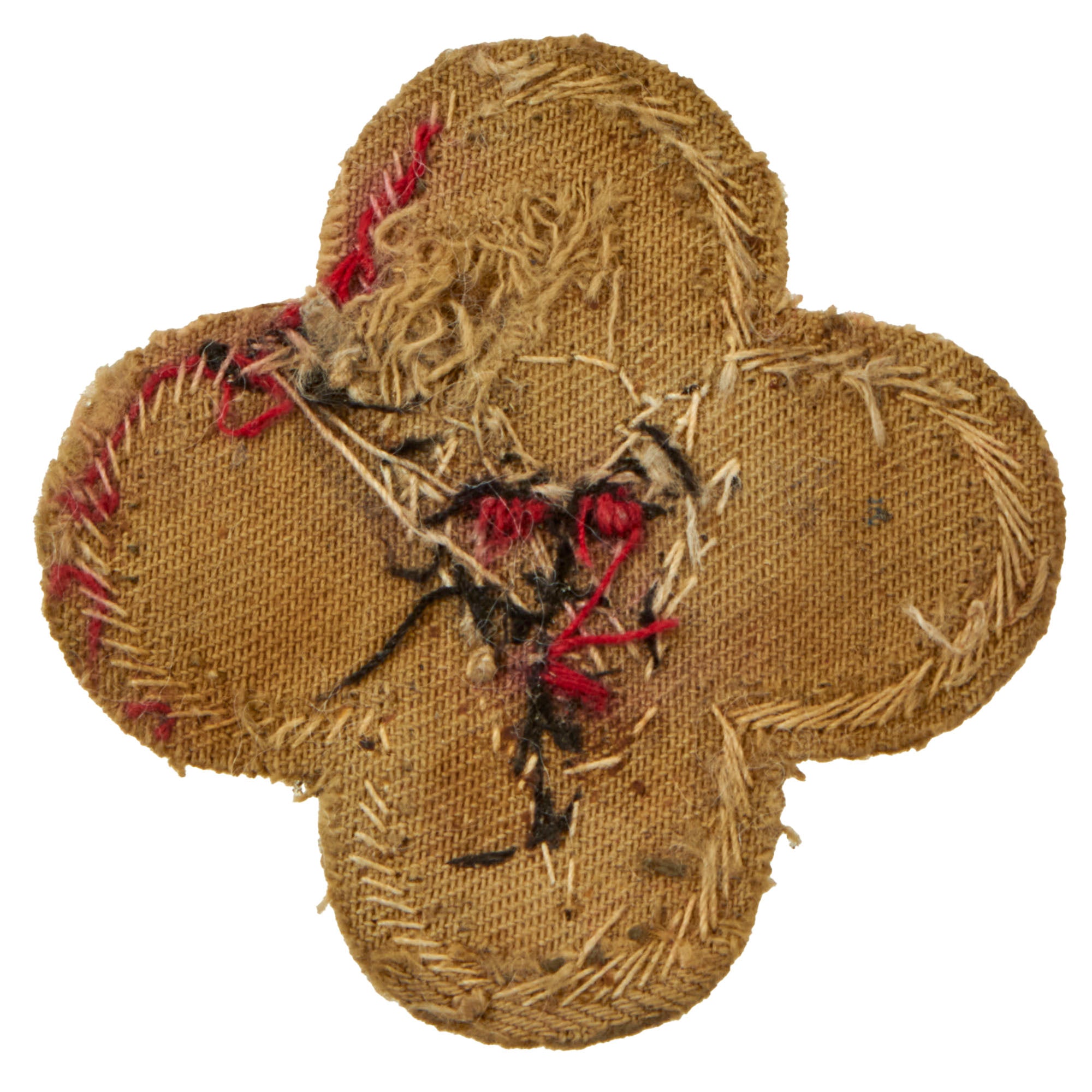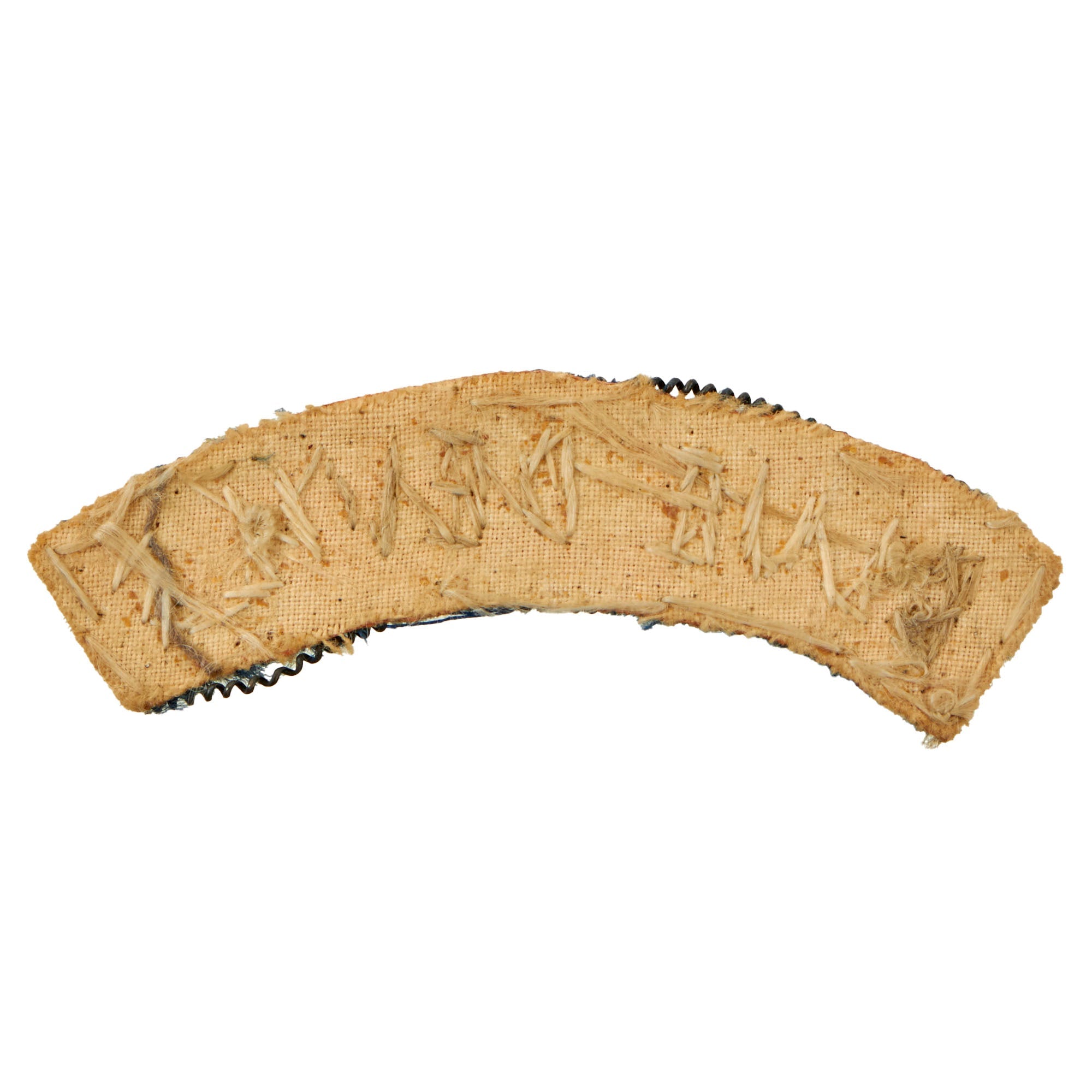 The patch measures 2¼ x 2¼” and the rocker measures 1⅛ x 3⅛”. Both show the intricate stitch work to the reverse. There is some fraying of the material and overall wear but nothing too serious.