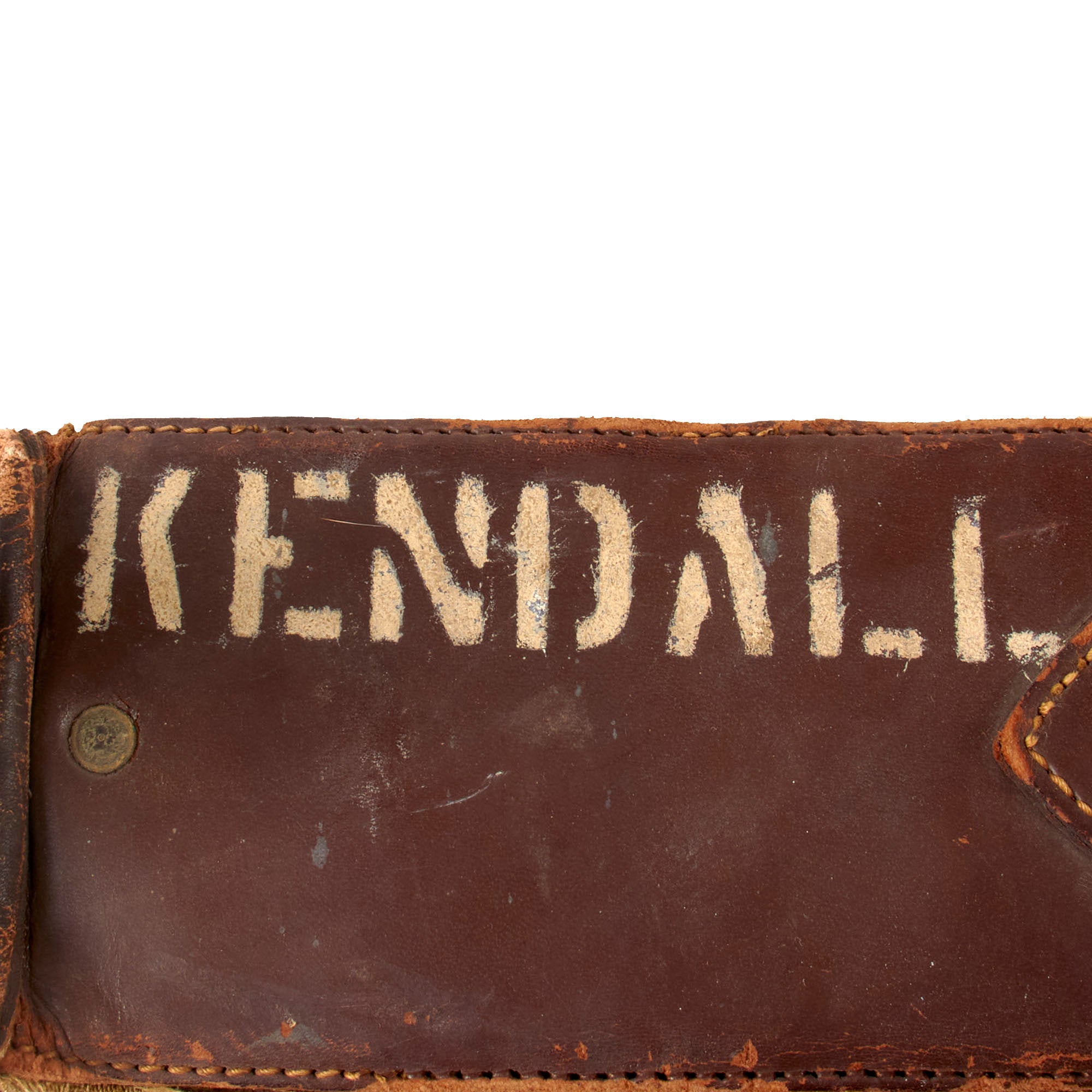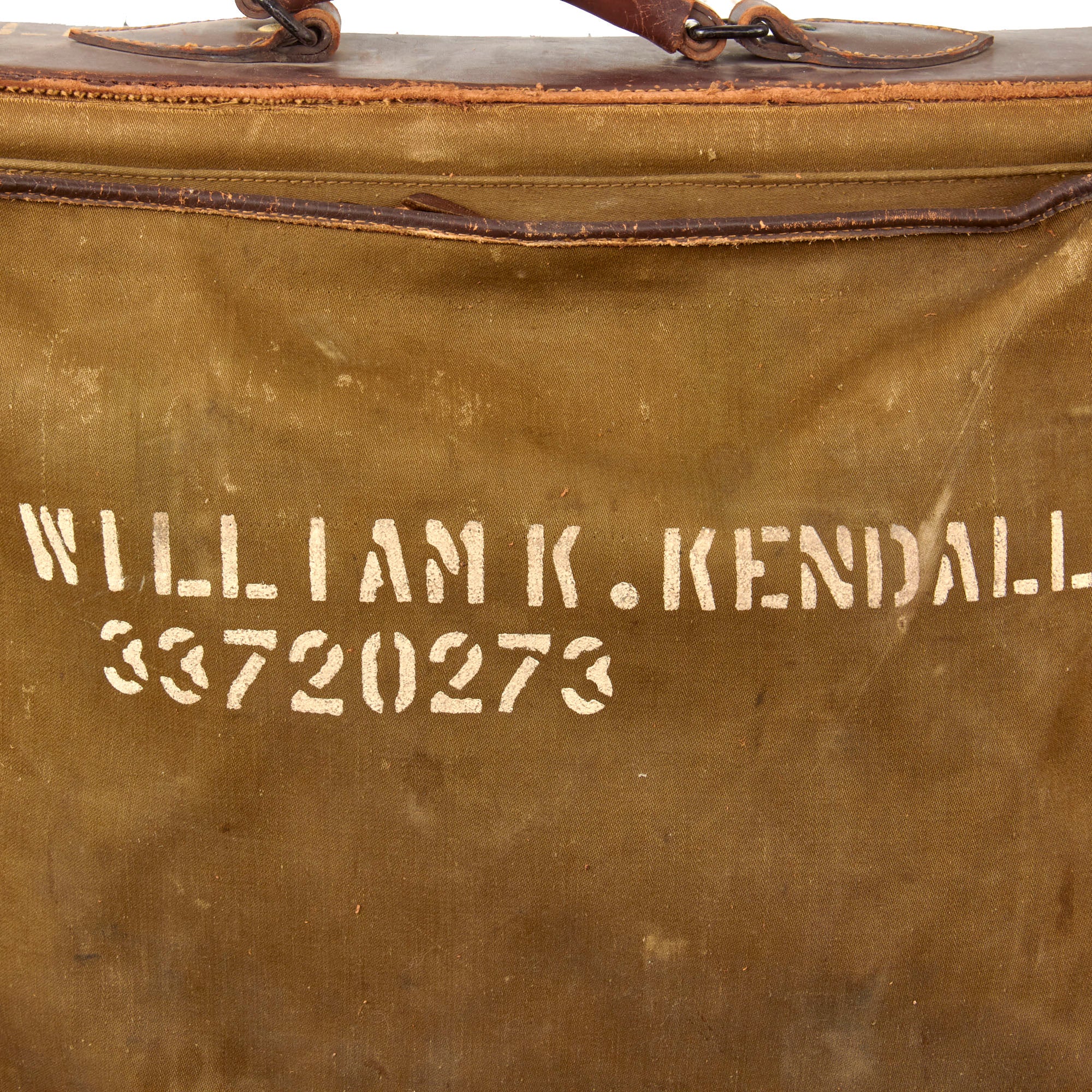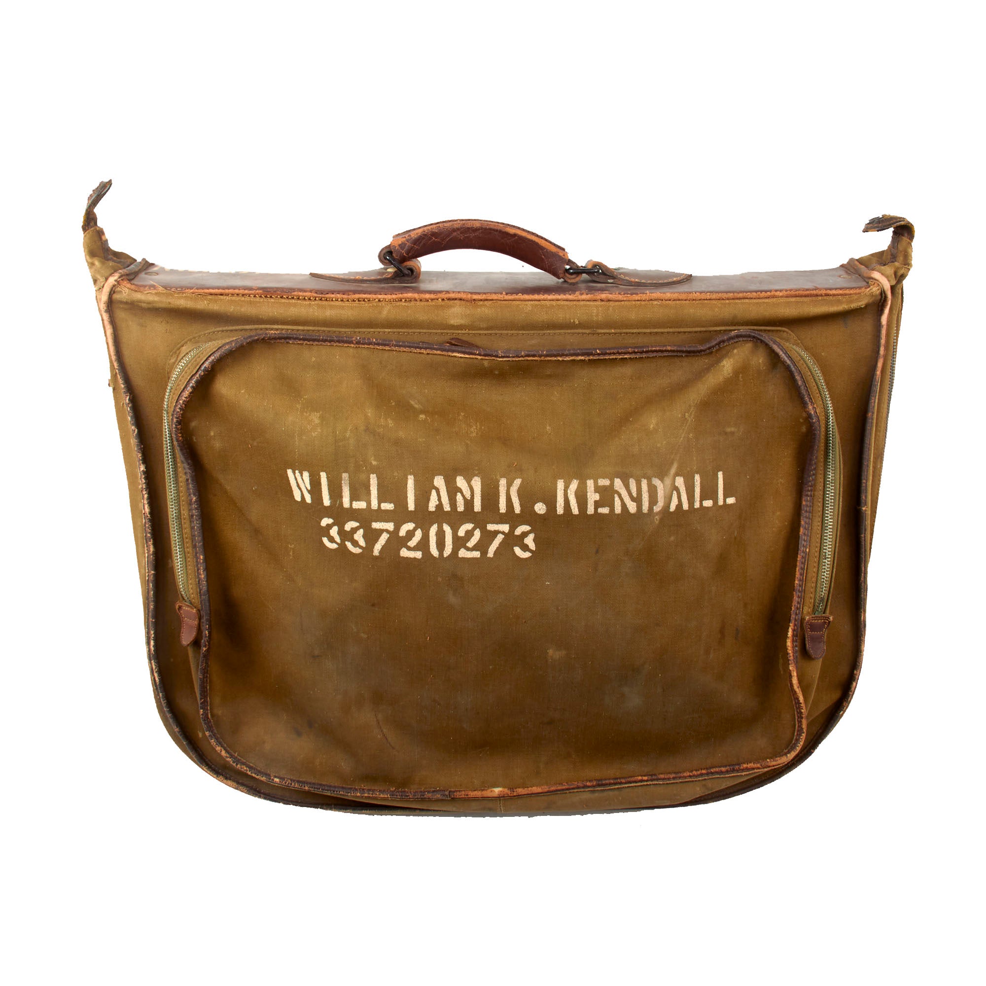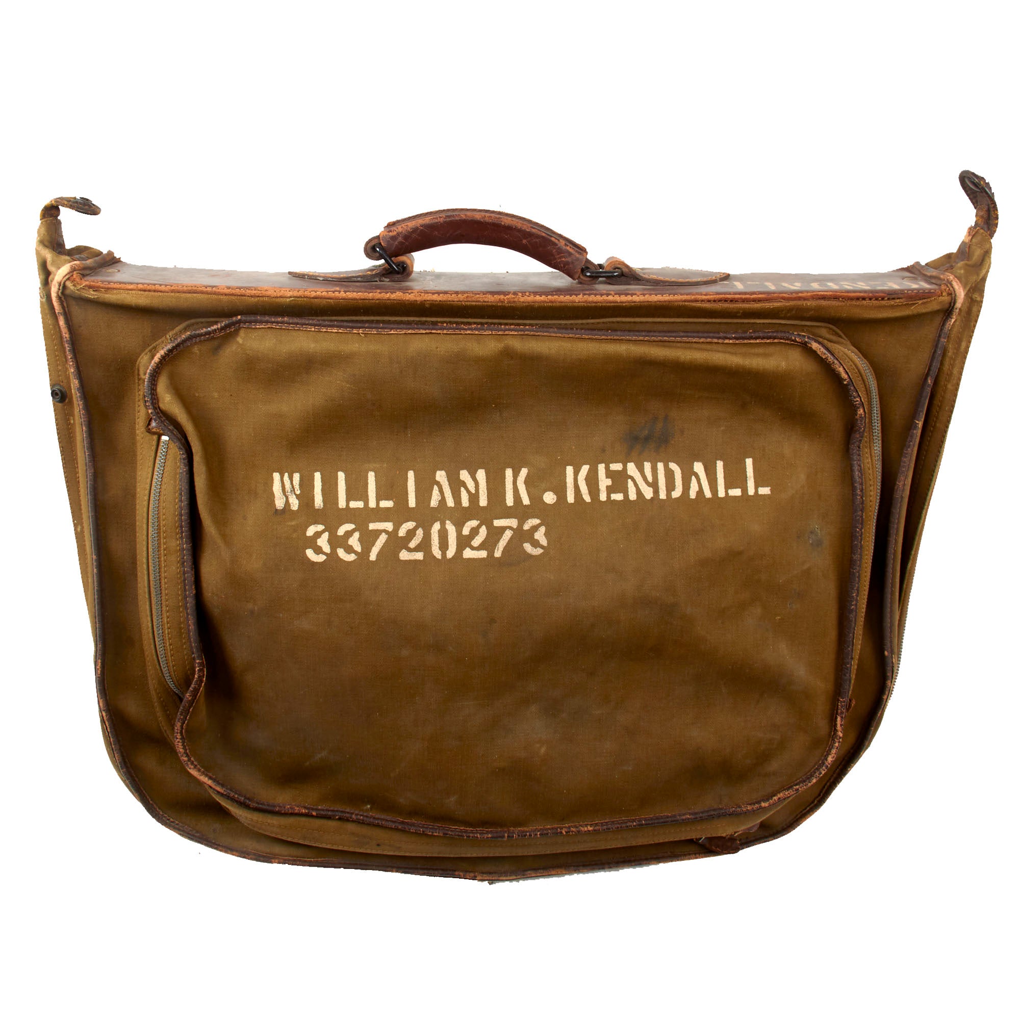 - Kendall’s B-4 Canvas flight crew bag with his name and number stenciled on both sides, heavy wear overall from use. Original data tag is retained showing manufacture by Canvas Products Corp.