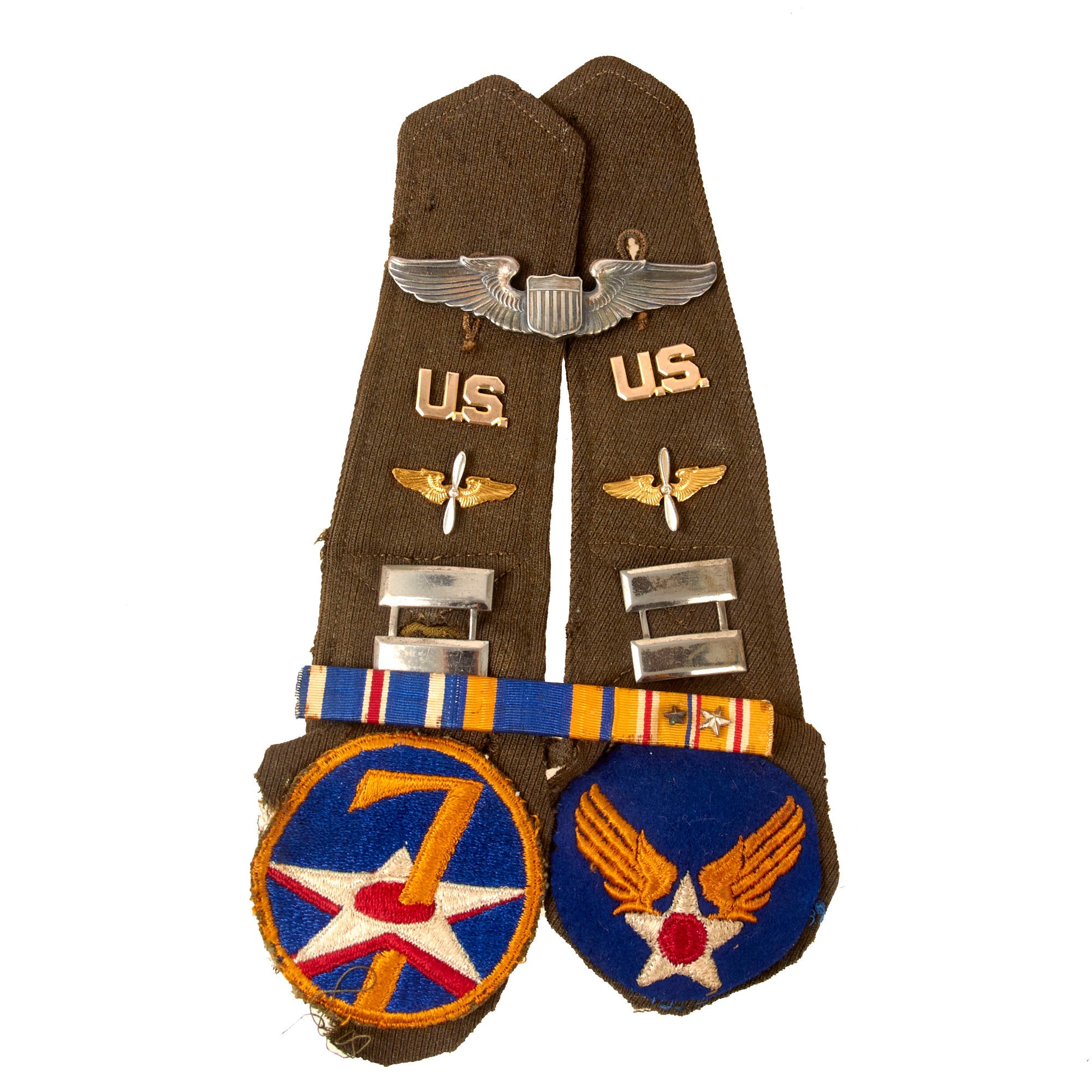 - Set of shoulder boards and patches from an AAF Captain Pilot in the 7th Air Force. Not Kendall’s possibly belonging to a relative. Attached is a ribbon bar with the DFC, Air Medal, Asiatic-Pacific campaign medal. Not Kendall’s.