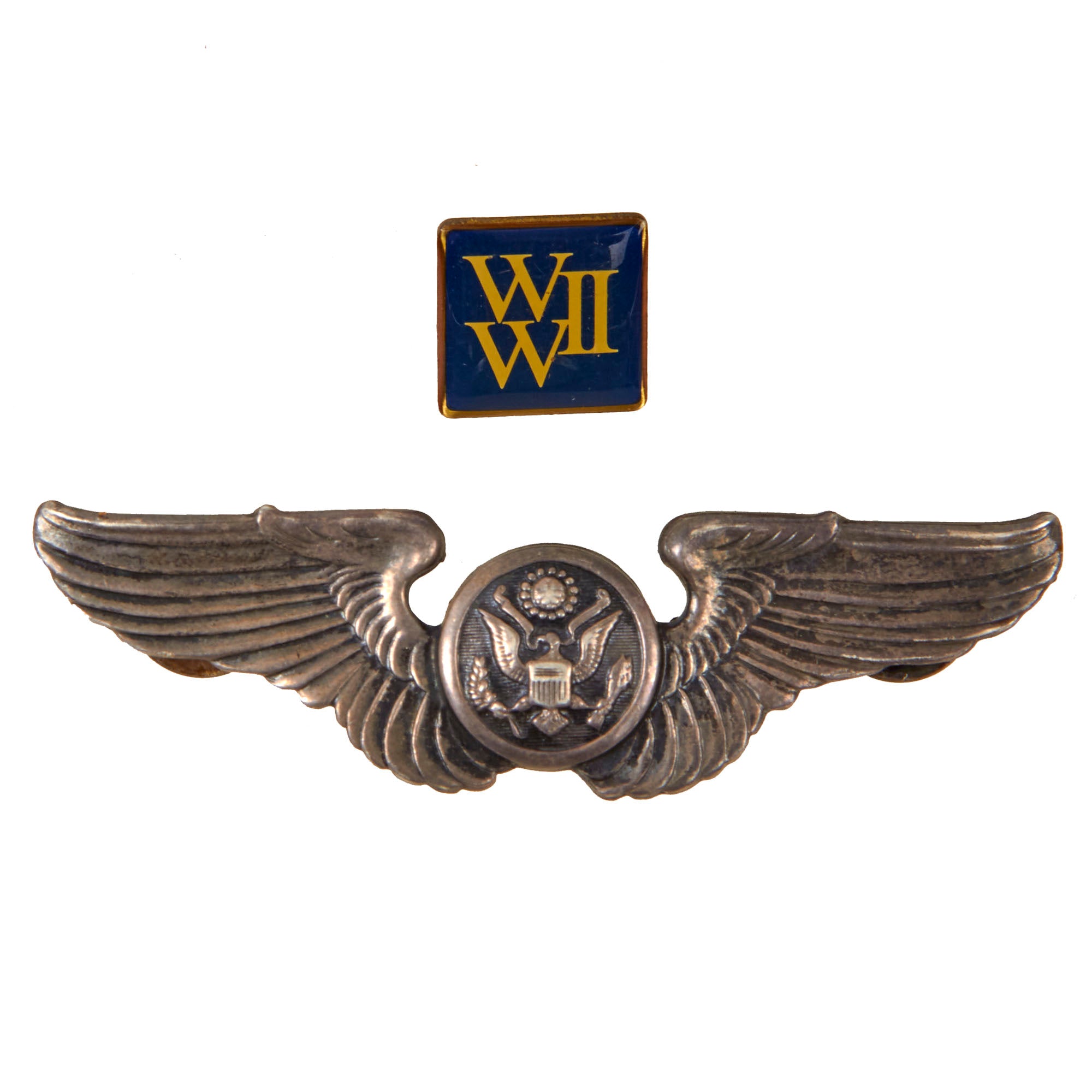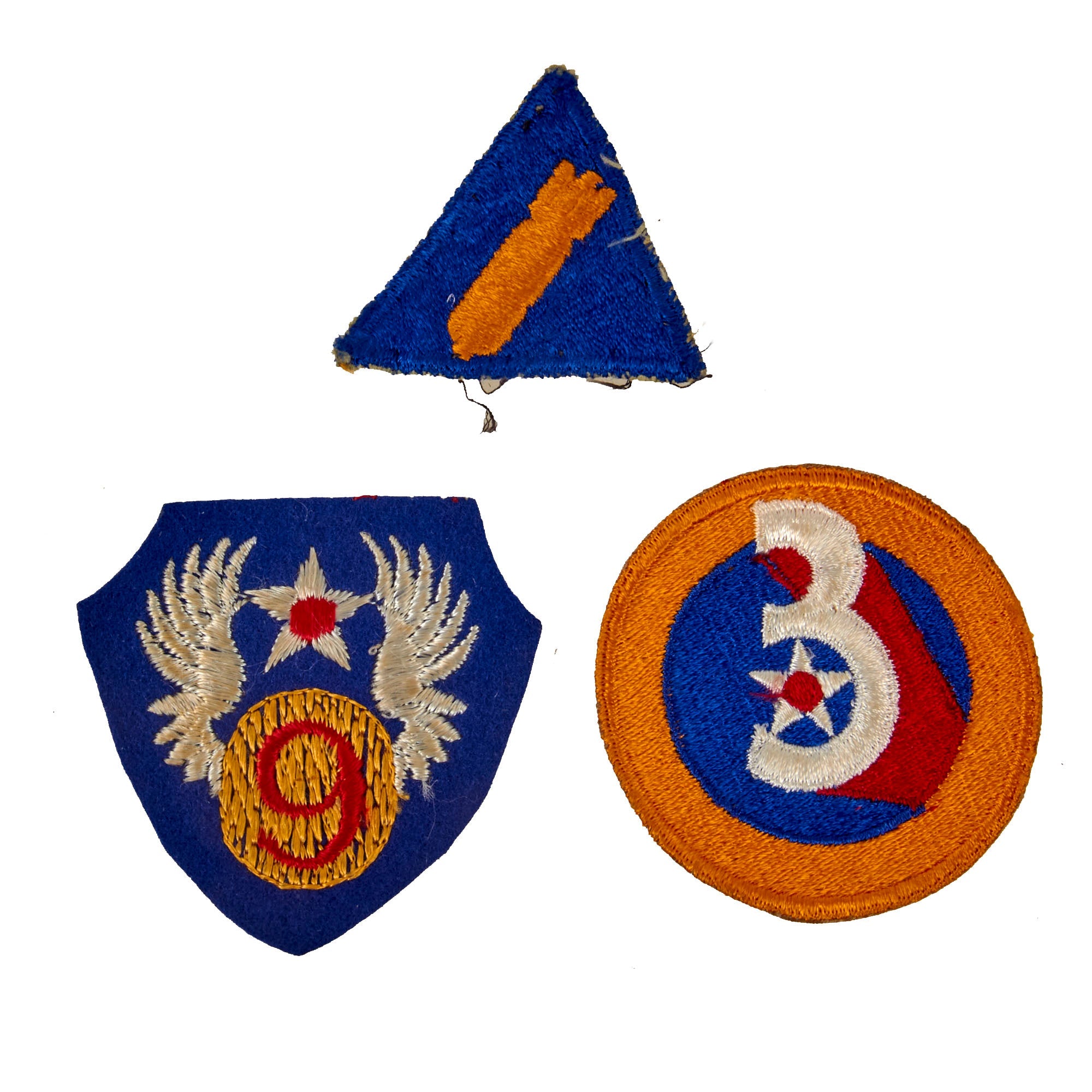 - Air Medal box with Sterling Aircrew wings, 3rd Air Force and 9th Air Force patches, Coastal bomber triangle patch, Good Conduct medal, VFW Ribbon, WWII pin, and piece of shrapnel likely recovered by Kendall.