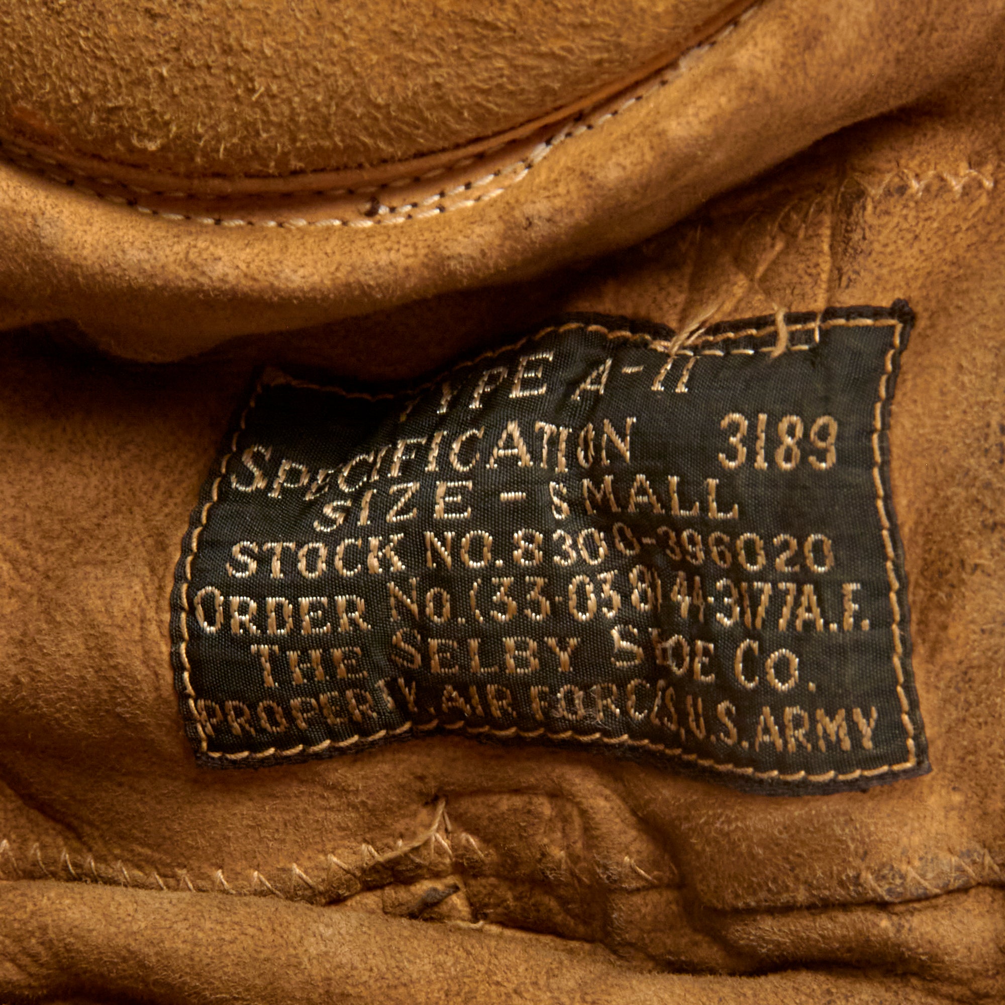 - Type A-11 leather flight helmet in Size Small with 1944 contract date. Manufactured by the Selby Shoe Co.