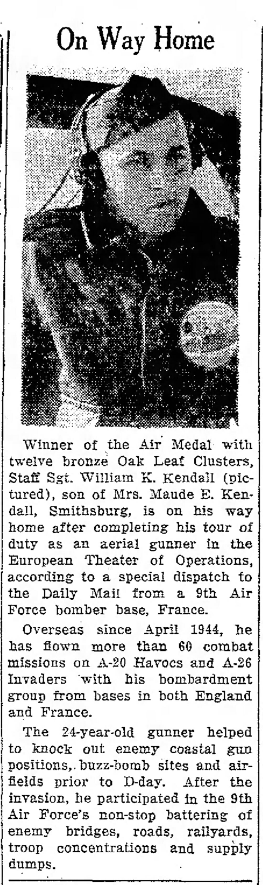 William Keiffer Kendall was born on June 27th, 1920 in Smithsburg, Maryland. He enlisted on April 9th, 1943 in Baltimore, Maryland, and trained as a turret gunner to serve aboard A-20 and A-26 bombers. He served overseas with the 641st Bombardment Squadron, 409th Bombardment Group, 9th Air Force, flying a staggering 60 combat missions and being awarded the Air Medal with 12 oak leaf clusters, and the Distinguished Flying Cross. He was discharged on May 29th, 1945, and passed away on November 28th, 2006 at the age of 86.