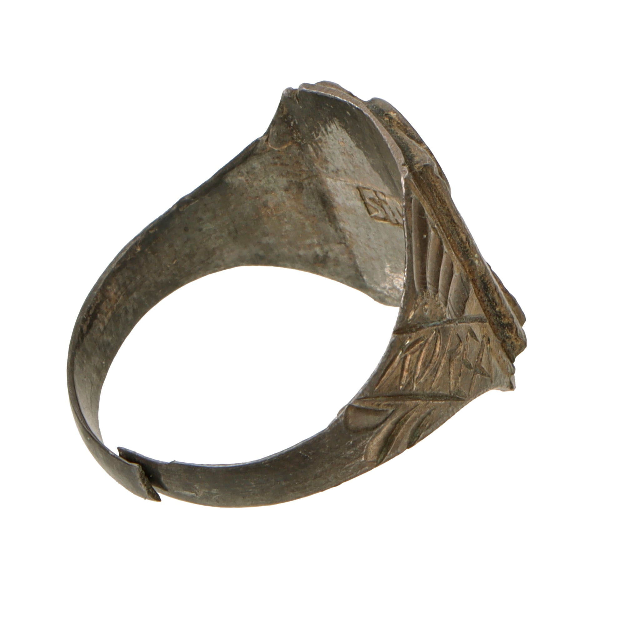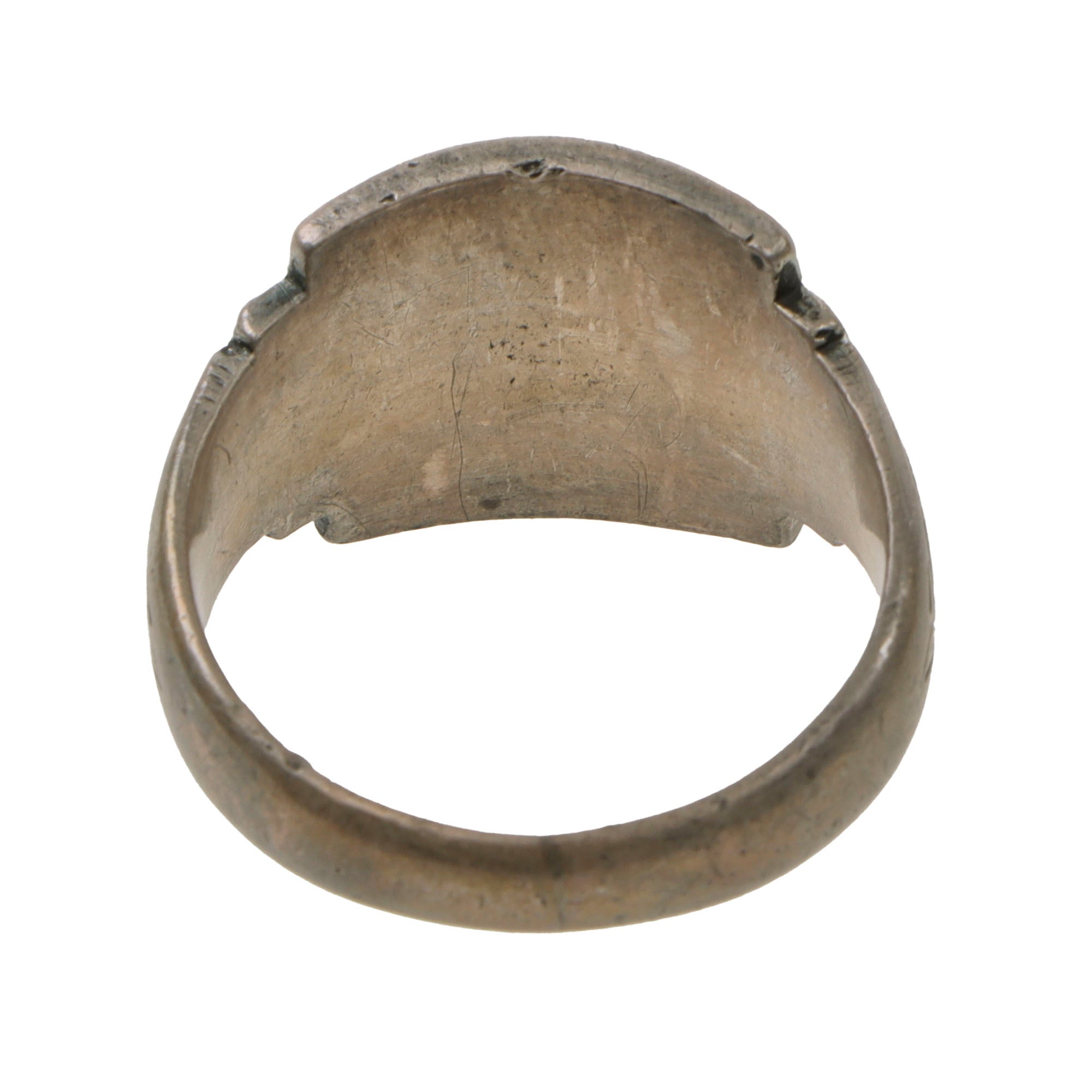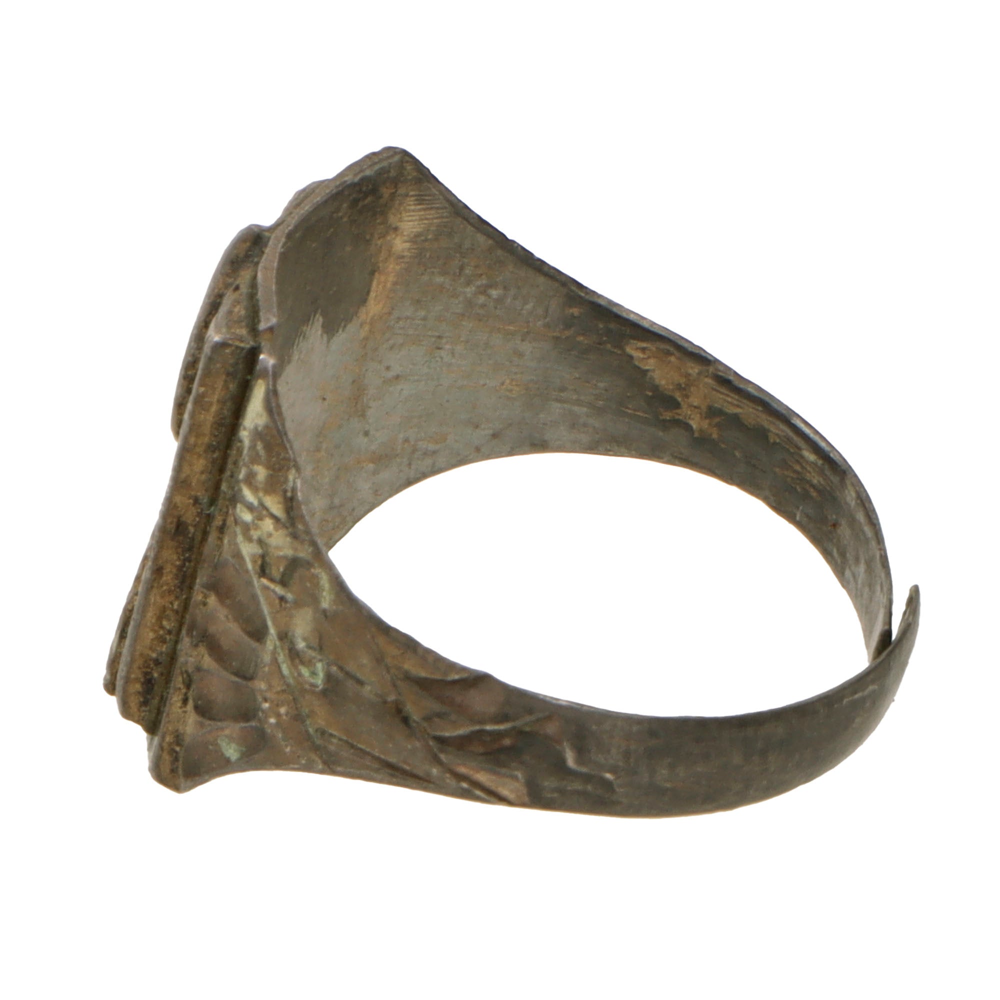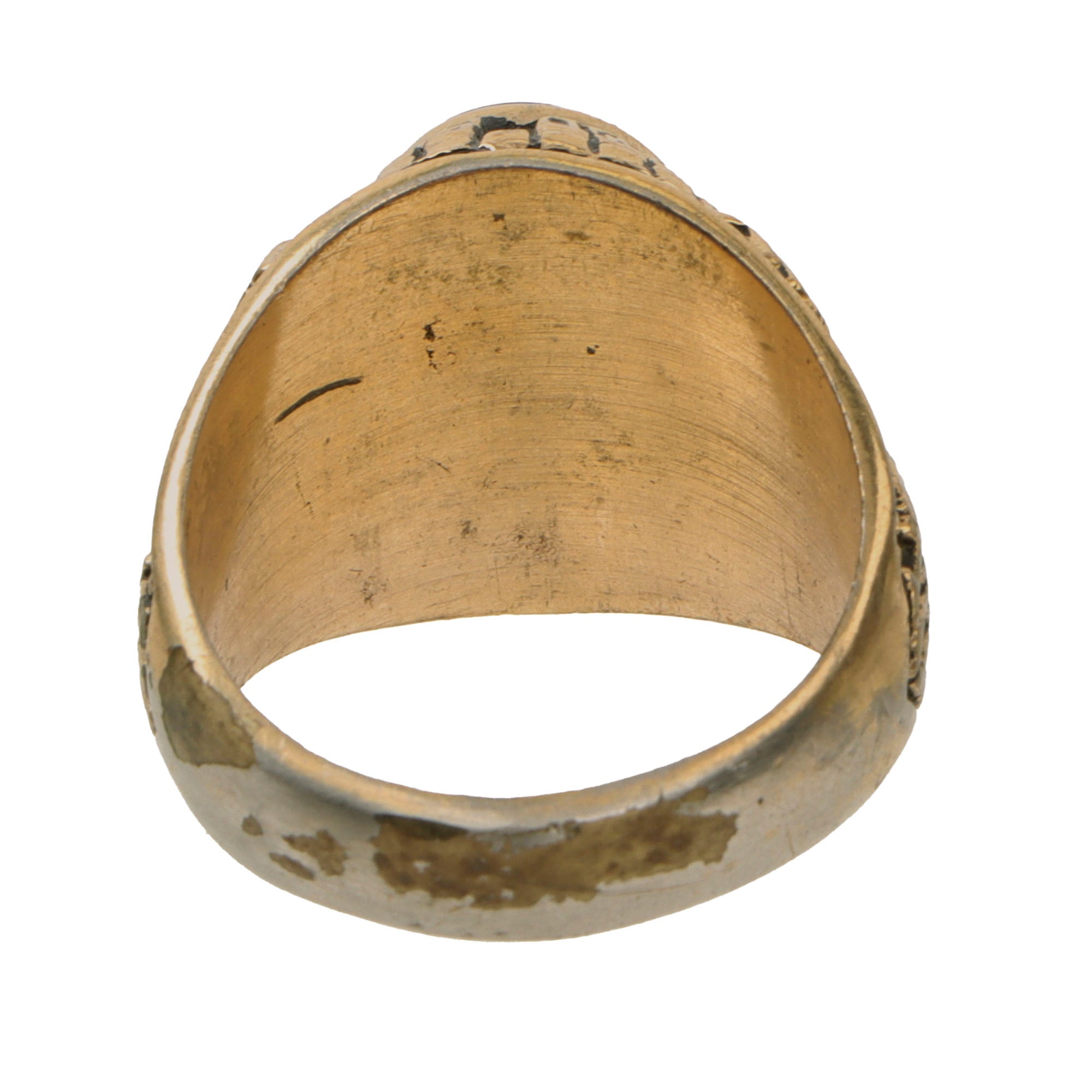 - Korean War Ring with Ying Yang symbol over half flower insignia both with enamel, KOREA 1952 to the sides.