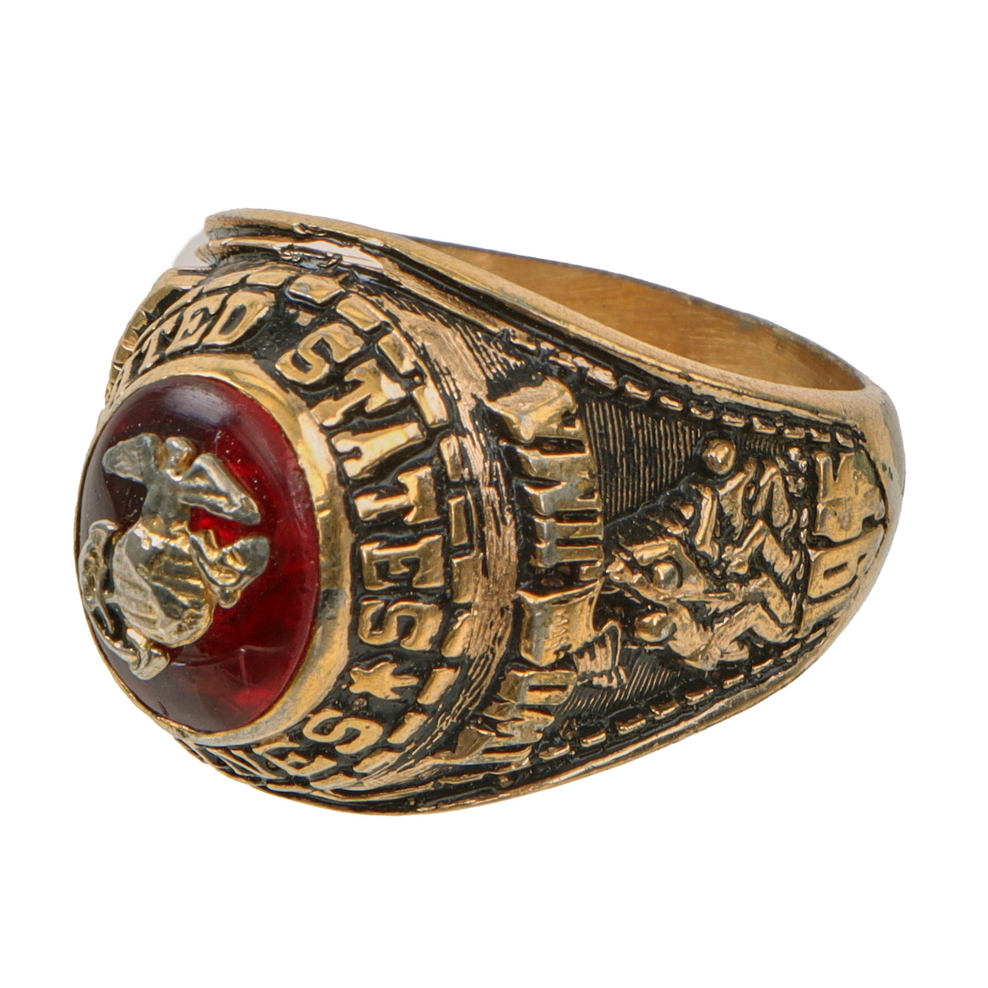 - United State Marine Corps ring with dark red stone and EGA on top. Shows Tun Tavern 1775 on one side, birthplace of the Marine Corps, and Iwo Jima 1945 on the other.
