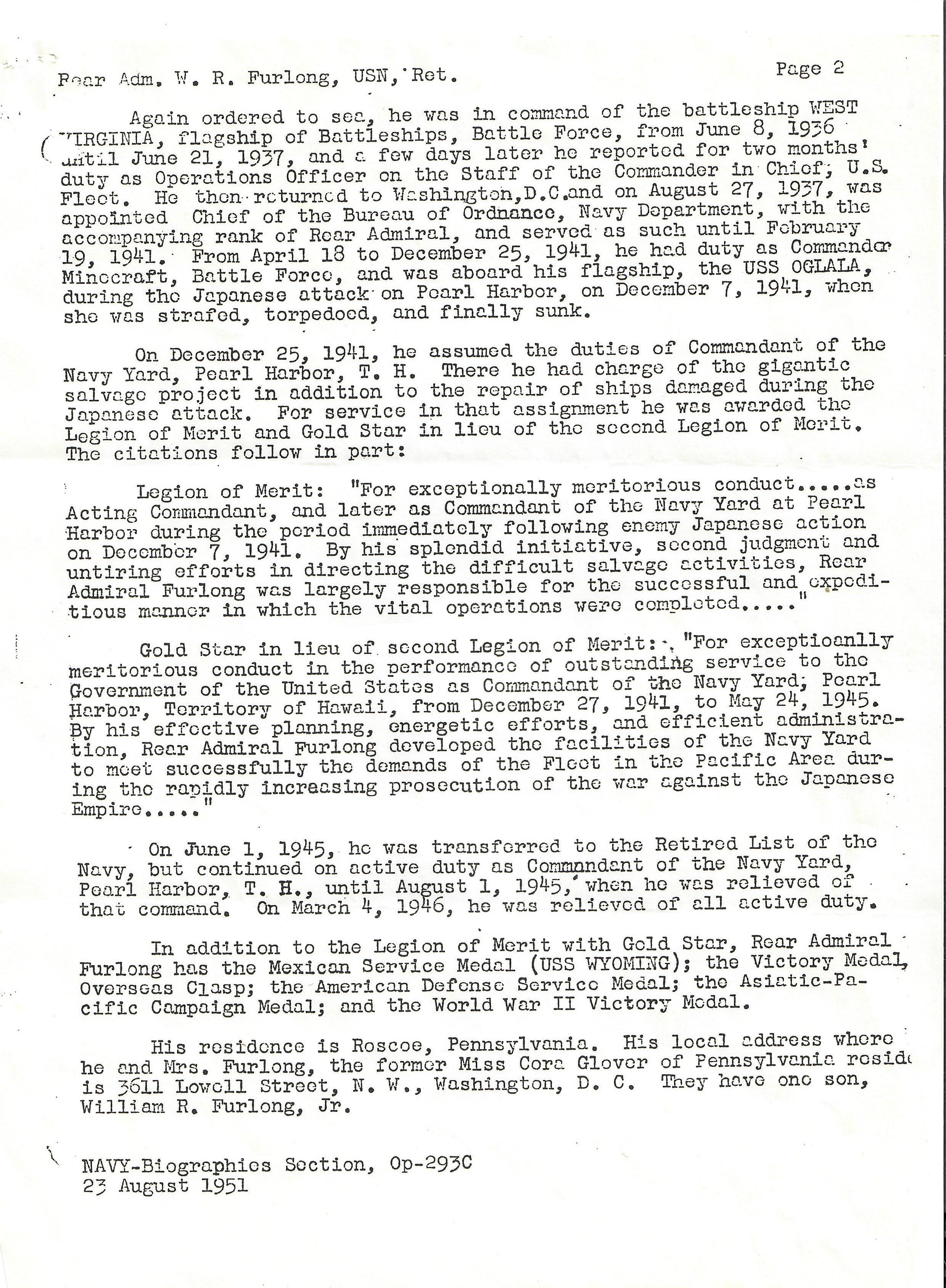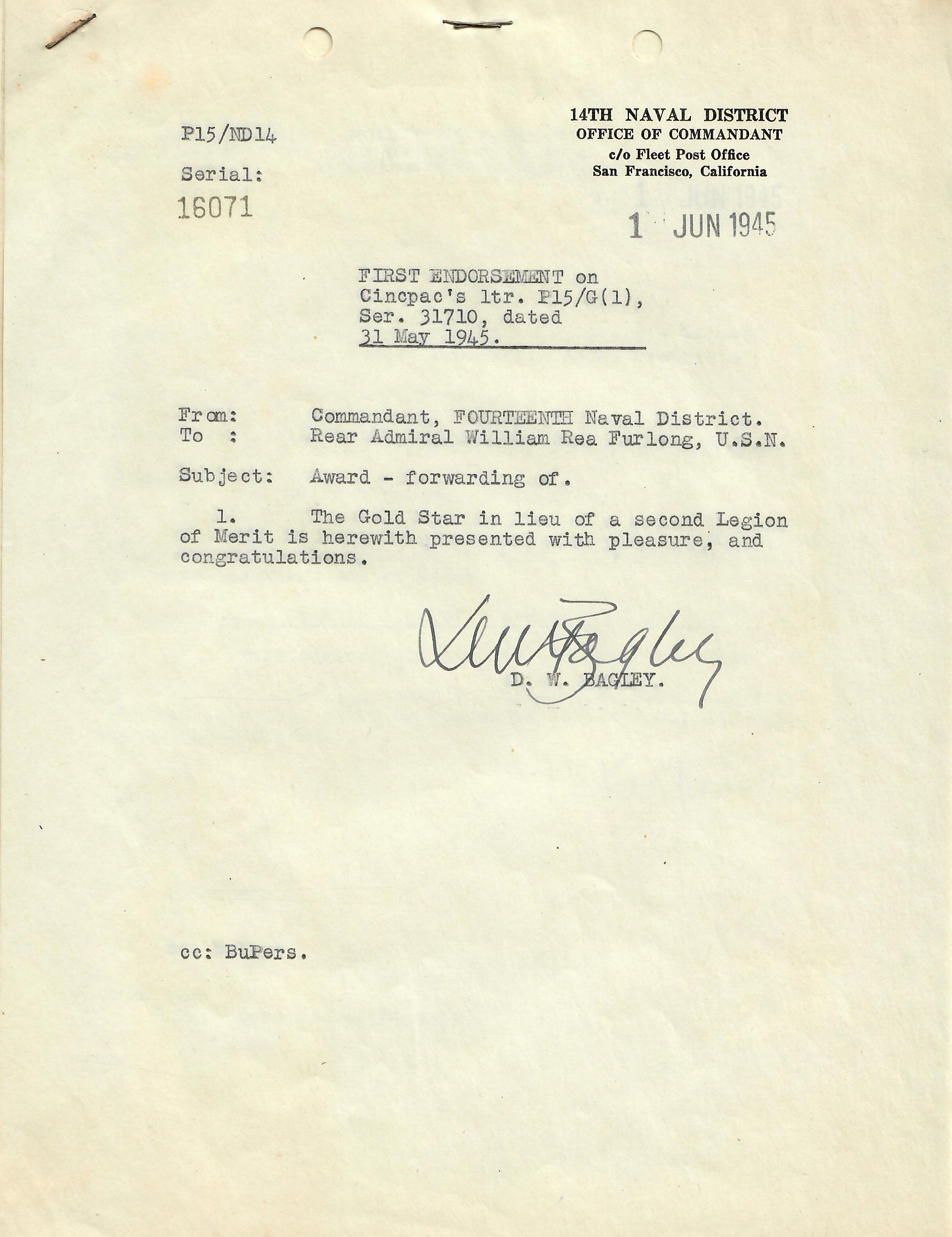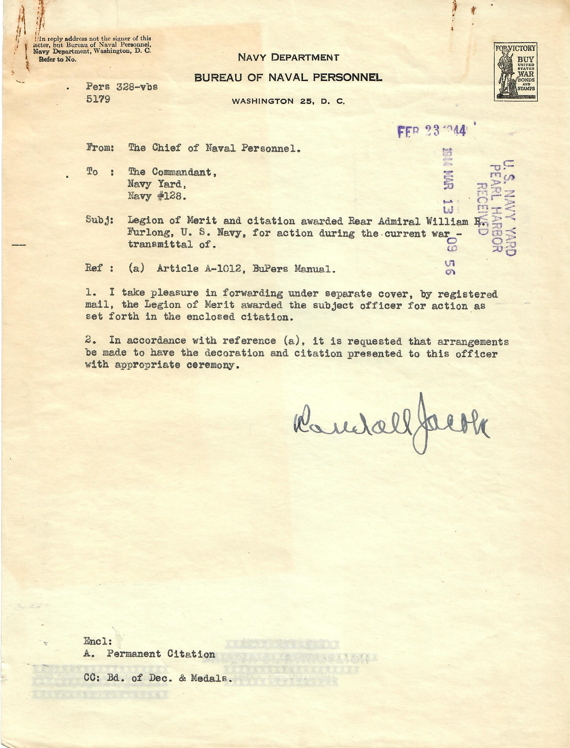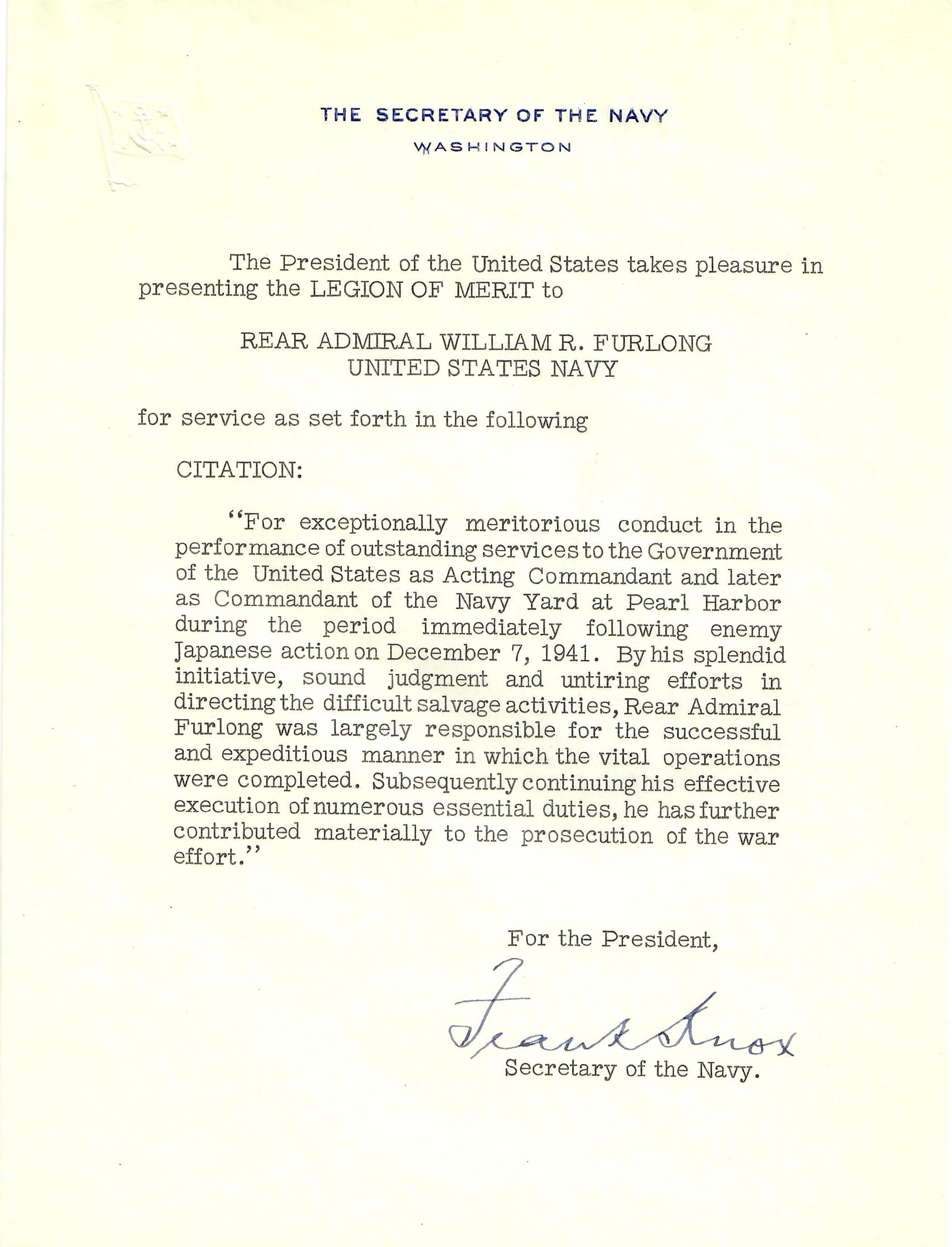 - Admiral Furlong’s US Pacific Fleet Legion of Merit Certificate signed by Frank Knox, Secretary of the Navy for his first award. The citation reads: “For exceptionally meritorious conduct in the performance of outstanding services to the Government of the United States as Acting Commandant and later as Commandant of the Navy Yard at Pearl Harbor during the period immediately following enemy Japanese action on December 7, 1941. By his splendid initiative, sound judgment and untiring efforts in directing the difficult salvage activities, Rear Admiral Furlong was largely responsible for the successful and expeditious manner in which the vital operations were completed. Subsequently continuing his effective execution of numerous essential duties, he has further contributed materially to the prosecution of the war effort."
