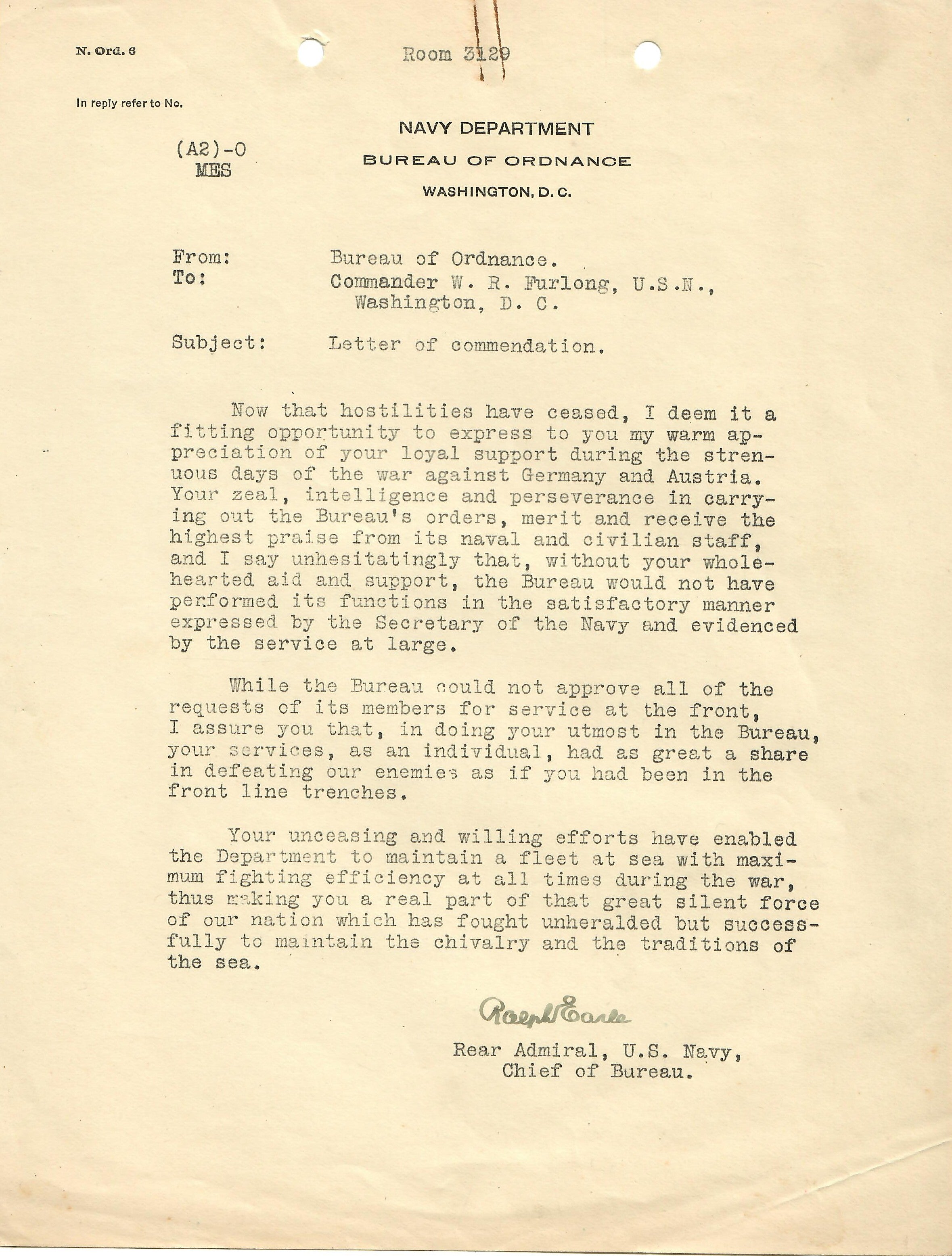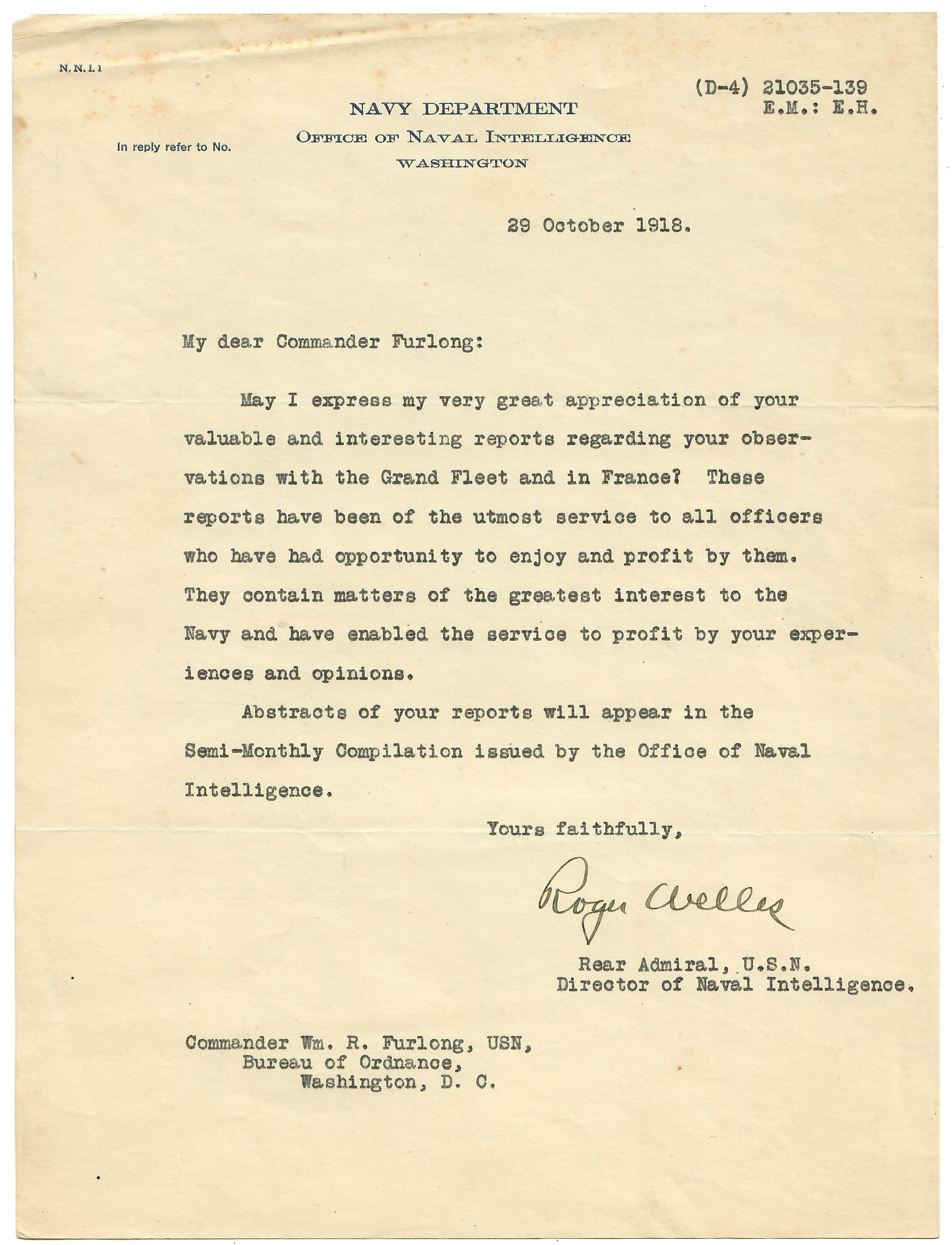 - Letter from Director of Naval Intelligence thanking Furlong for his valuable and interesting reports regarding his observations with the Grand Fleet and in France. Dated October 28th, 1918.