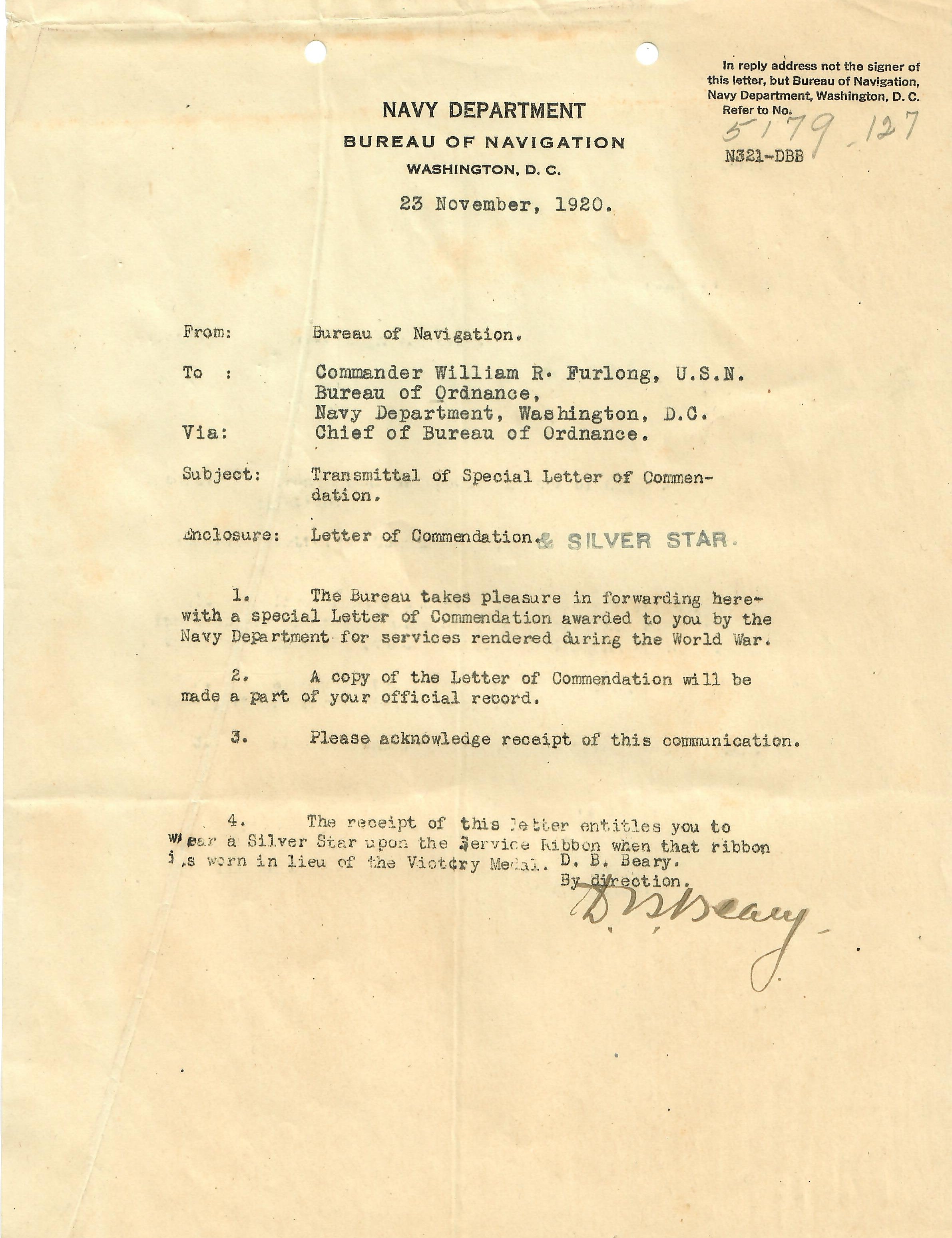 - Letter of Commendation to Furlong for his work during World War I, for which he was awarded a silver star citation. Along with this is the accompanying letter denoting his silver star. Both are dated 1920.