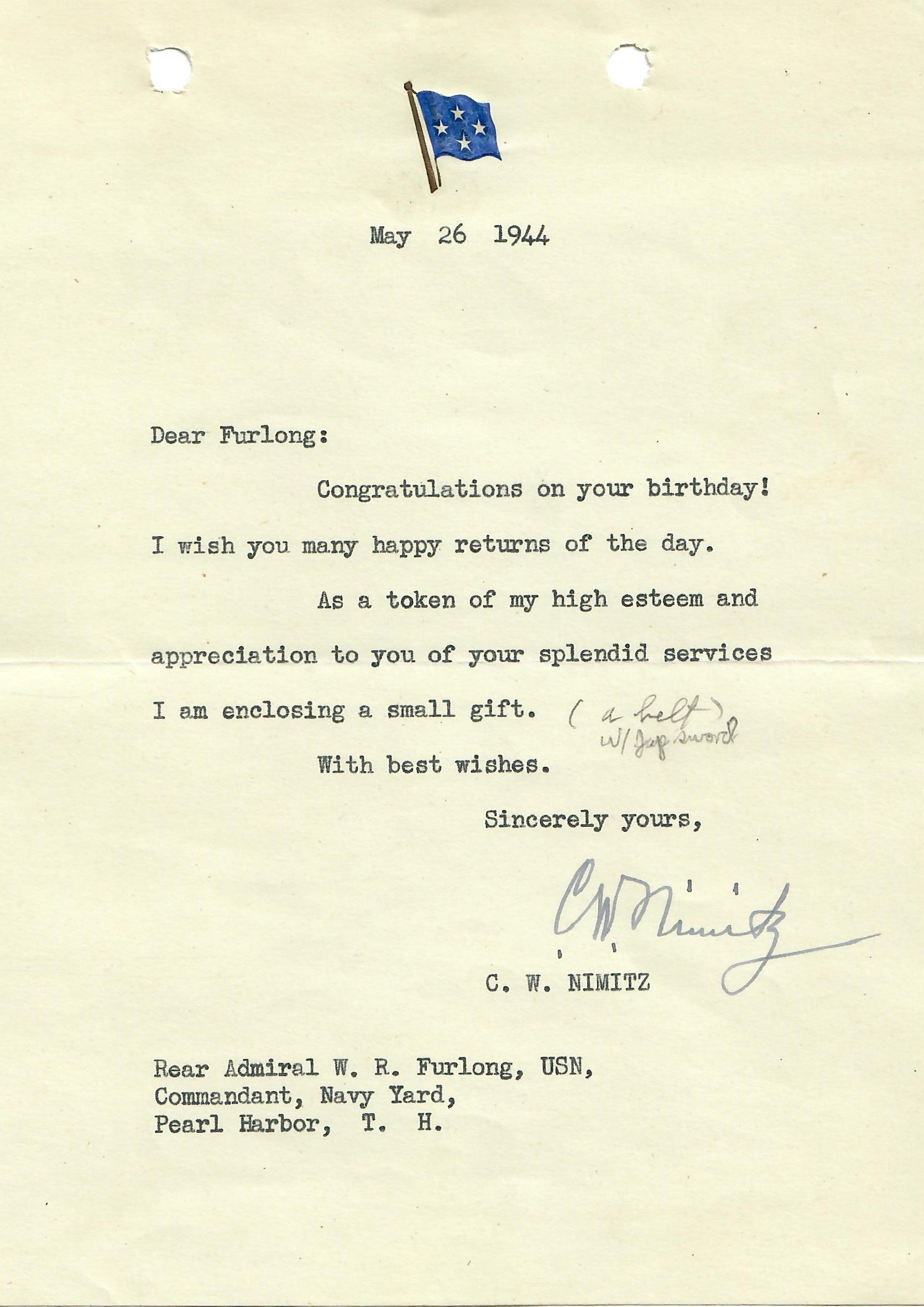 - Signed Letter from Charles Nimitz dated May 26th, 1944 wishing him a happy birthday and gifting him the Japanese sword “as a token of my high esteem and appreciation to you of your splendid services”.