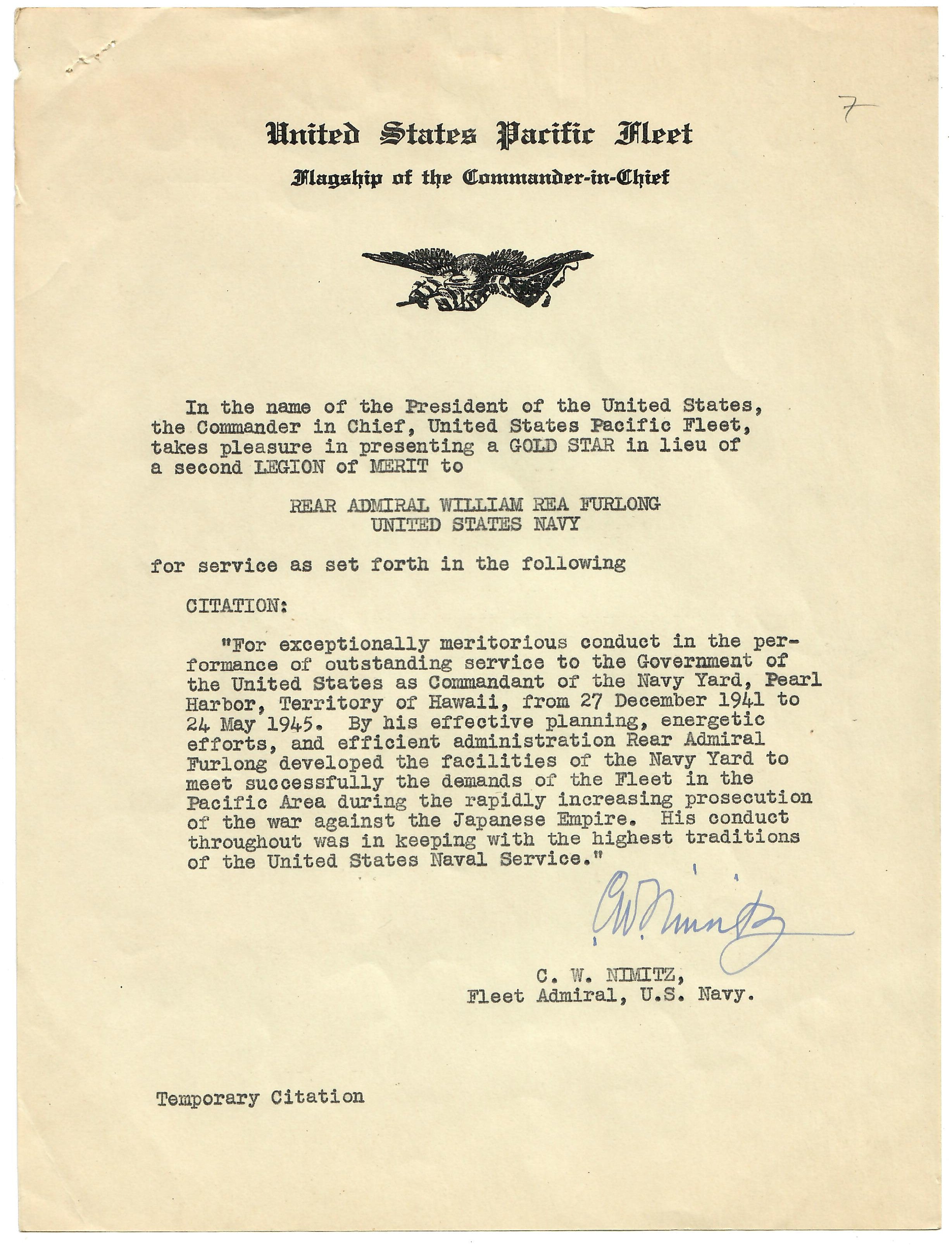 - Admiral Furlong’s US Pacific Fleet Legion of Merit Certificate signed by Nimitz, for his second award. The citation reads: “for exceptionally meritorious conduct in the performance of outstanding services to the Government of the United States as Commandant of the Pearl Harbor Navy Yard, Territory of Hawaii, during and following the Japanese attack on 7 December 1941. His splendid initiative and untiring efforts were largely responsible for the successful and expeditious manner in which vital salvage was accomplished. The singularly distinctive accomplishments of Rear Admiral Furlong and his dedicated contributions in the service of his country reflect the highest credit upon himself and the United States Naval Service.”