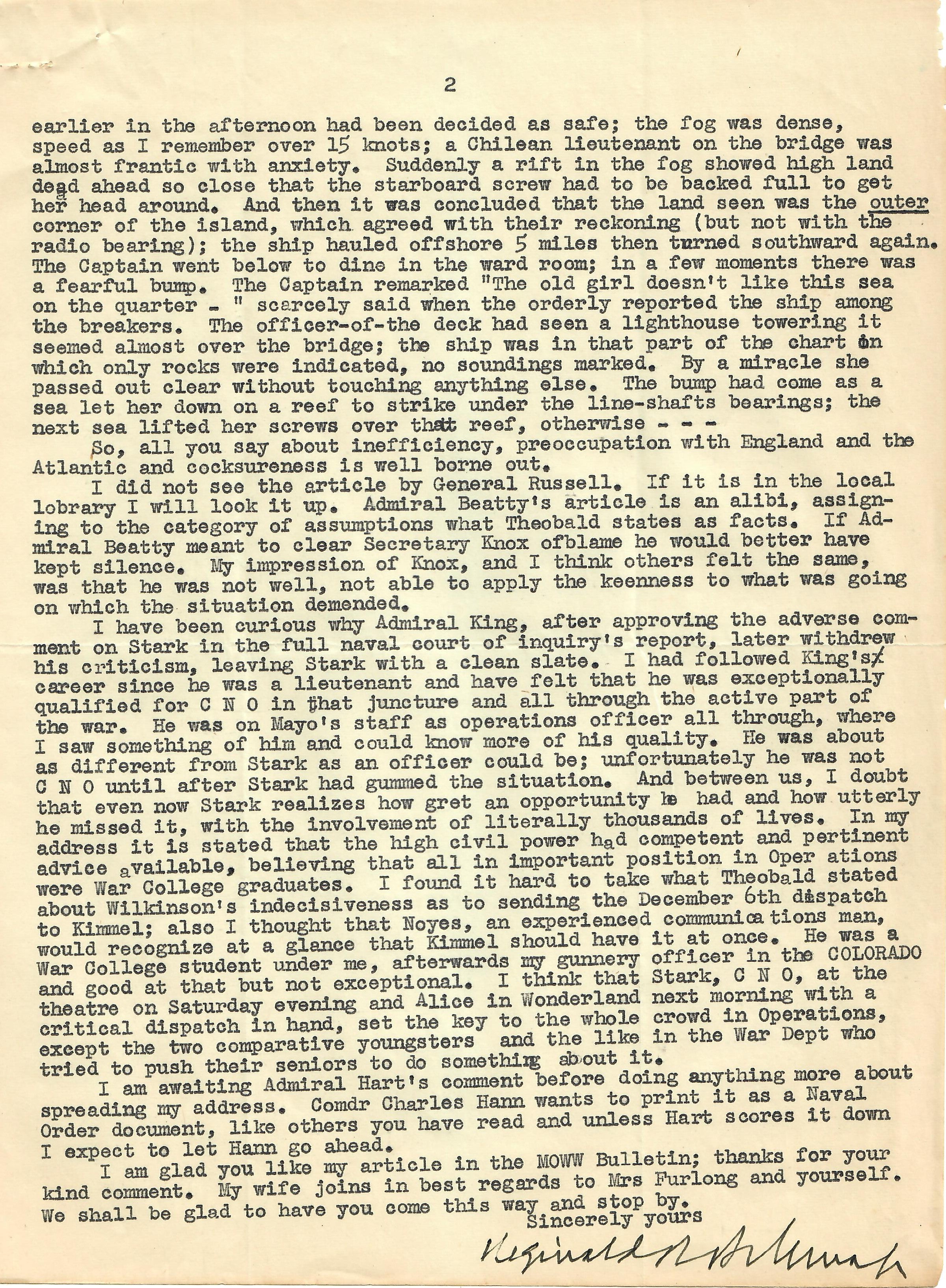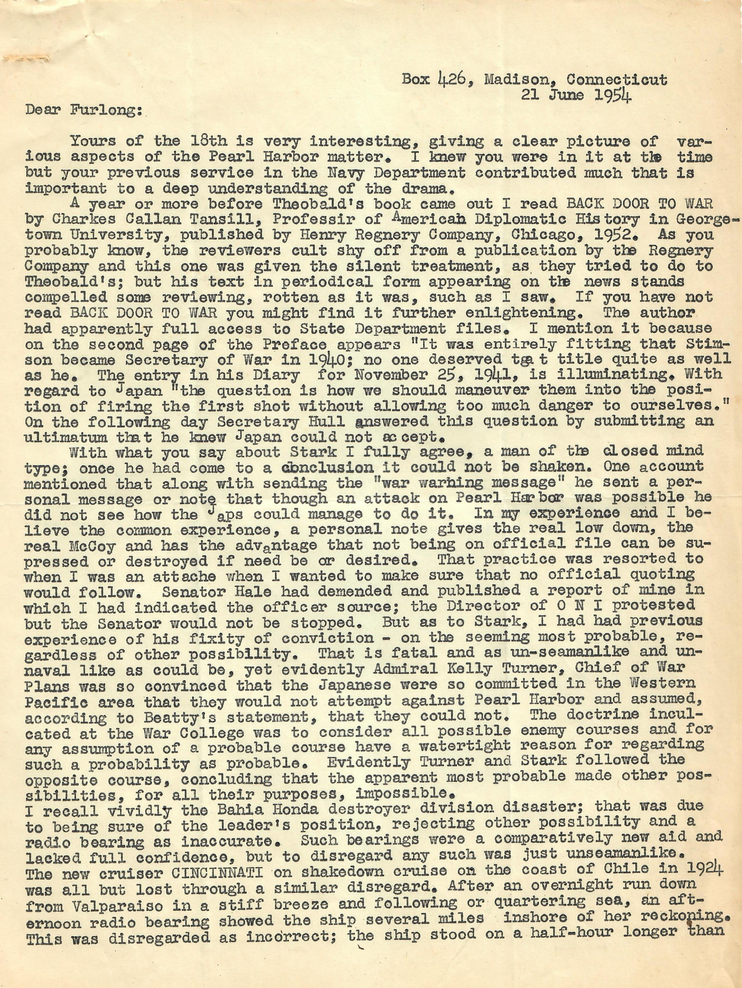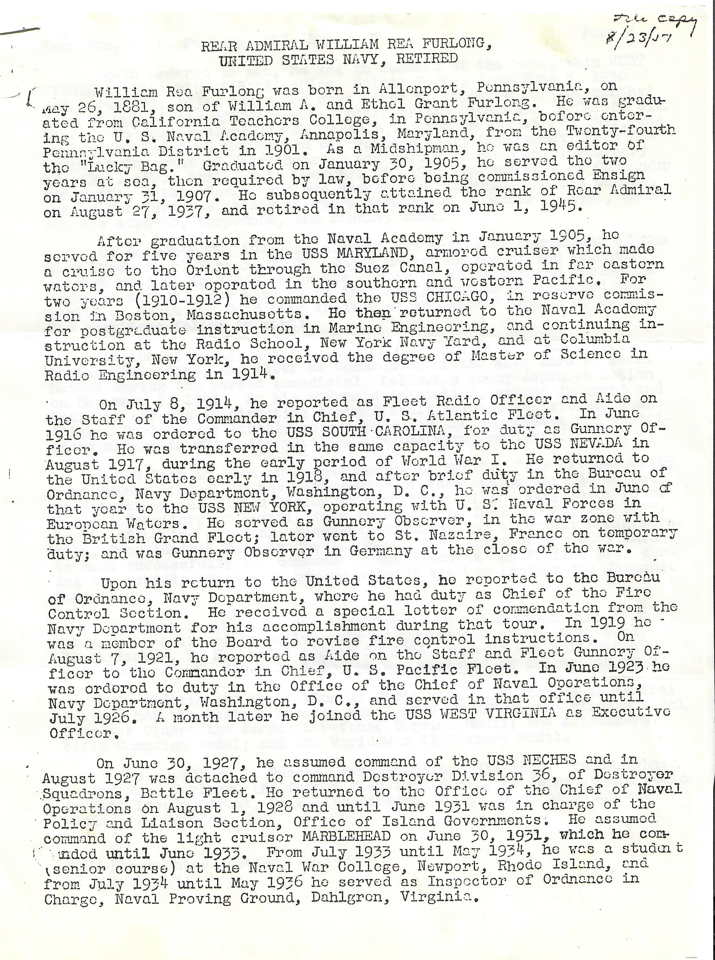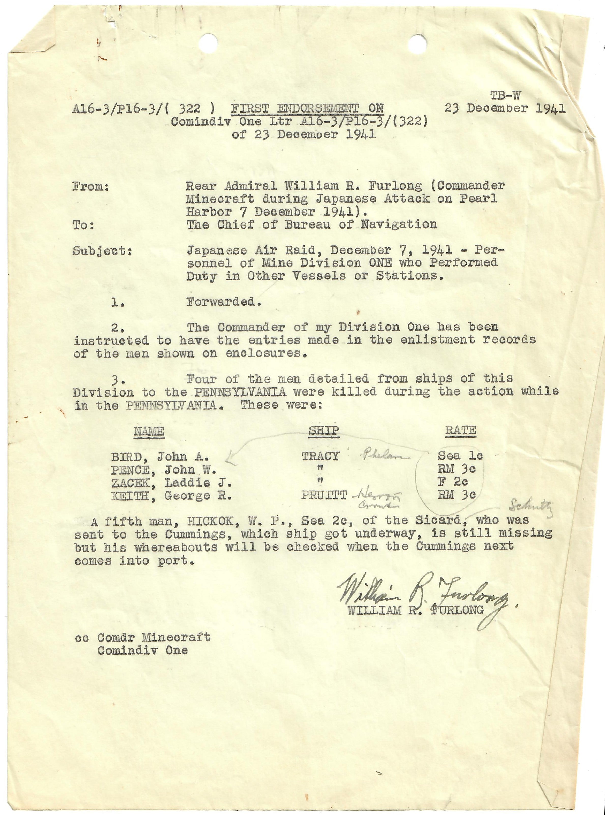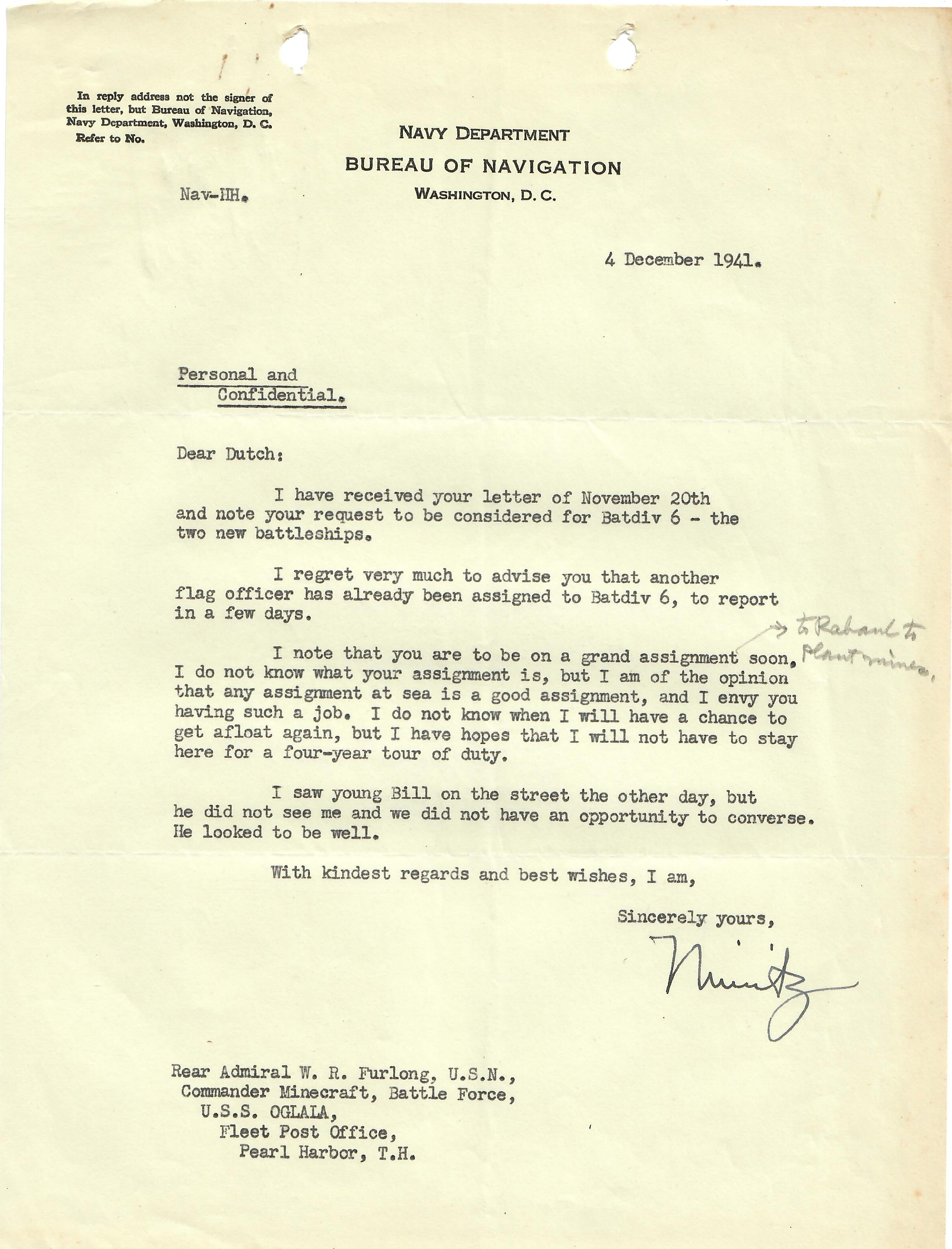 - Letter from Chester Nimitz to Furlong dated December 4th, 1941 telling him that he won’t be chosen as commander of Batdiv 6. Three days before Pearl Harbor.
