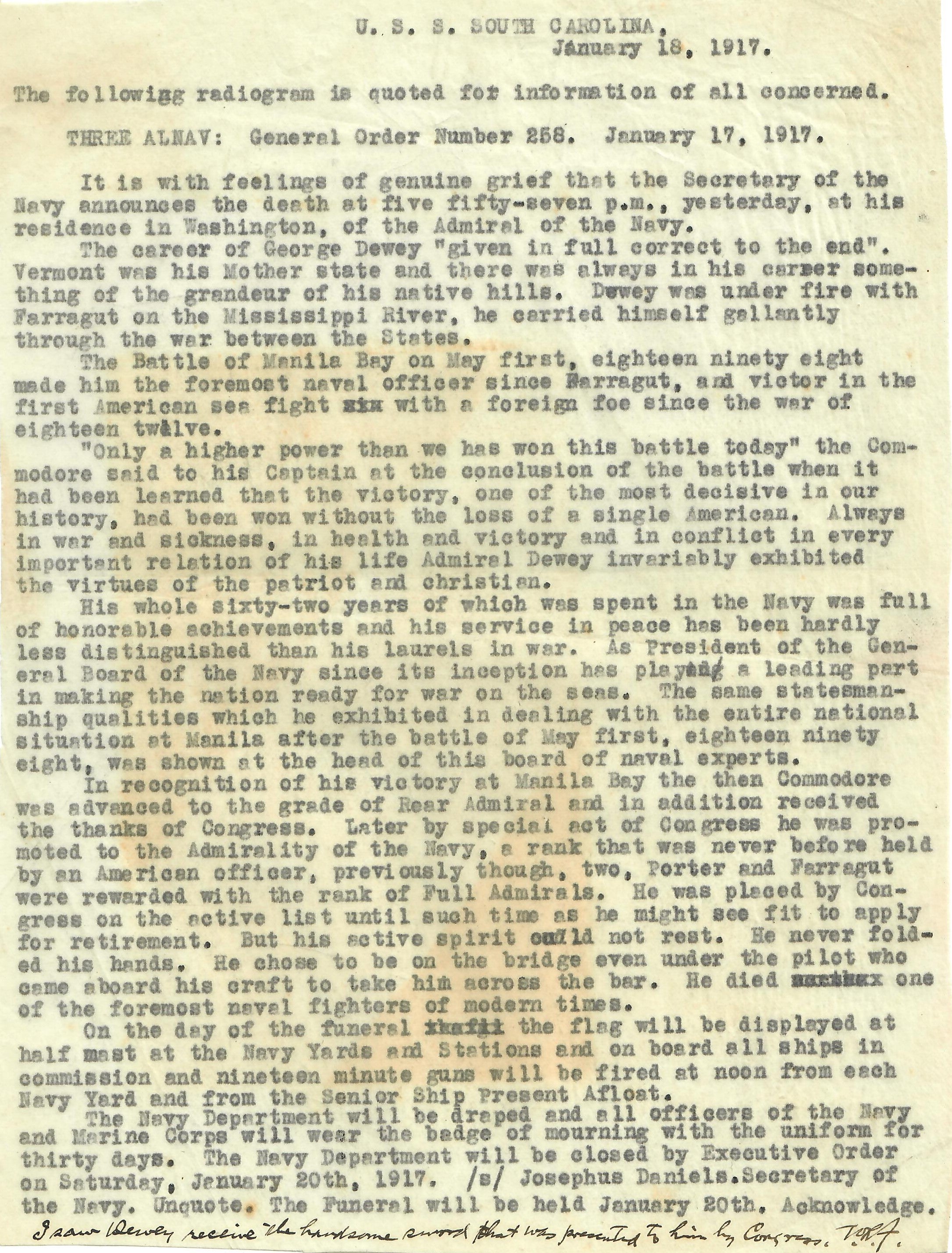 - Typed radiogram announcing death of George Dewey on January 18th, 1917. Furlong wrote on the bottom that he saw Dewey receive the “handsome sword that was presented to him by Congress”.