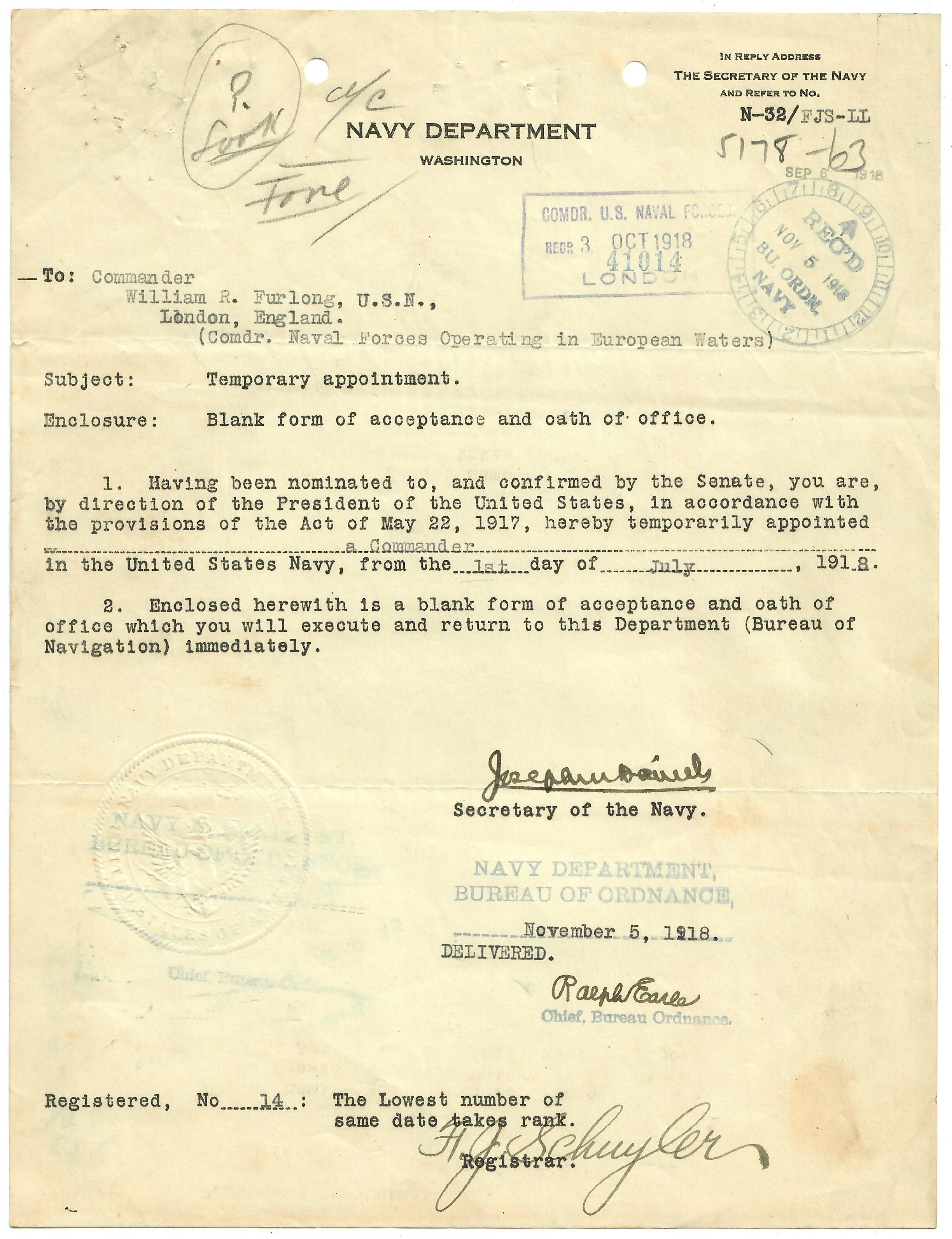 - Temporary Appointment of rank of Commander dated July 1st, 1918. Signed by Secretary of Navy.