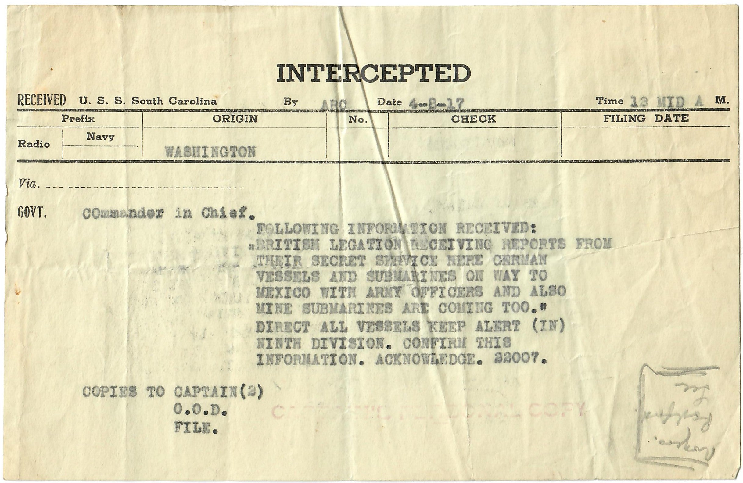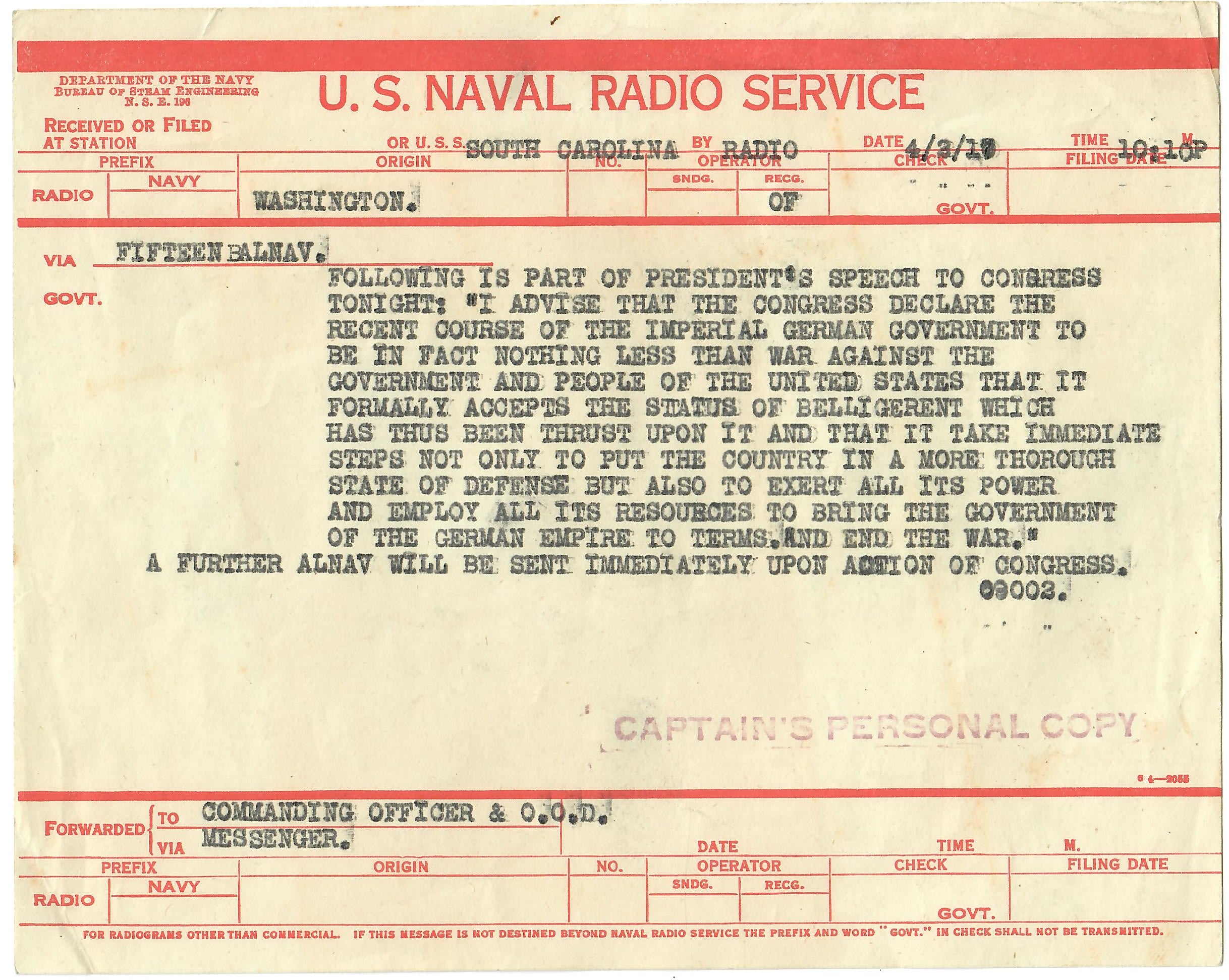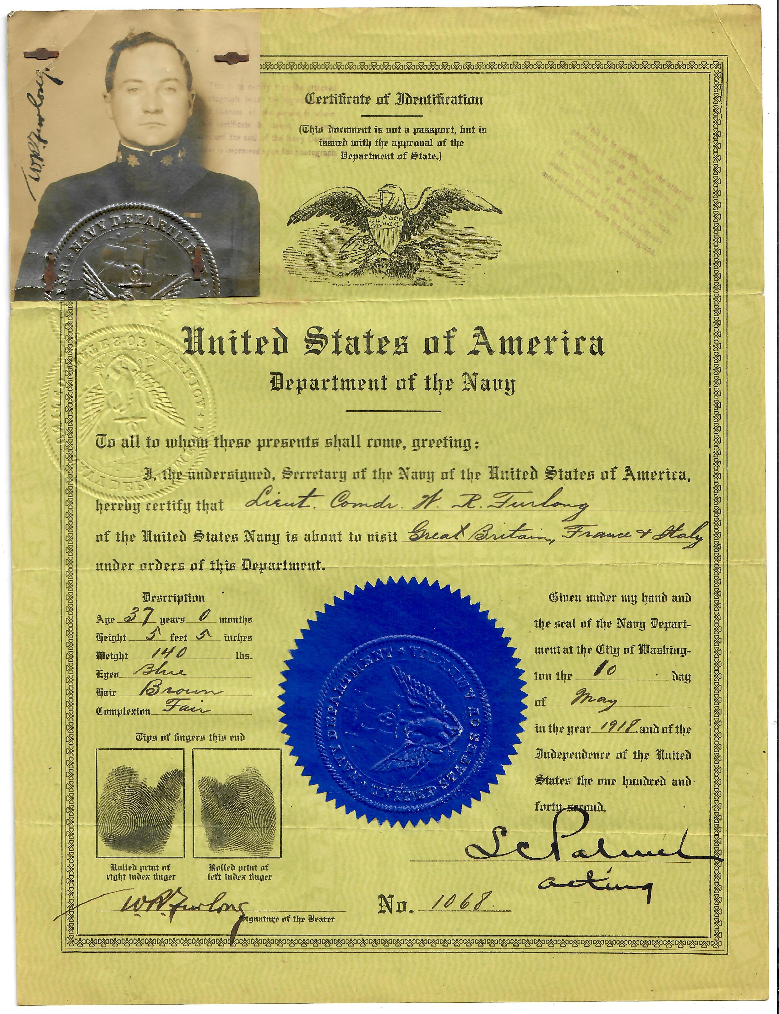 - Manila envelope with original WWI era documents and telegrams including the speech Wilson delivered to Congress on April 3rd, 1917 received by the US Naval Radio Service on the USS South Carolina at 10:10pm on that day. It is stamped “Captain’s Personal Copy”. There are two other intercepted messages received on the USS South Carolina on January 11th, 1917 denoting that enemy raiders may be met, sent in English and French. The other is from April 8th, 1917 announcing that German vessels and submarines are on their way to Mexico. Next is Furlong’s Official May 10th, 1918 dated certificate of identification for travel to Great Britain, France, and Italy during WWI. Has a great photo of him attached with Navy department embossed stamps.