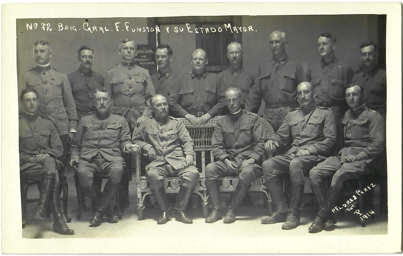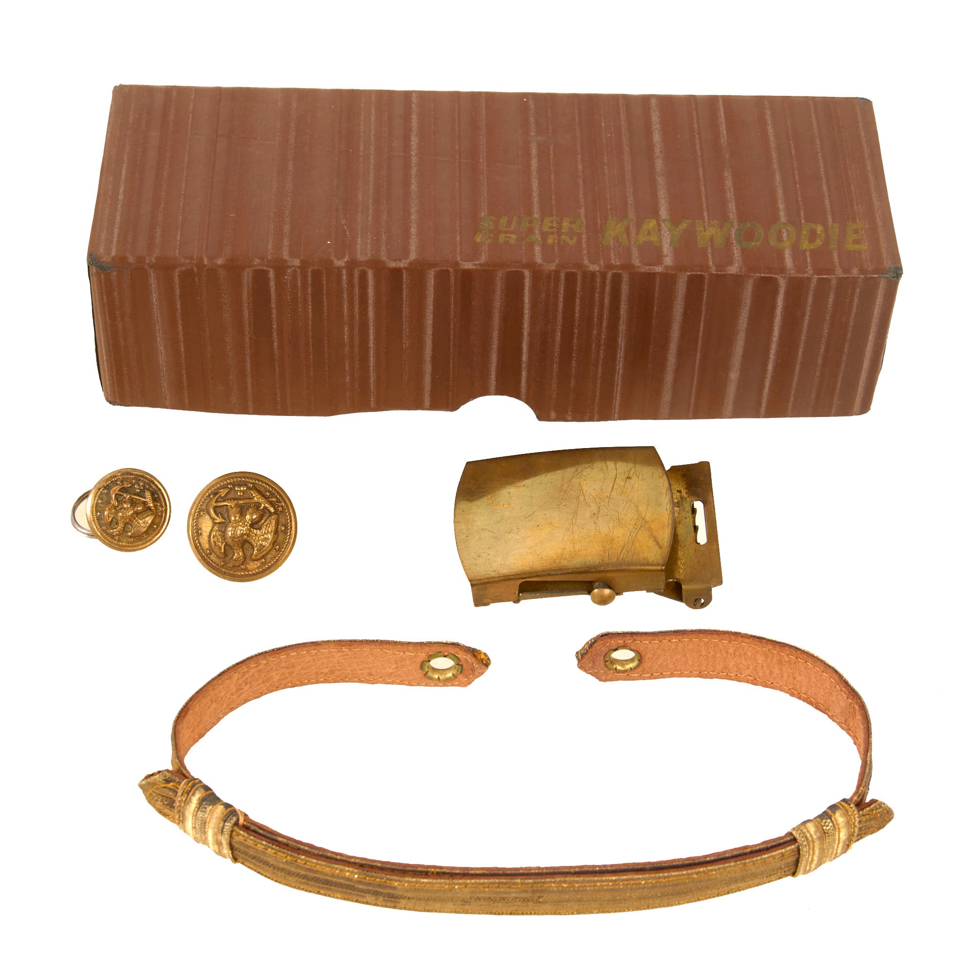 - Small box with the gold tape chinstrap from his visor cap, uniform buttons, pants belt buckle, 1919-era WWI ribbon bar with Mexican border service medal and WWI victory medal.
