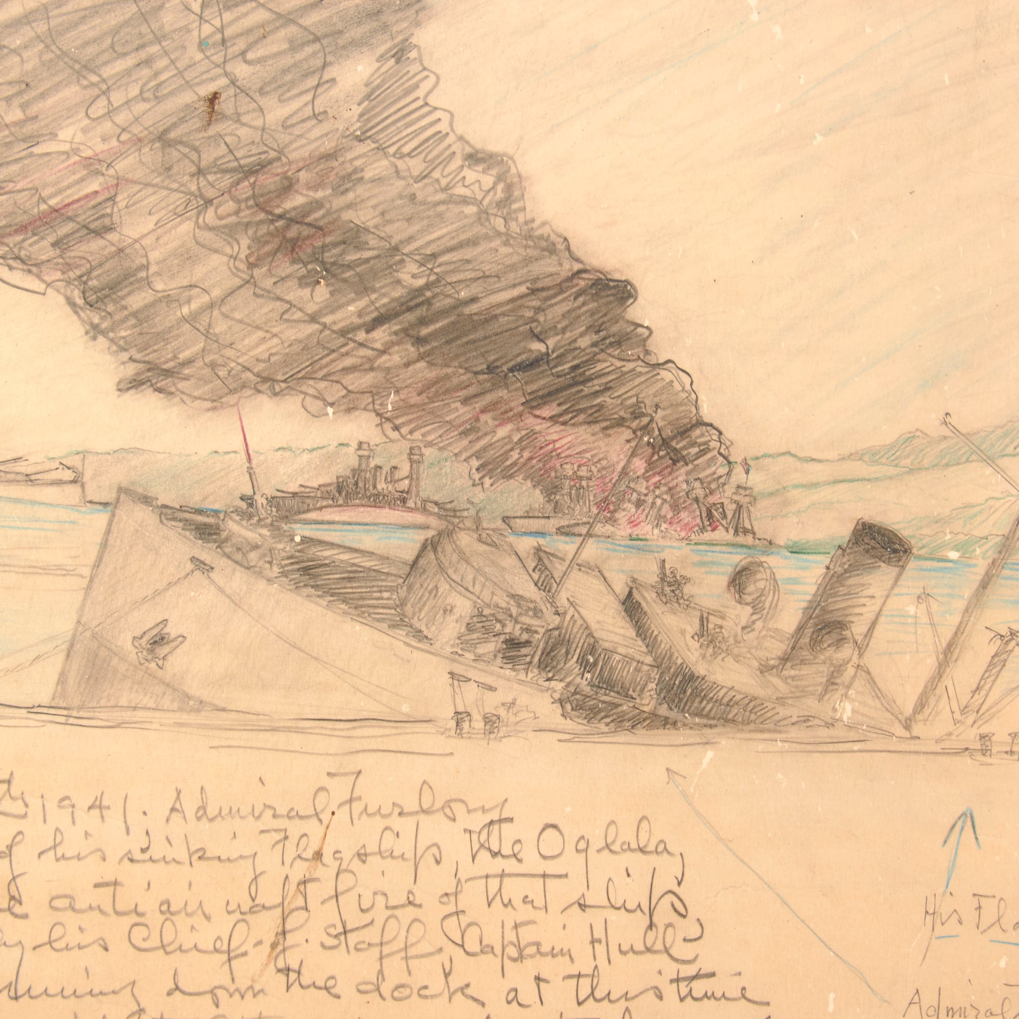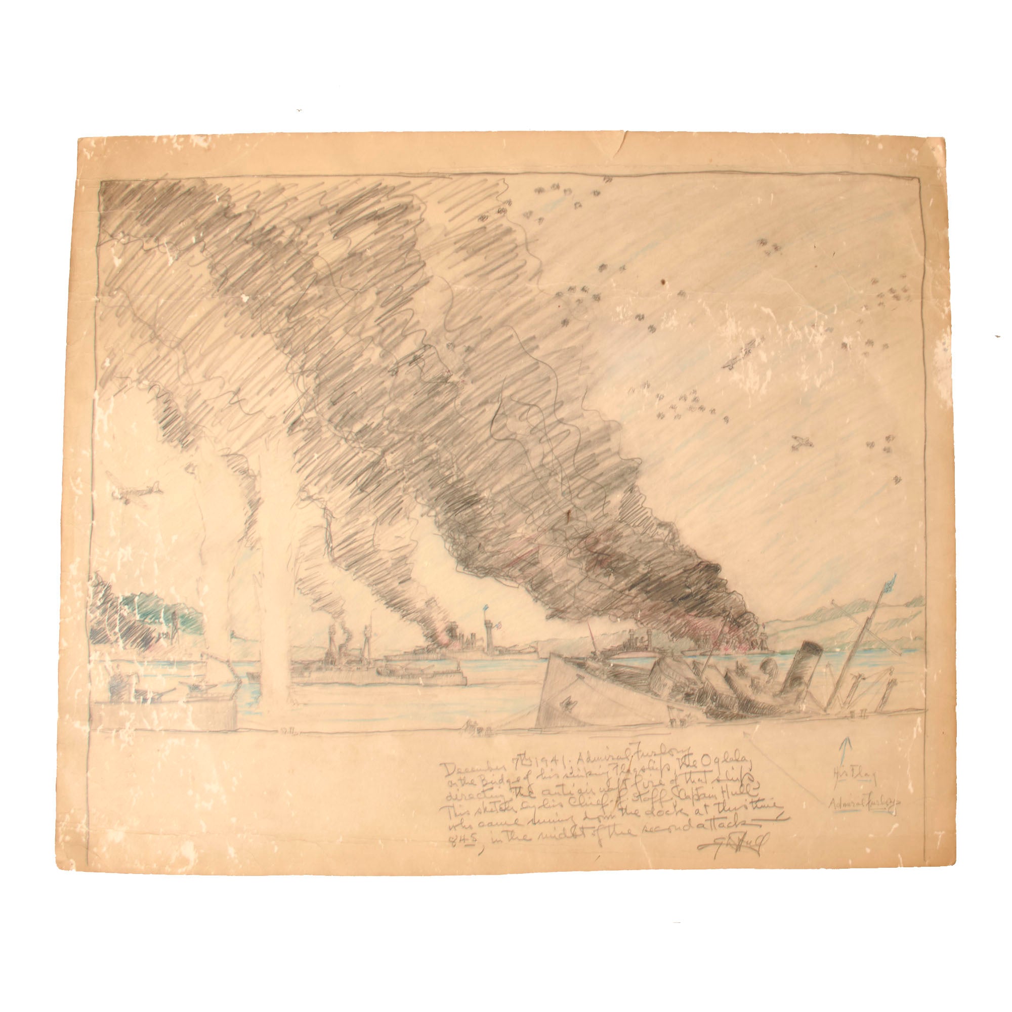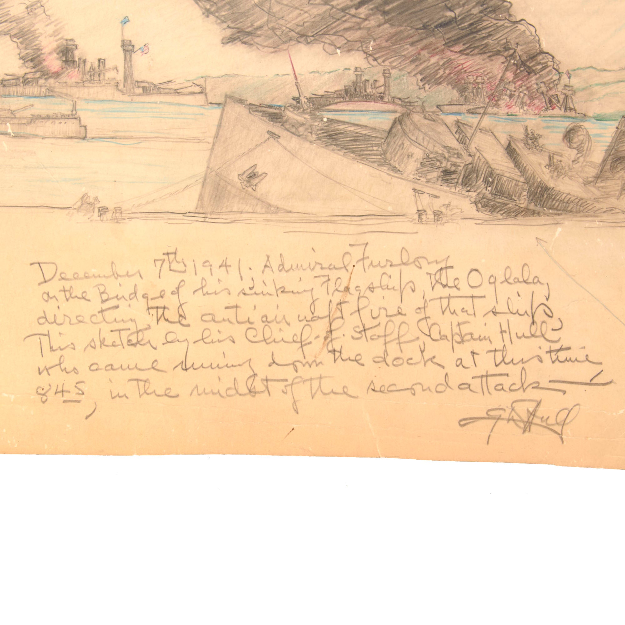 - Roughly 19 ¾ x 24” Sketch of the USS Olgala on December 7th, 1941, depicting Admiral Furlong directing anti-aircraft fire aboard his sinking ship. The caption reads ”December 7th, 1941: Admiral Furlong at the bridge of his sinking Flag Ship, the Oglala, directing the anti-aircraft fire of that ship. This sketch by his chief of staff Captain Hull who came running down the dock at this time 8:45, in the midst of the second attack. G.H. Hull.” A really outstanding piece that needs to be framed.