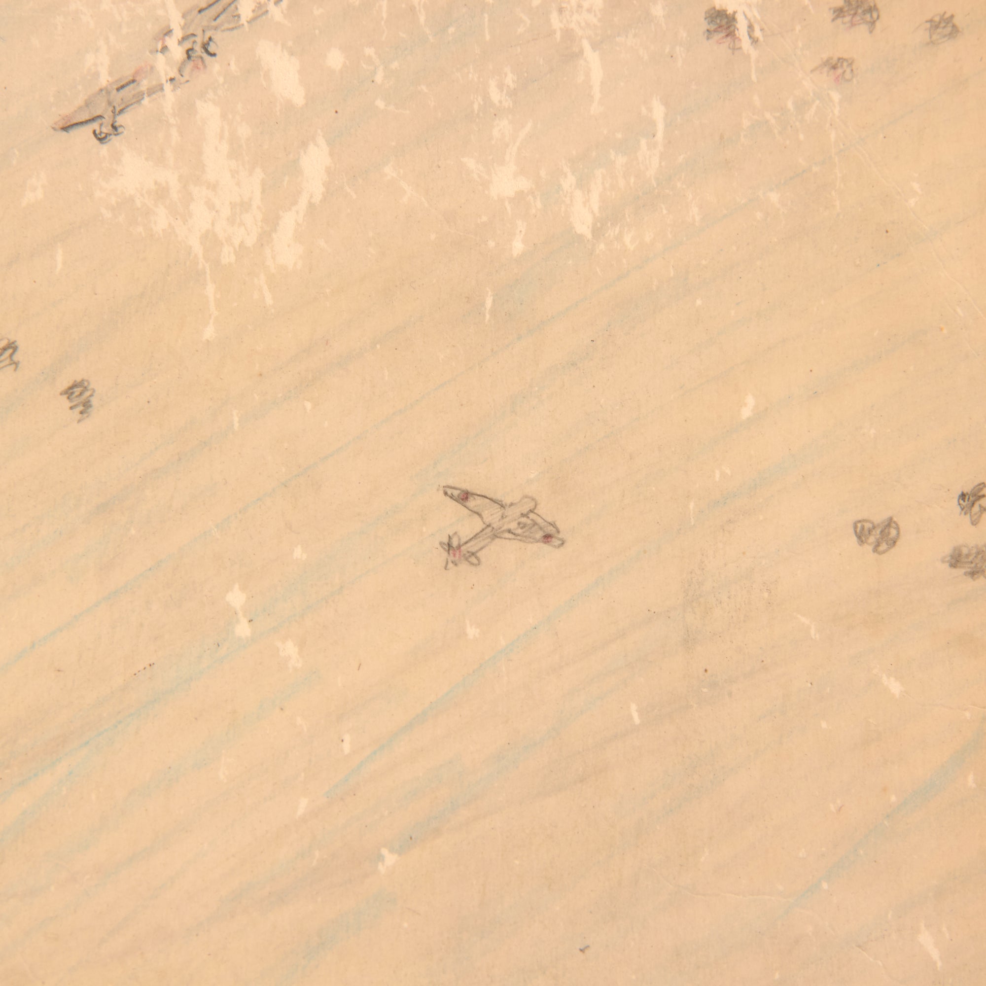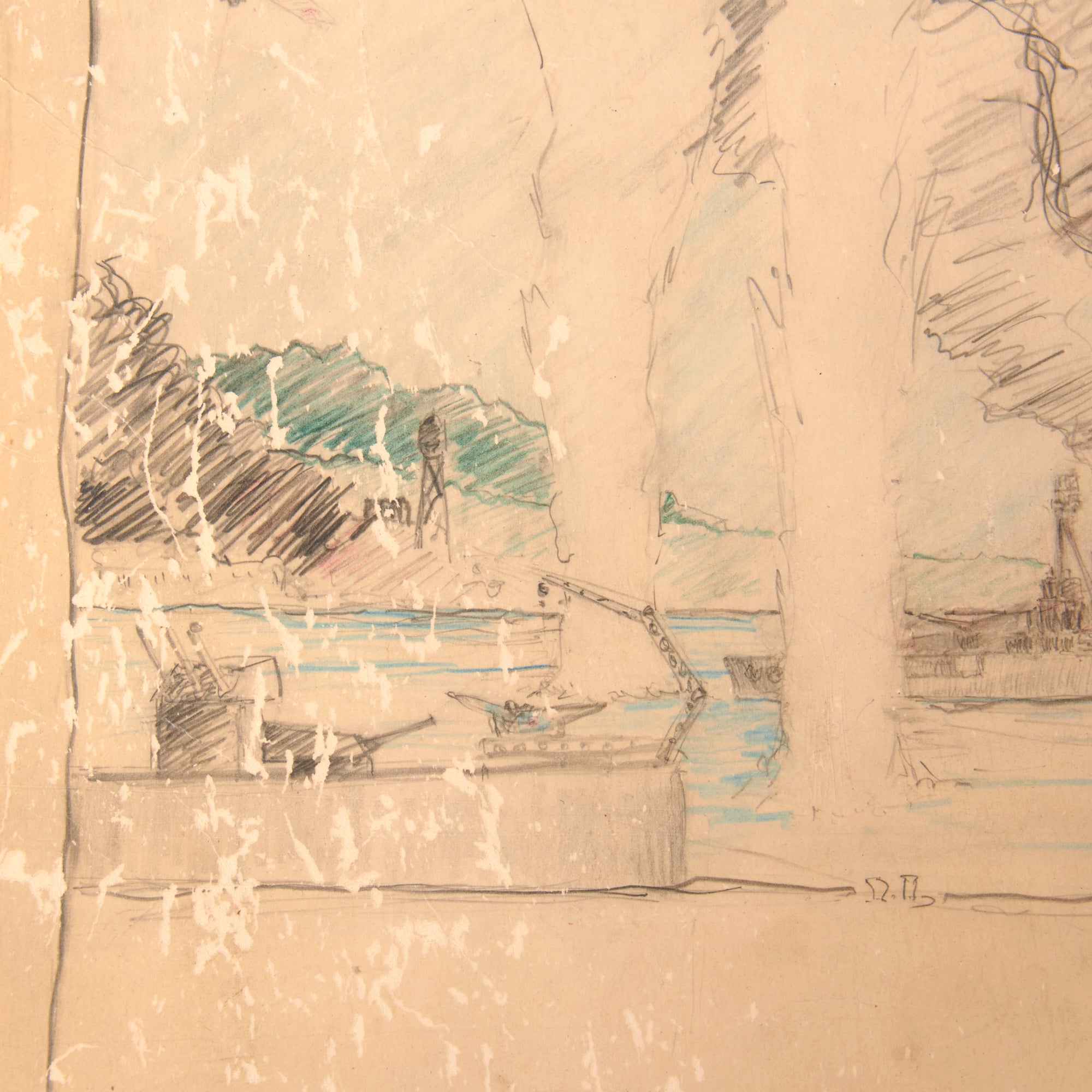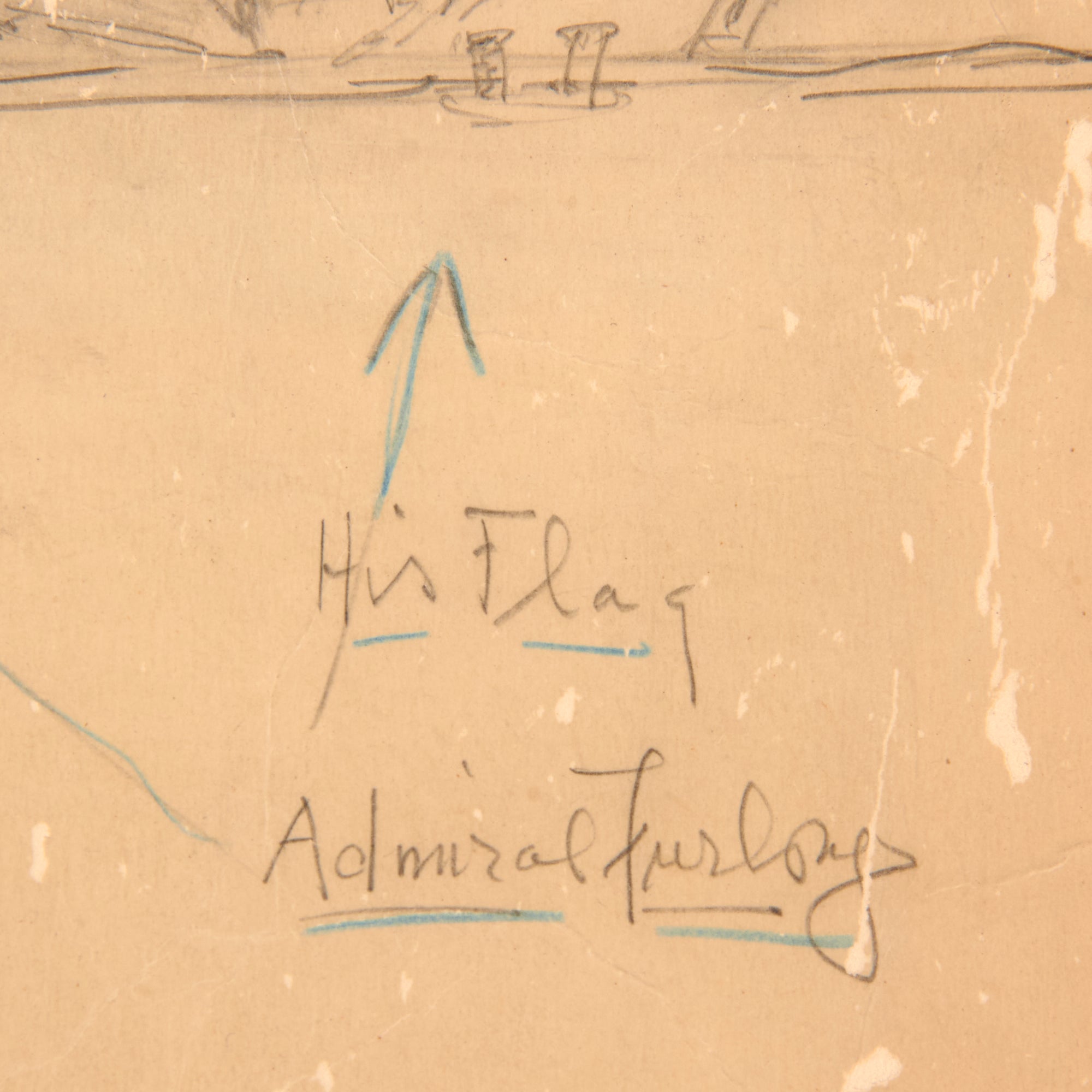 - Roughly 19 ¾ x 24” Sketch of the USS Olgala on December 7th, 1941, depicting Admiral Furlong directing anti-aircraft fire aboard his sinking ship. The caption reads ”December 7th, 1941: Admiral Furlong at the bridge of his sinking Flag Ship, the Oglala, directing the anti-aircraft fire of that ship. This sketch by his chief of staff Captain Hull who came running down the dock at this time 8:45, in the midst of the second attack. G.H. Hull.” A really outstanding piece that needs to be framed.