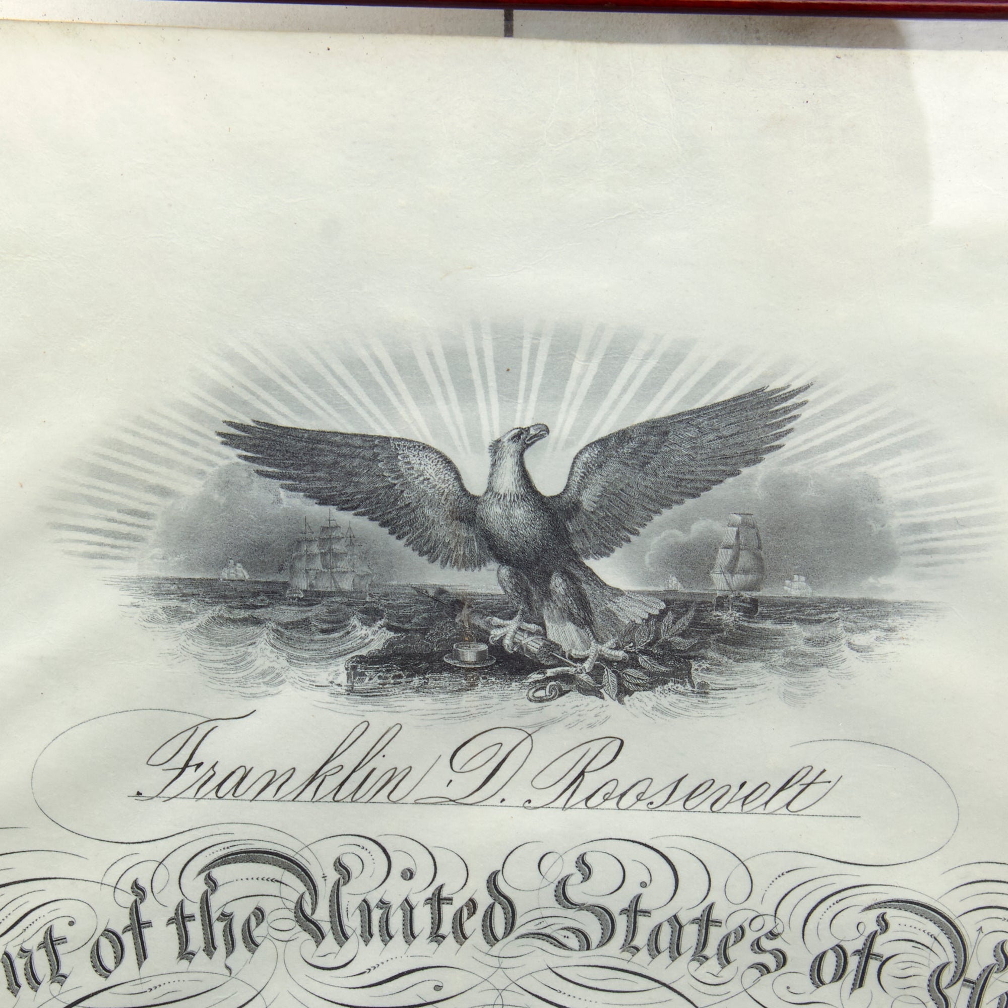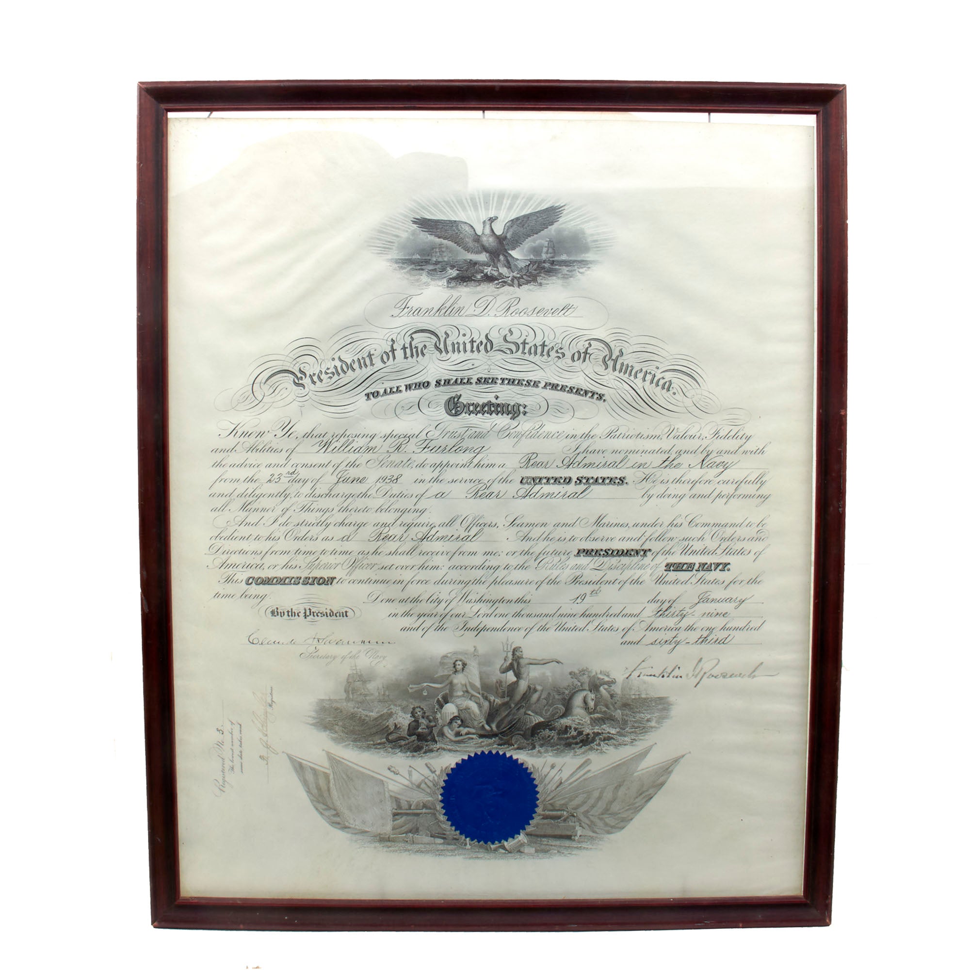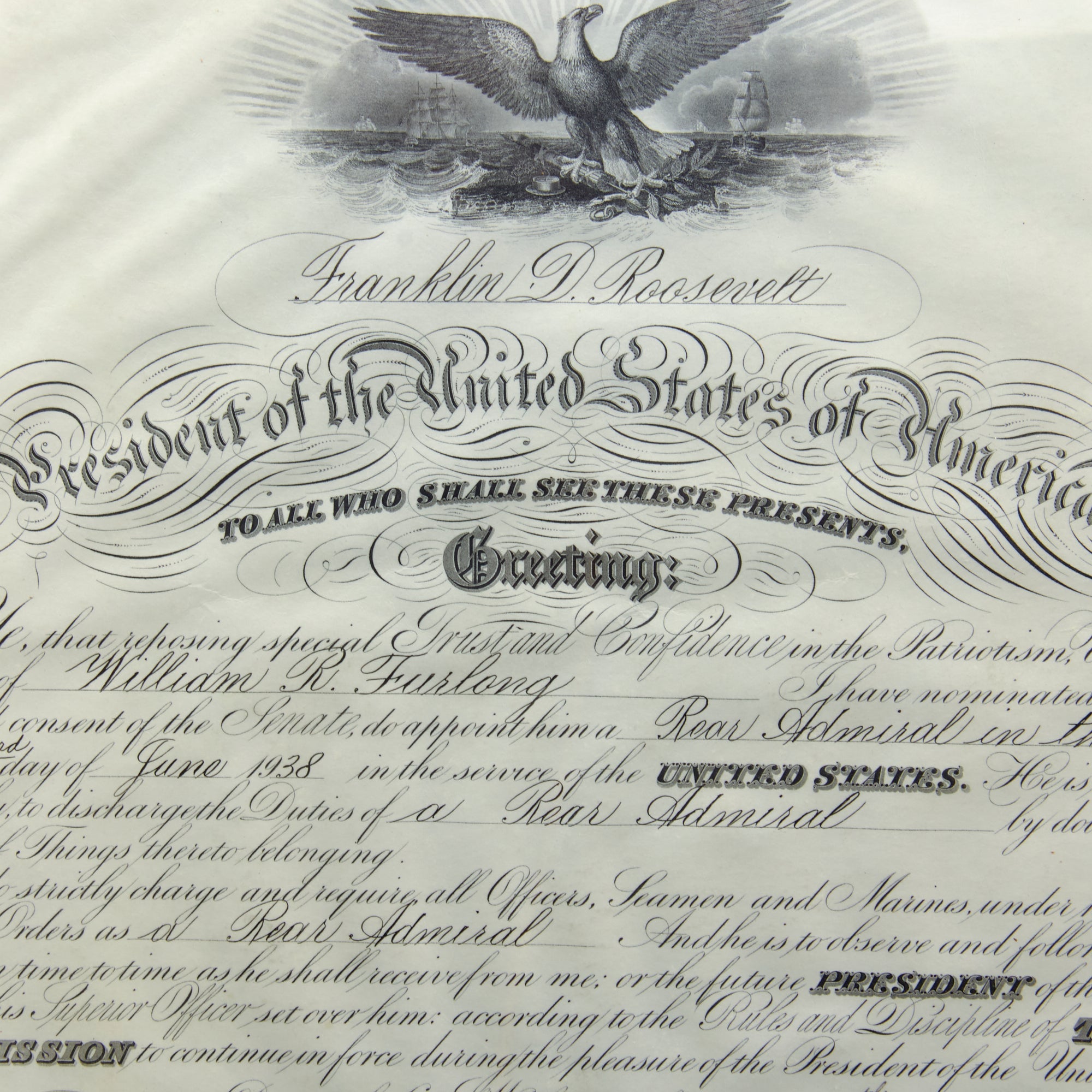 - 17 x 21” Framed Rear Admiral Promotion Certificate with double-sided glass. Signed by FDR in bottom right corner.