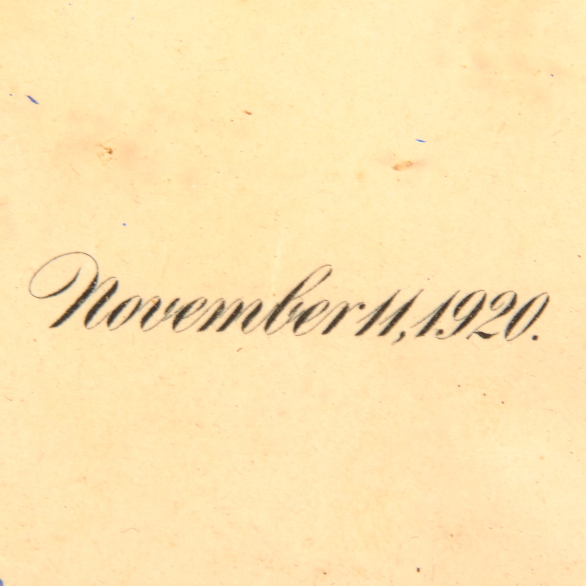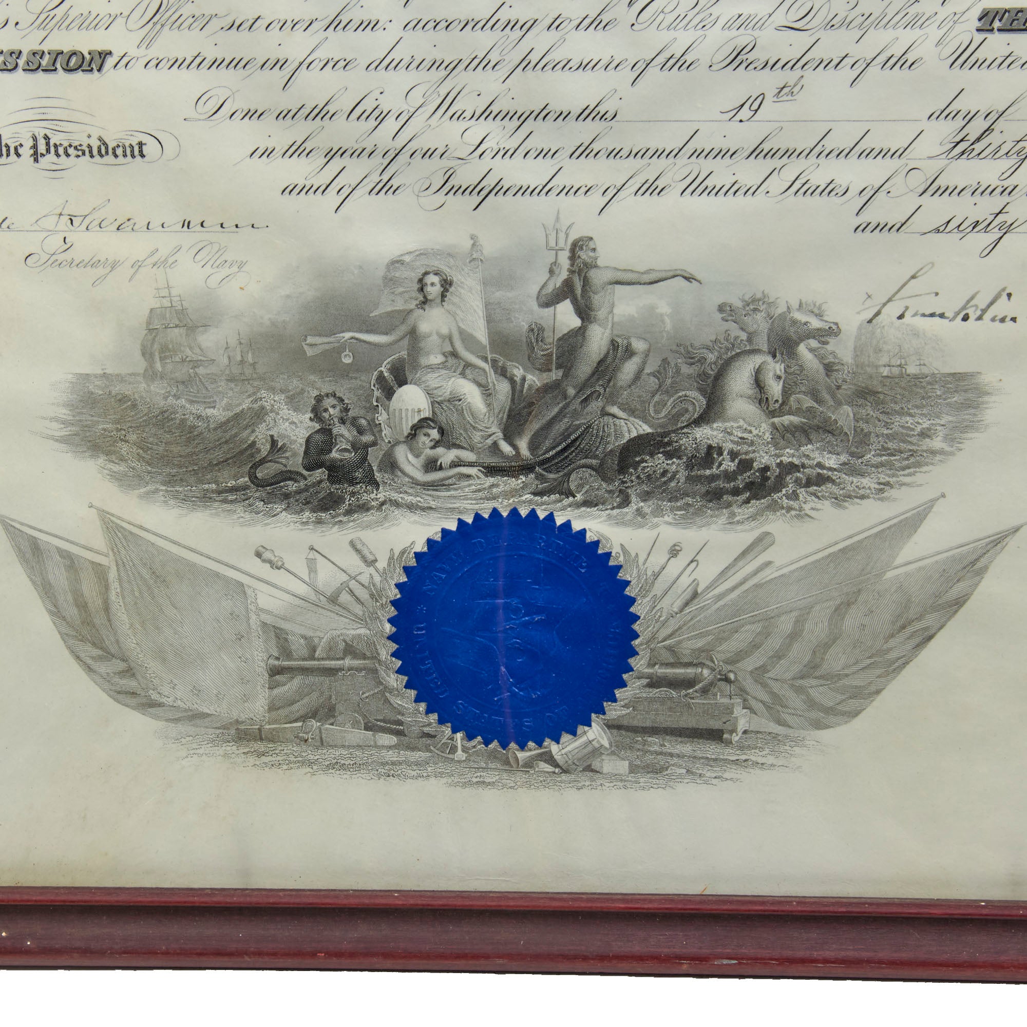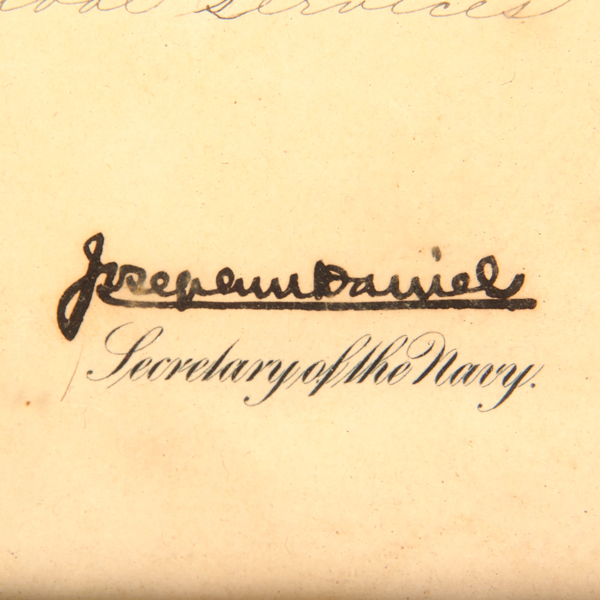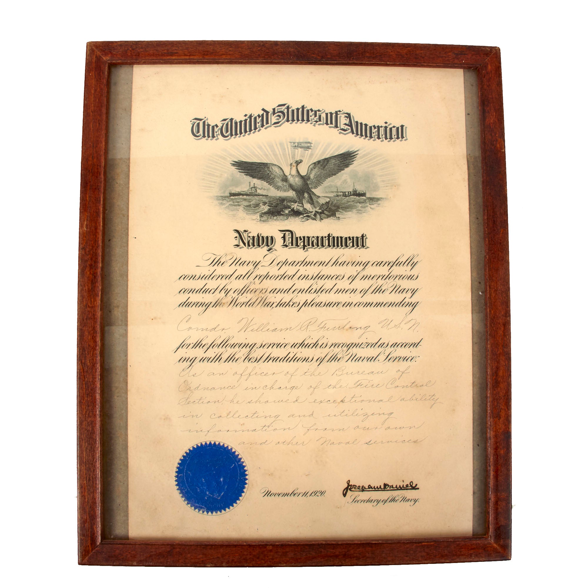 - 12 x 15” framed Navy certificate of commendation for service during World War I, when he was a Commander. The citation reads: “As an officer of the Bureau of Ordnance in charge of the Fire Control Section, he showed exceptional ability in collecting and utilizing information from our own and other Naval Services.” November 11th, 1920. Very rare document!
