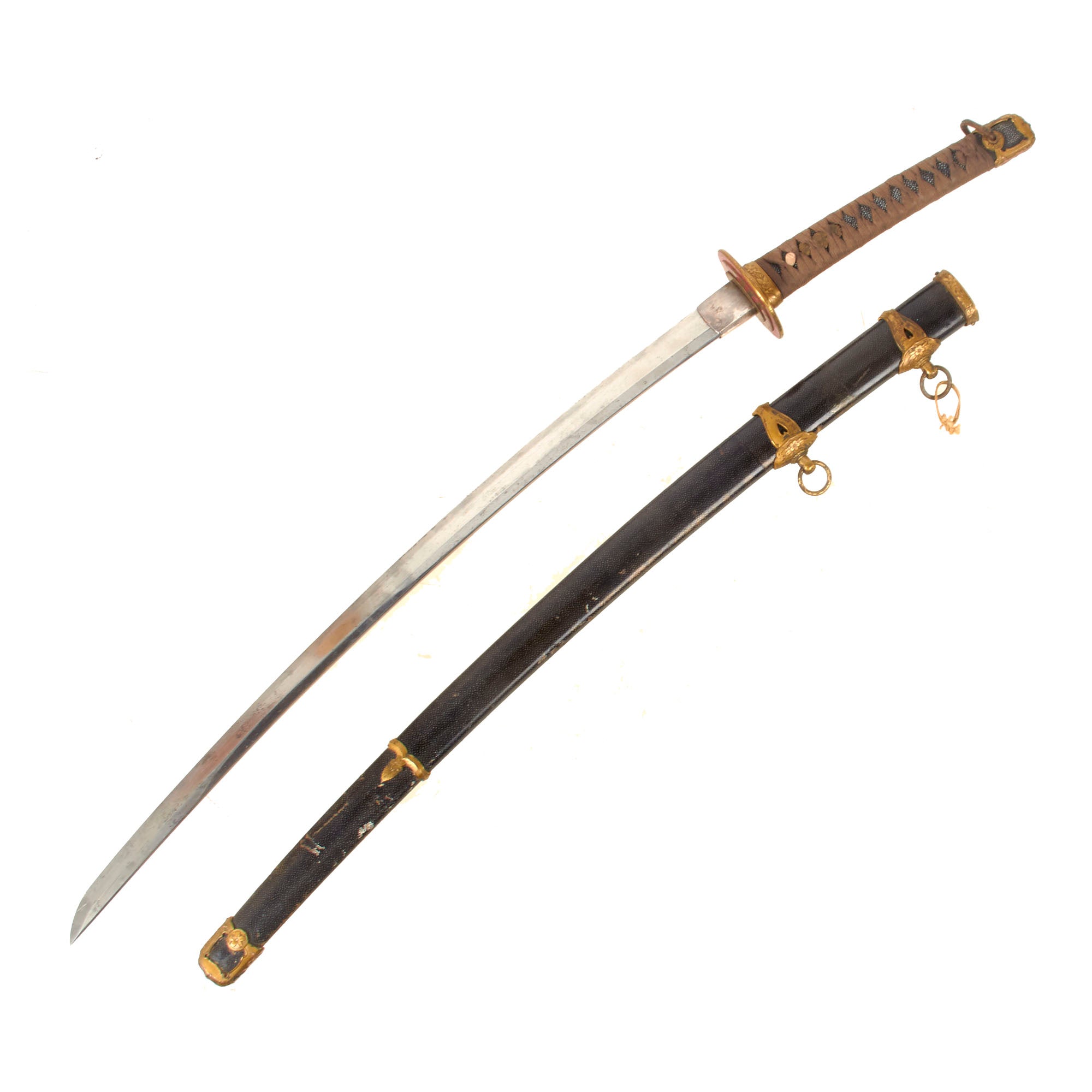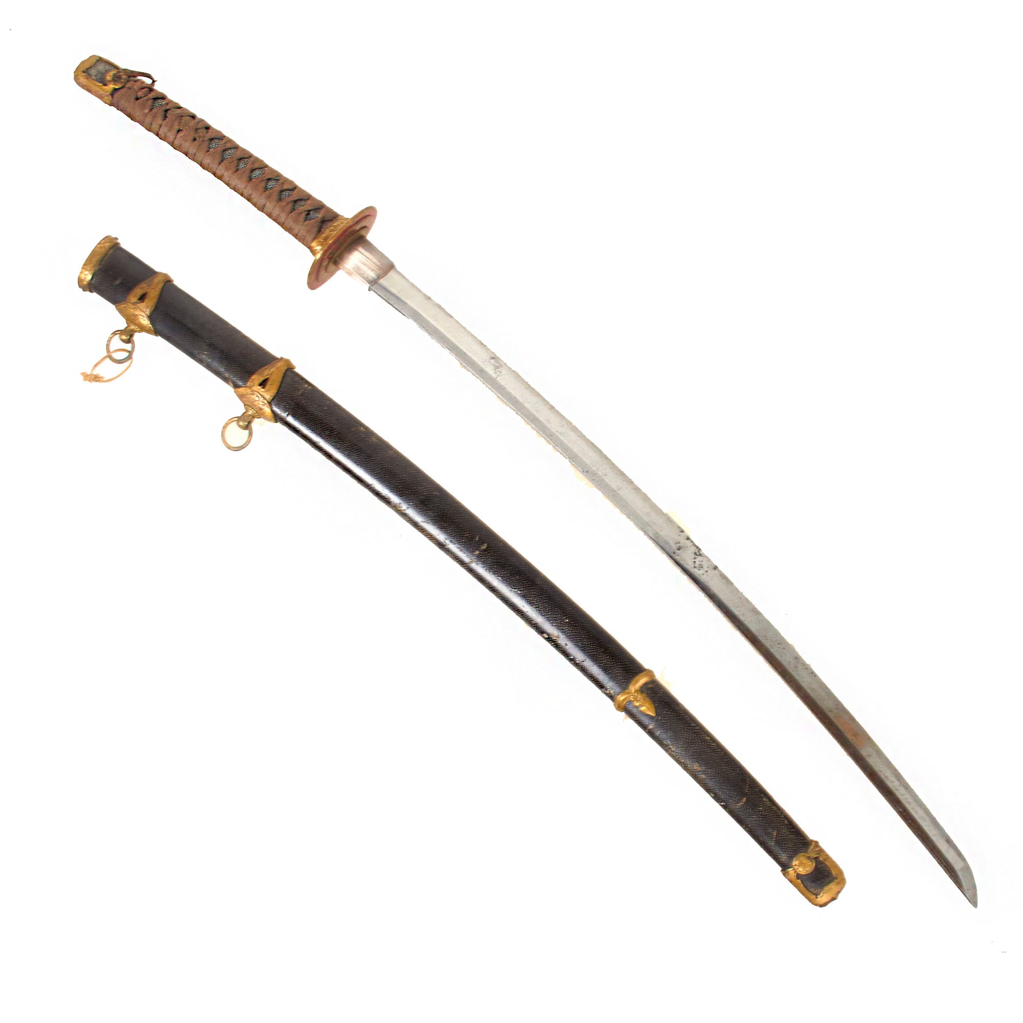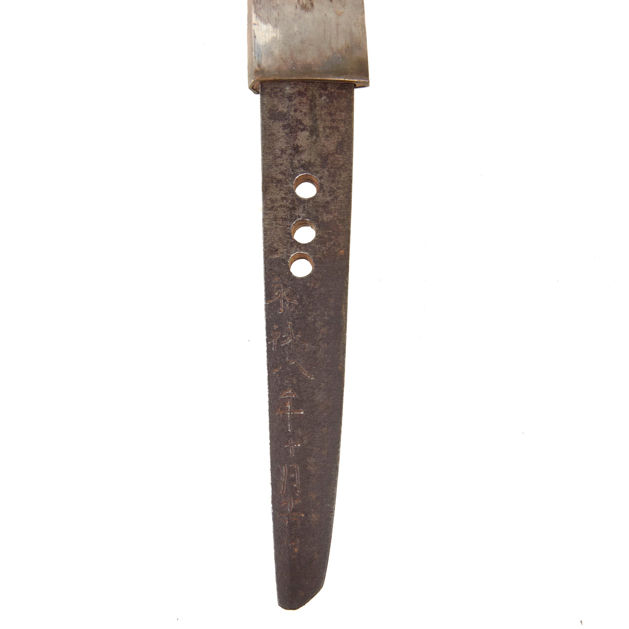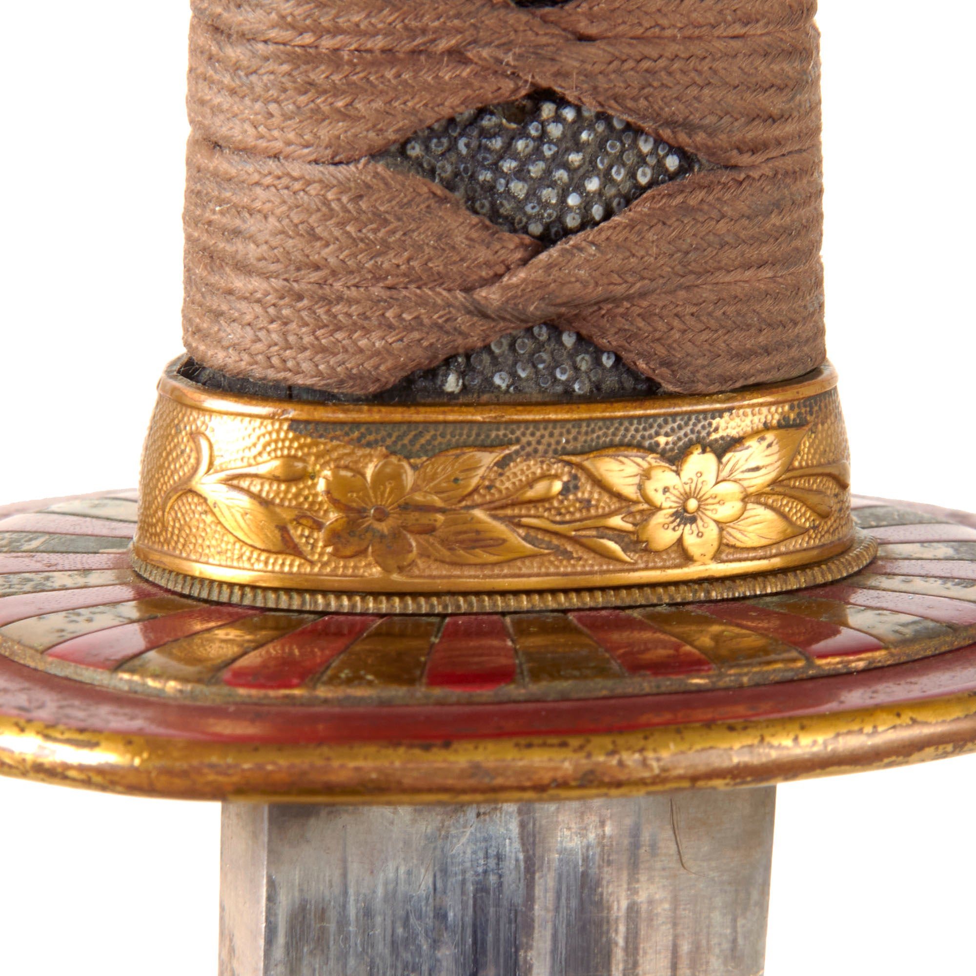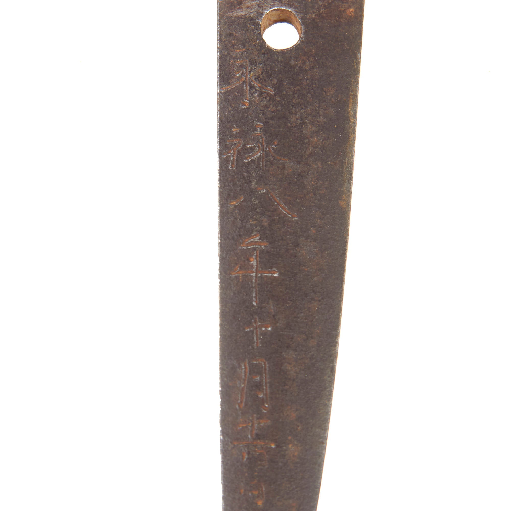 - WWII Japanese Navy Officer P1937 Kai-Gunto Katana with 16th Century Late Muromachi Period Blade by MIHARA MASAMORI and Sharkskin Shagreen Scabbard - dated 1567. The sword definitely shows signs of having been in a war, and the blade polish is a bit degraded, with the fittings also showing use and age. It is a HIGH GRADE example, signed on the tang with 三 原 正 守 作 - MIHARA MASAMORI SAKU (Made by Mihara Masamori) on one side, indicating the maker was a member of the very old and prestigious MIHARA school of swordsmithing in Japan. The other side is signed 永 禄 八 年 十 月 吉 日 - EIROKU HACHI NEN JU GATSU KICHI JITSU - "An auspicious day the 10th month of 1567". This blade is almost certainly a family blade, indicating the owner was definitely of some importance and lineage. We unfortunately do not know the history of the sword before it was gifted, but assume it came from a high-ranking officer on a captured ship. Definitely some incredible history to this sword!