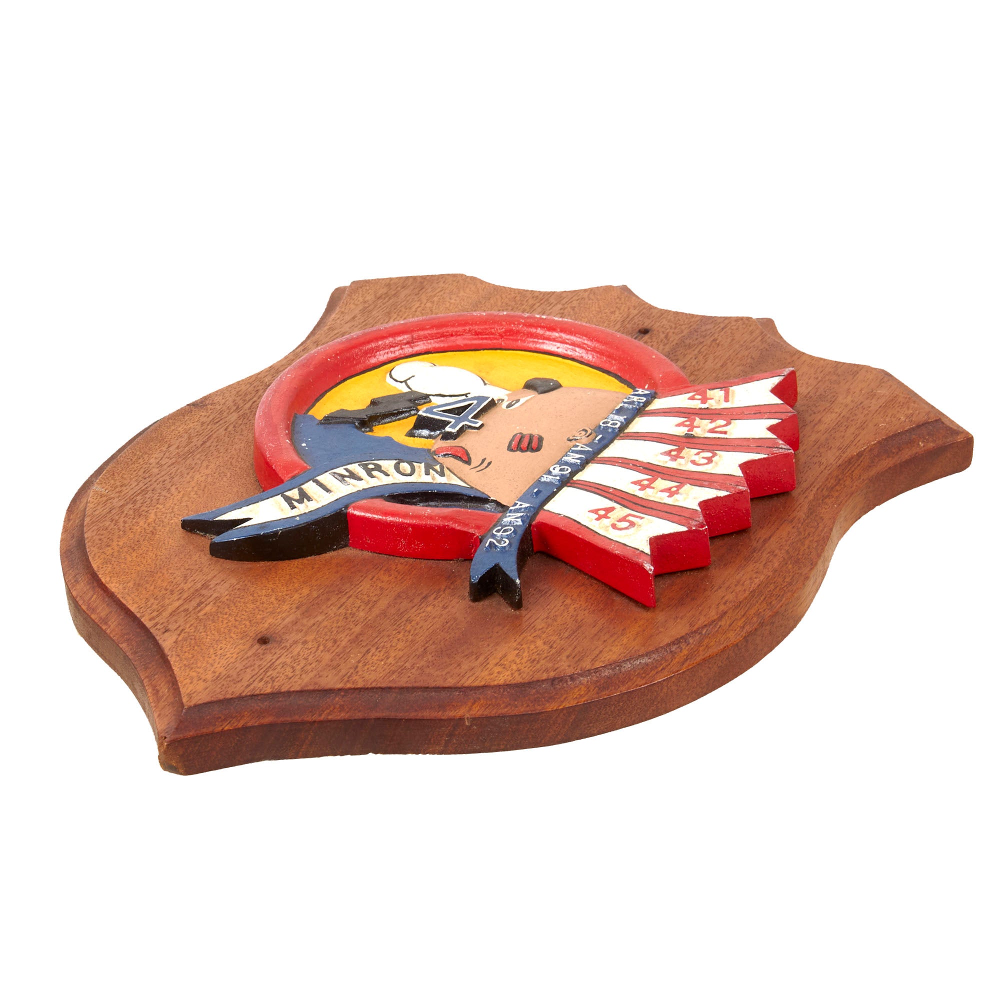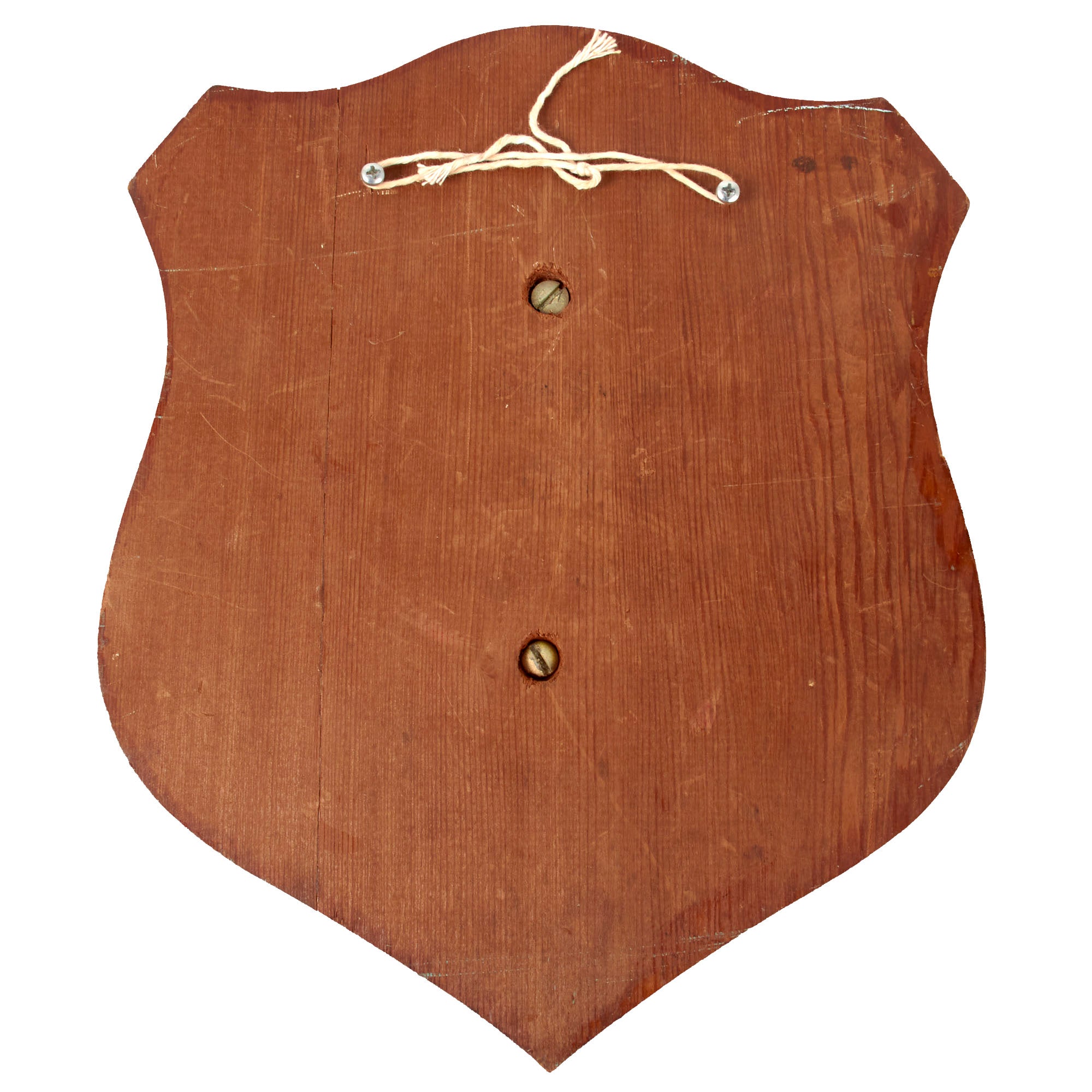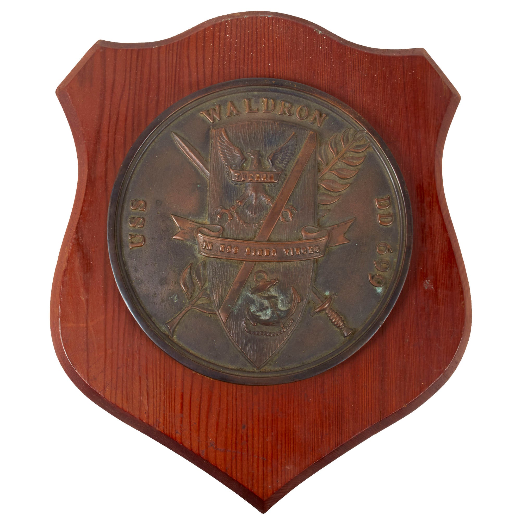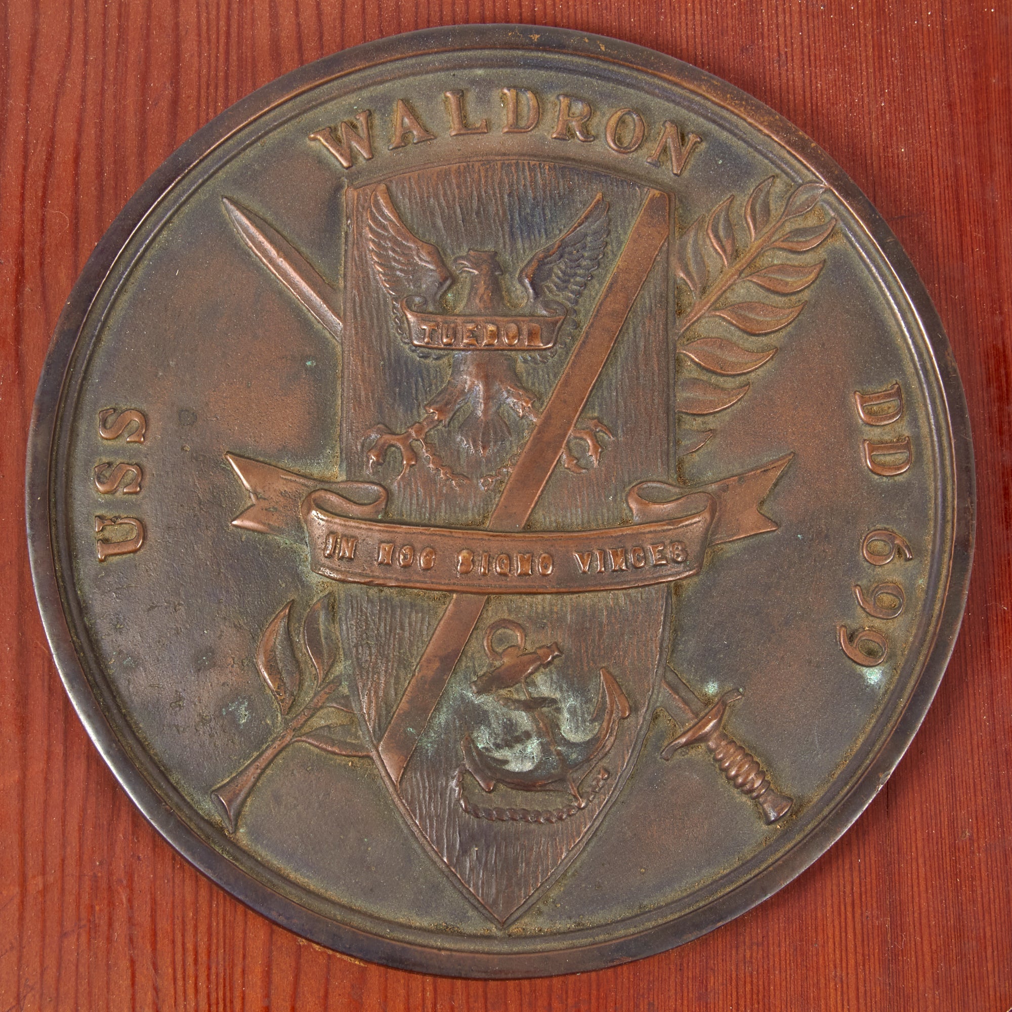 - 11 x 13 ¼” wooden wall plaque with USS Waldron DD699 plaque in center. Has string on back to hang.