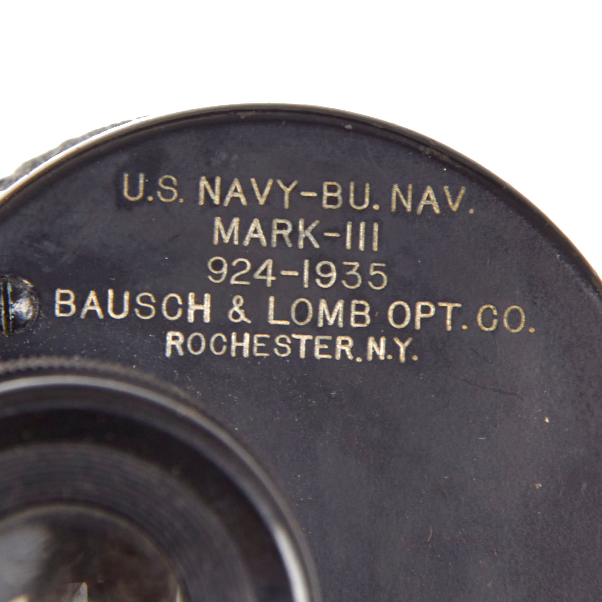 - U.S. Navy 6 x 30 Bu. Nav. Mark-III Binoculars by Bausch & Lomb in original leather case, heavily worn with leather straps broken and dry-rotted. Named Furlong on bottom.