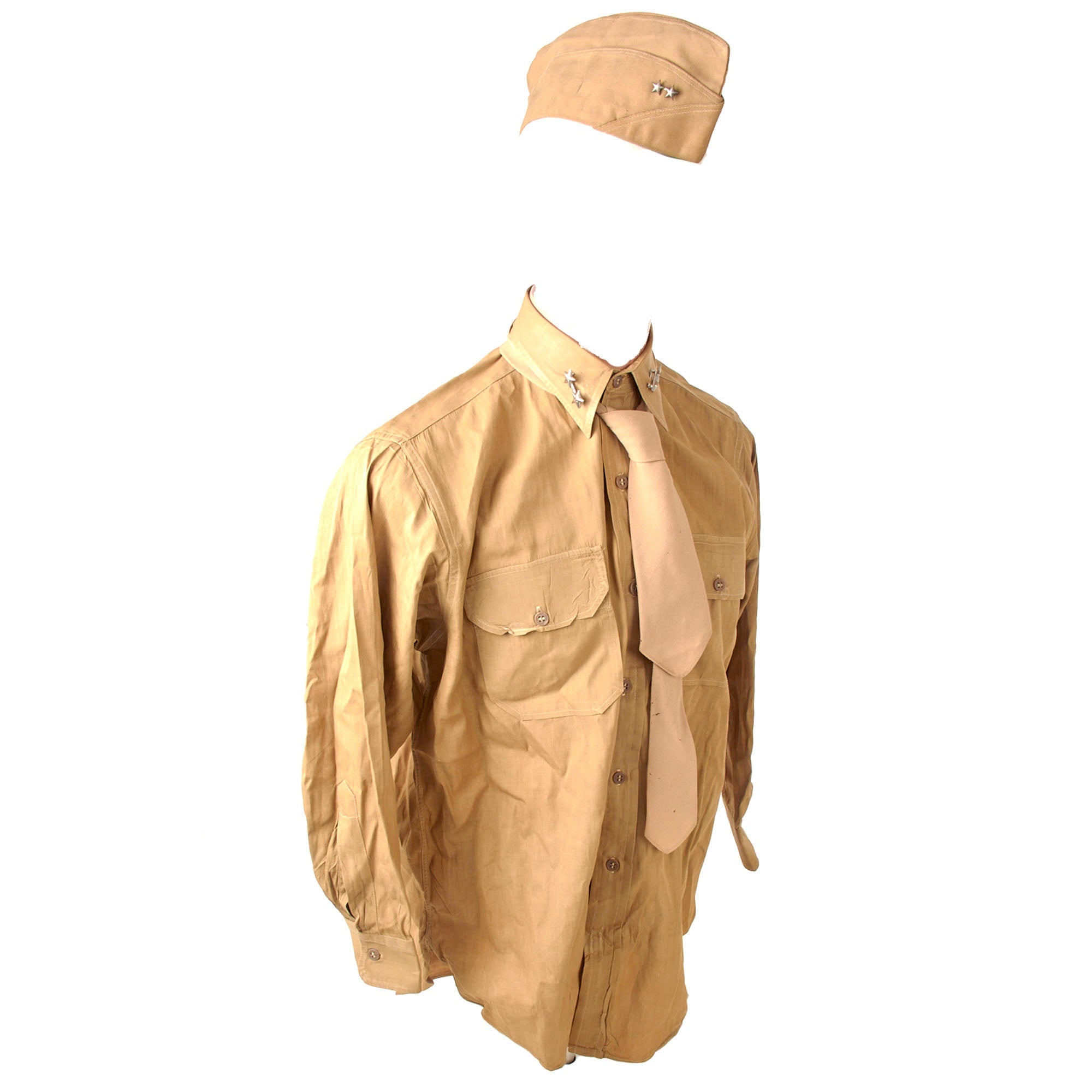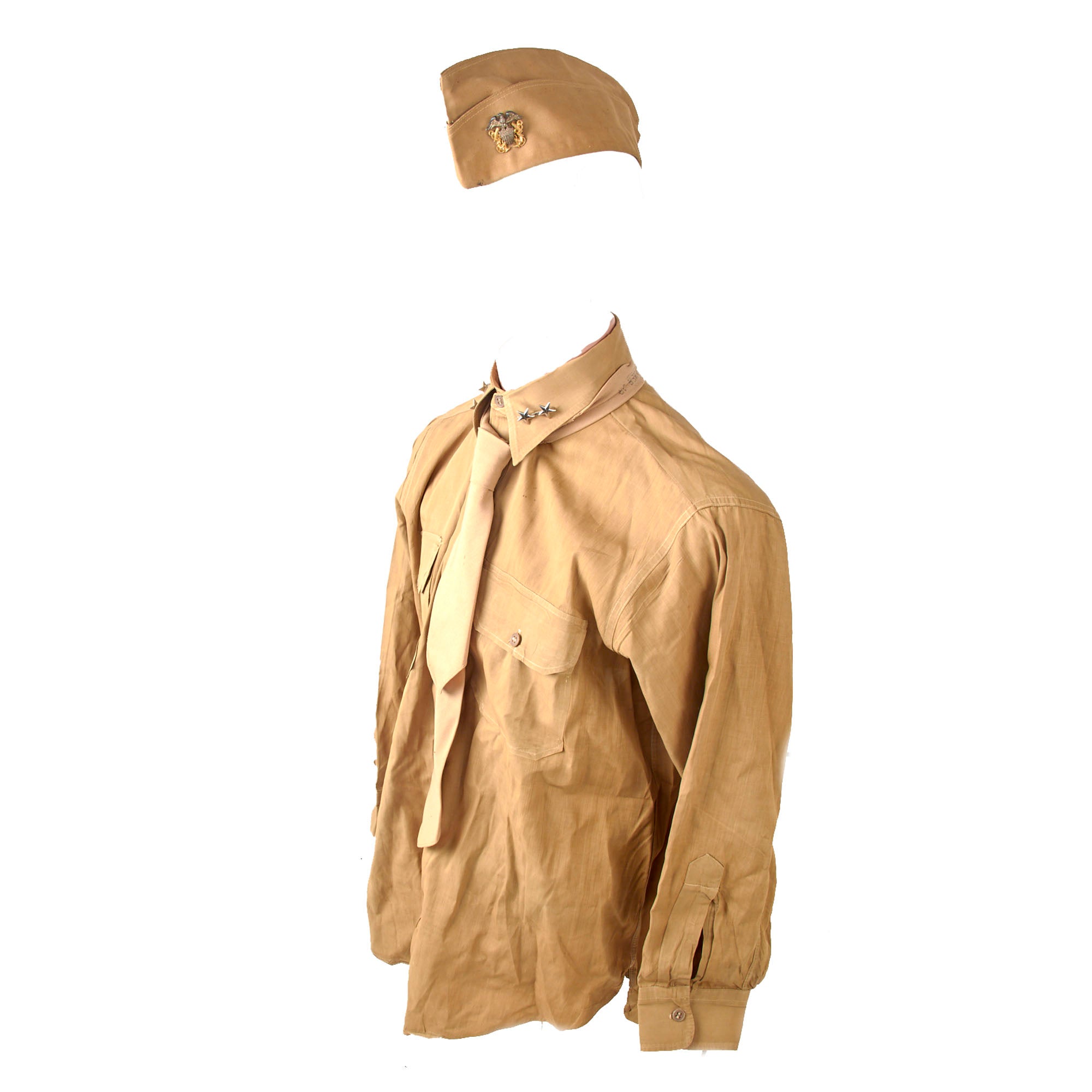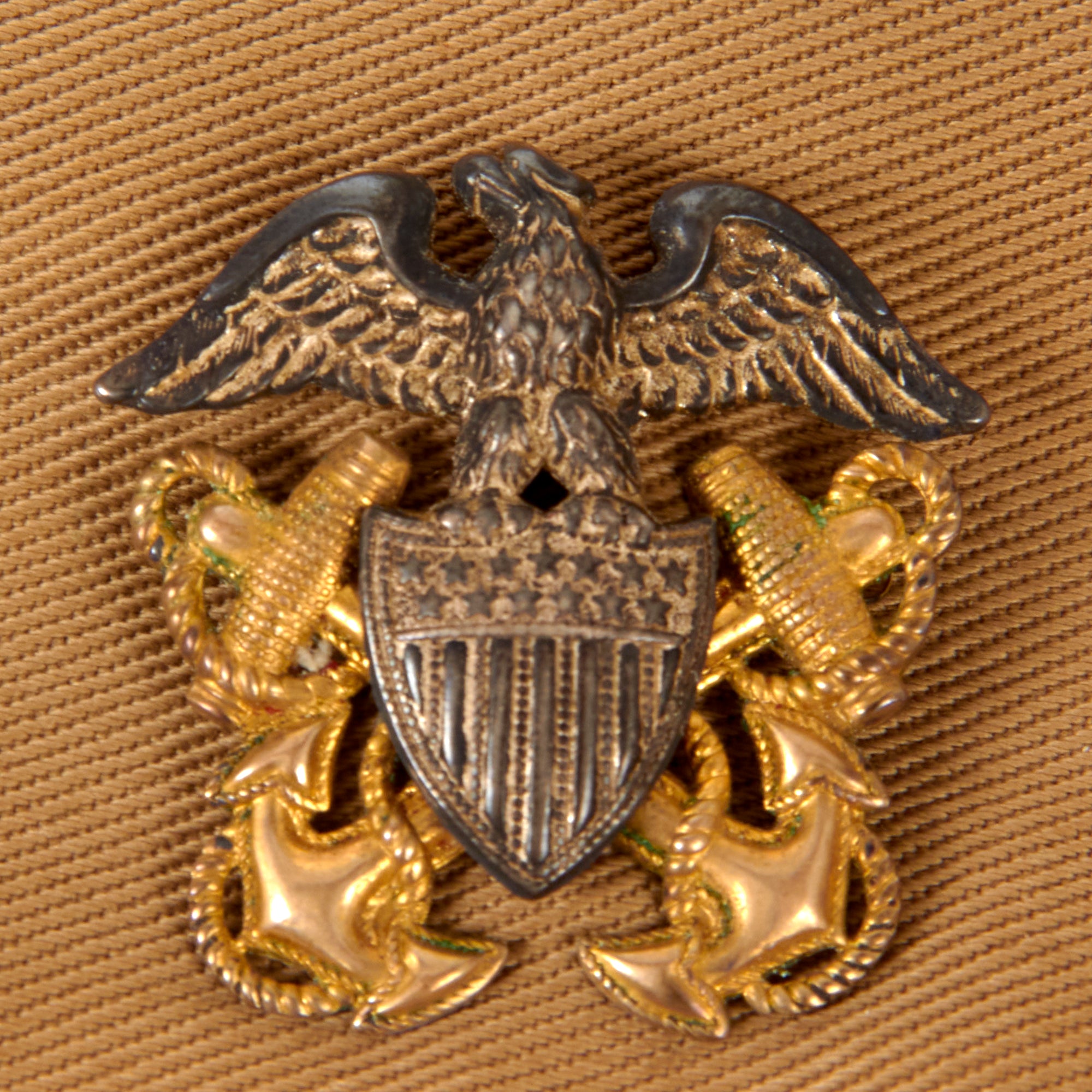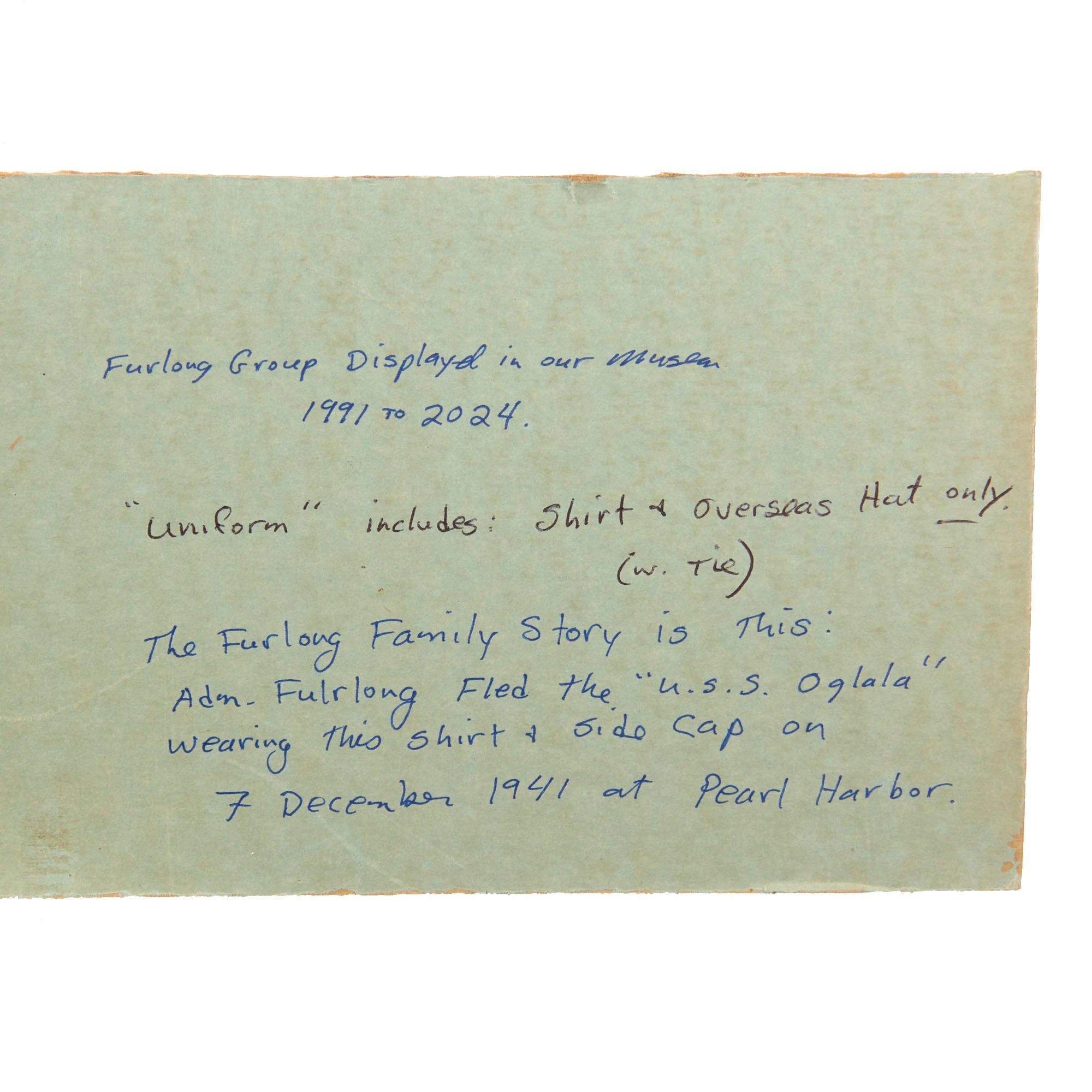 - The Tan Shirt and Garrison Cap with museum tag stating that Furlong’s family stated that these were worn by Admiral Furlong on December 7th, 1941. The shirt has a tag for Van Heussen and has Rear Admiral insignia on the collar, and the cap has an officer’s badge and Rear Admiral insignia. Also includes a Navy officer’s visor cap band with badge, and two neckties.
