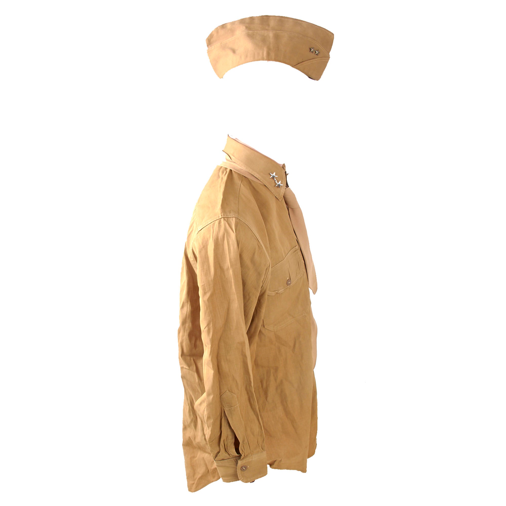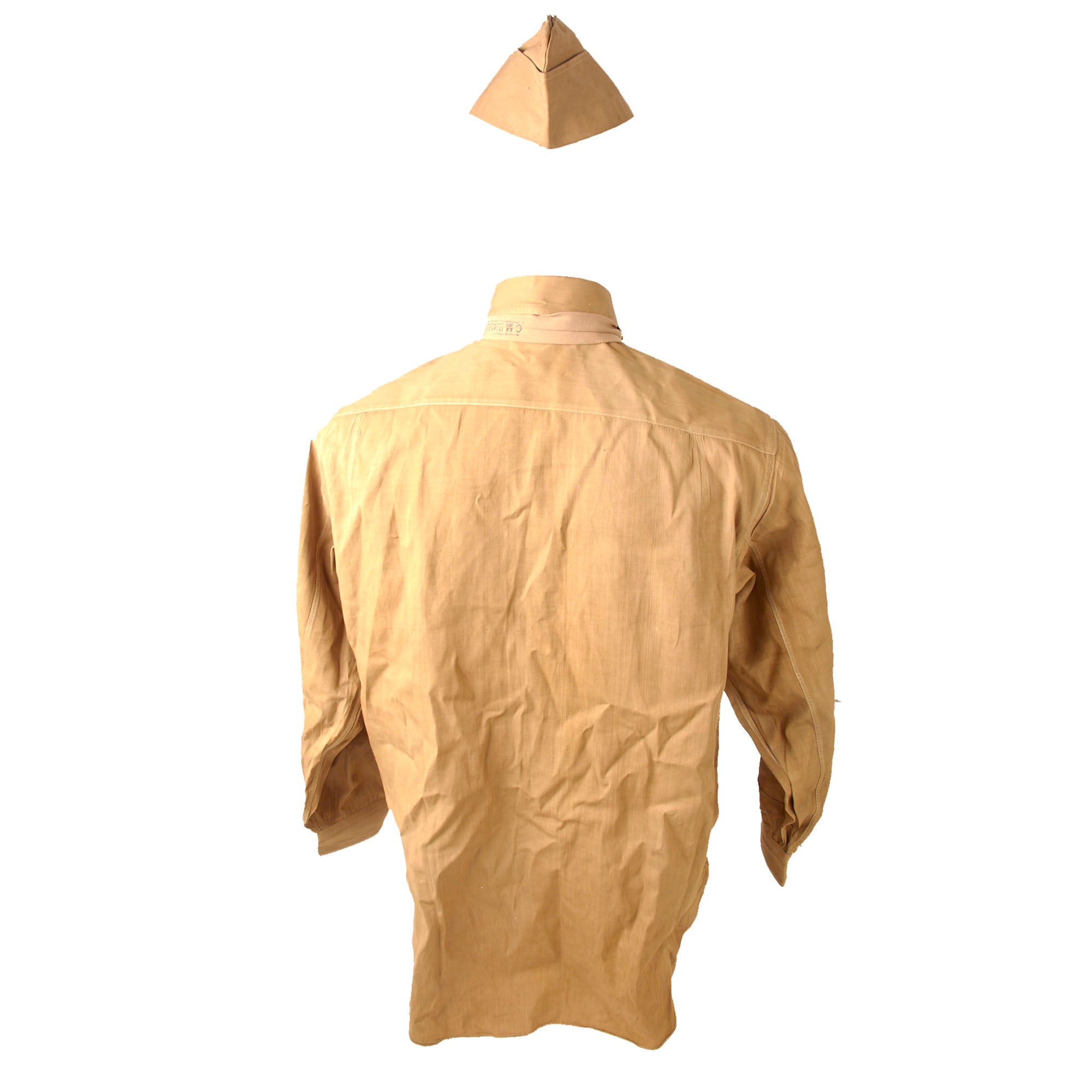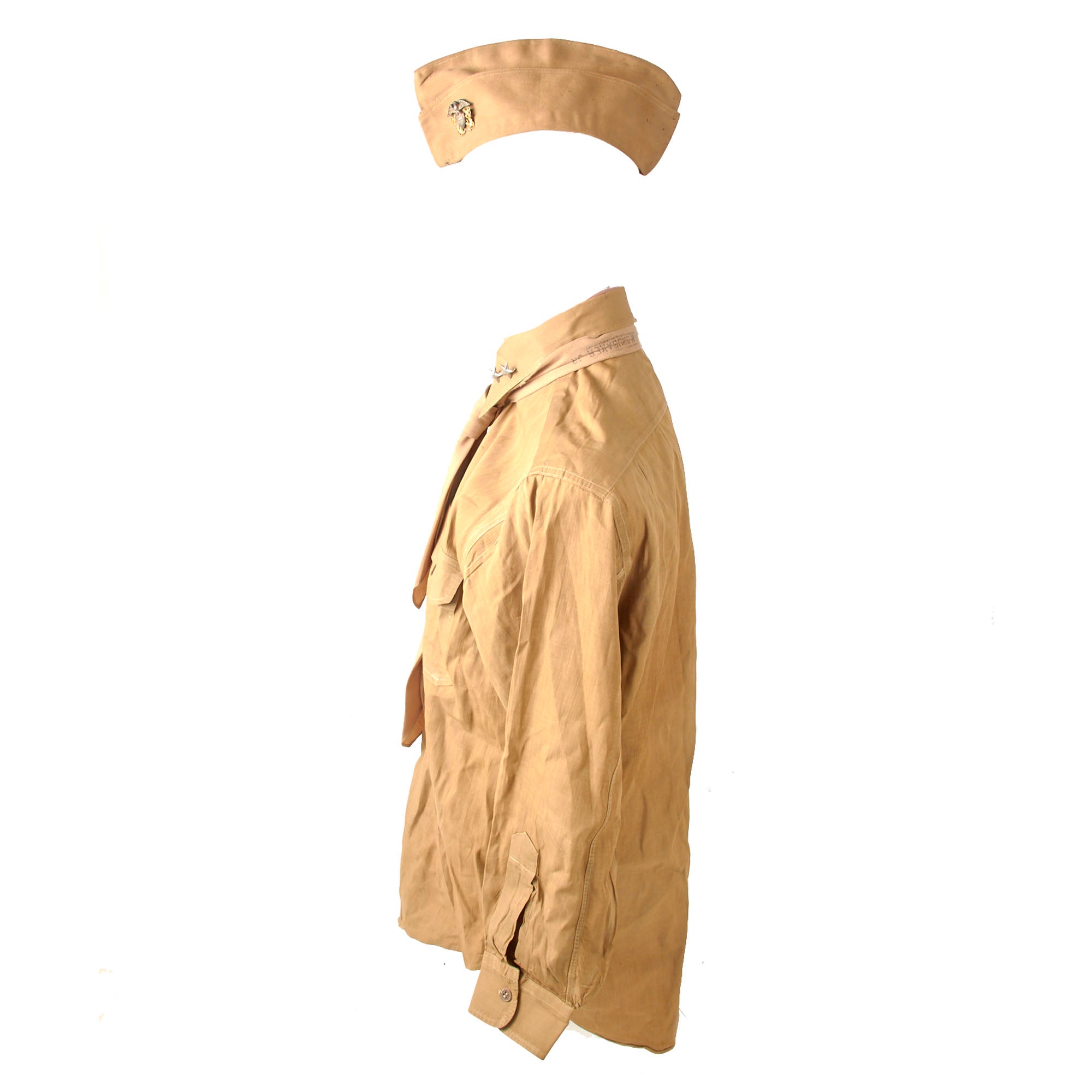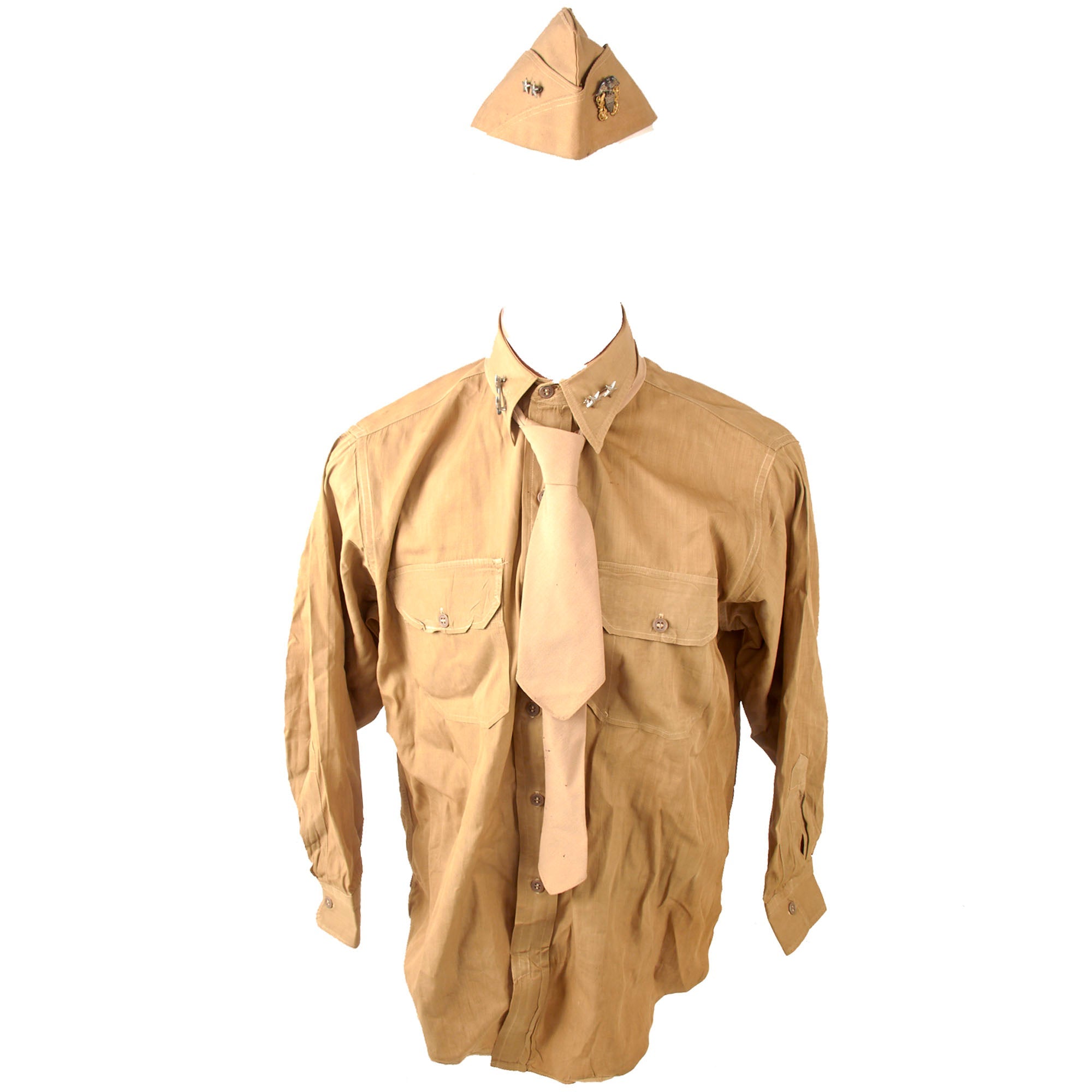 - The Tan Shirt and Garrison Cap with museum tag stating that Furlong’s family stated that these were worn by Admiral Furlong on December 7th, 1941. The shirt has a tag for Van Heussen and has Rear Admiral insignia on the collar, and the cap has an officer’s badge and Rear Admiral insignia. Also includes a Navy officer’s visor cap band with badge, and two neckties.